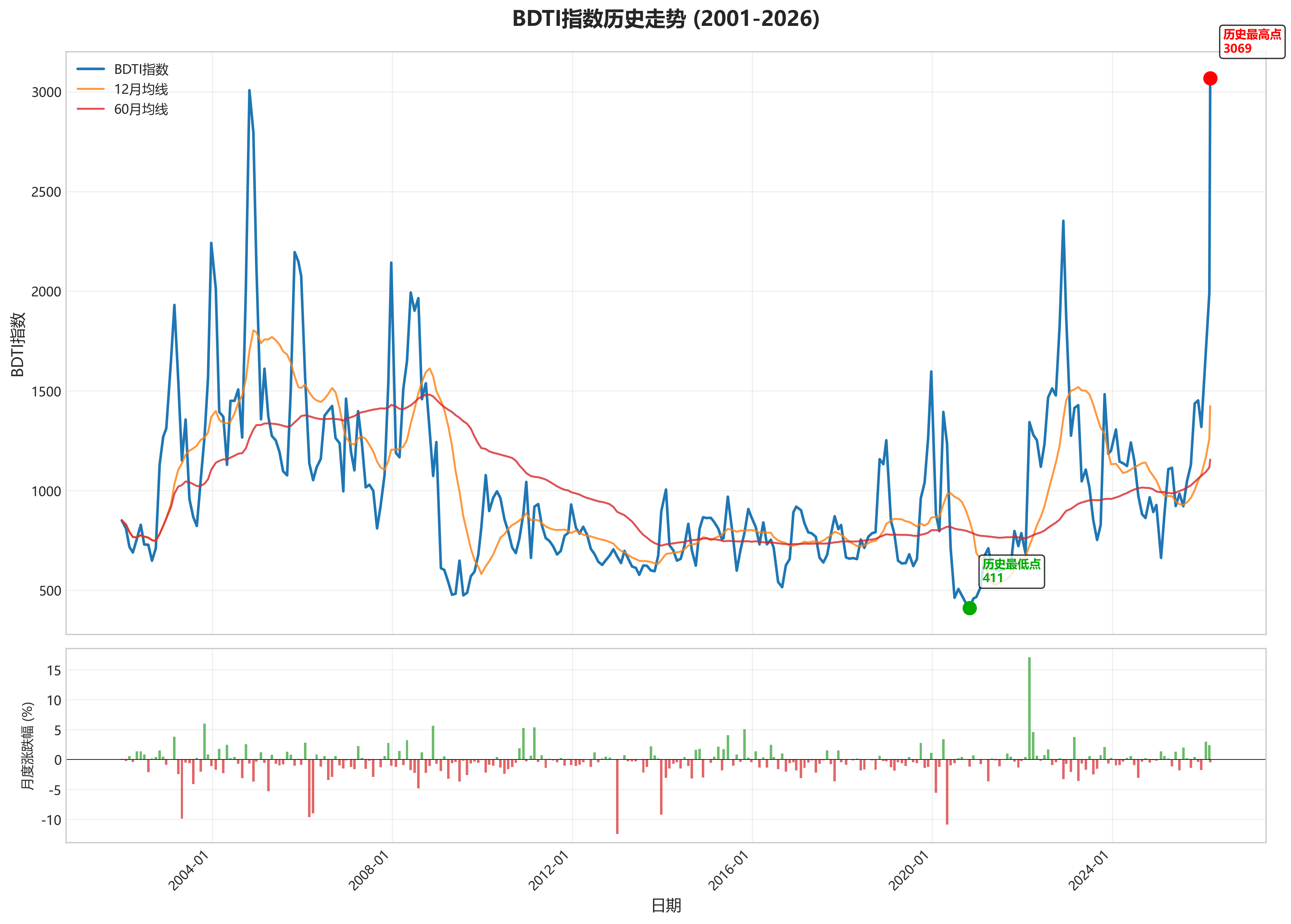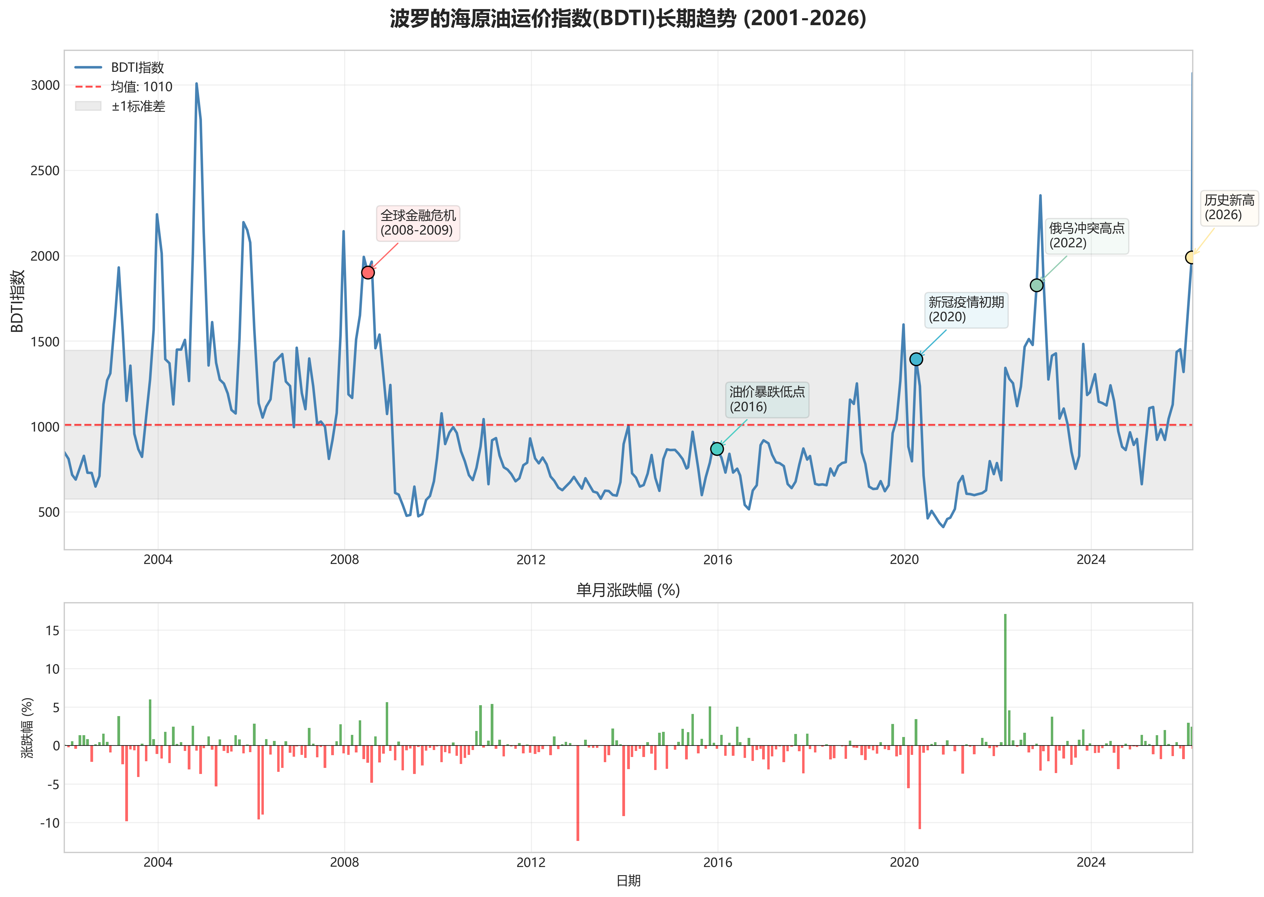 - 高位回落与震荡期(2023-2026初):指数从历史高点回落,进入高位宽幅震荡阶段,中枢仍在1000点以上,显著高于2010年代水平,反映地缘风险溢价和结构性贸易变化已成新常态。