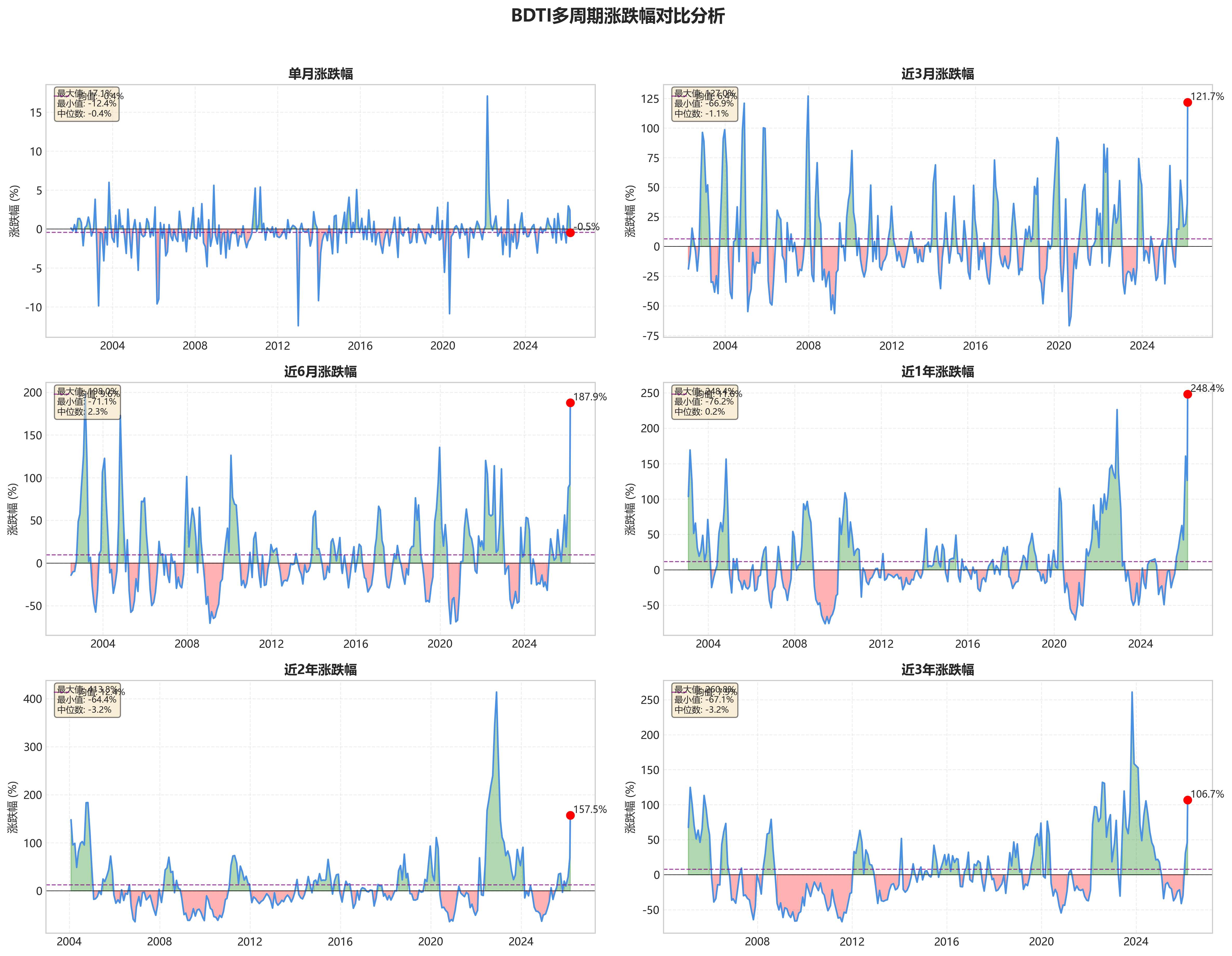 - 跨周期收益率比较:分析各期涨跌幅的波动范围,可见时间窗口越短,波动极值越大。例如,“近3月涨跌幅”极值范围(-66.9%至 +121.7%)远大于“近3年涨跌幅”(-61.0%至 +260.8%)。这表明BDTI受短期冲击(如地缘事件、季节性需求)影响剧烈,但长期趋势由更深层的供需基本面决定。