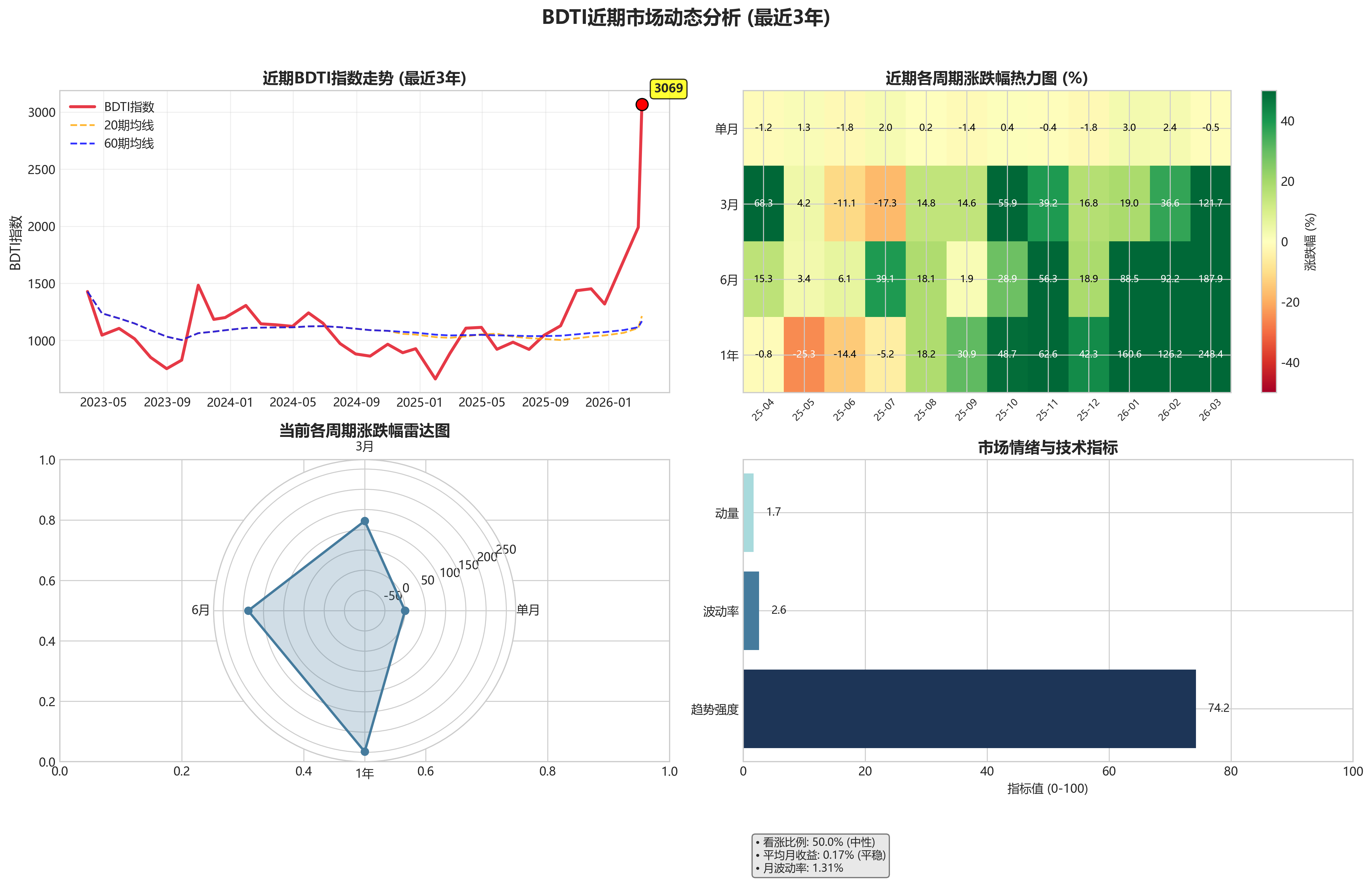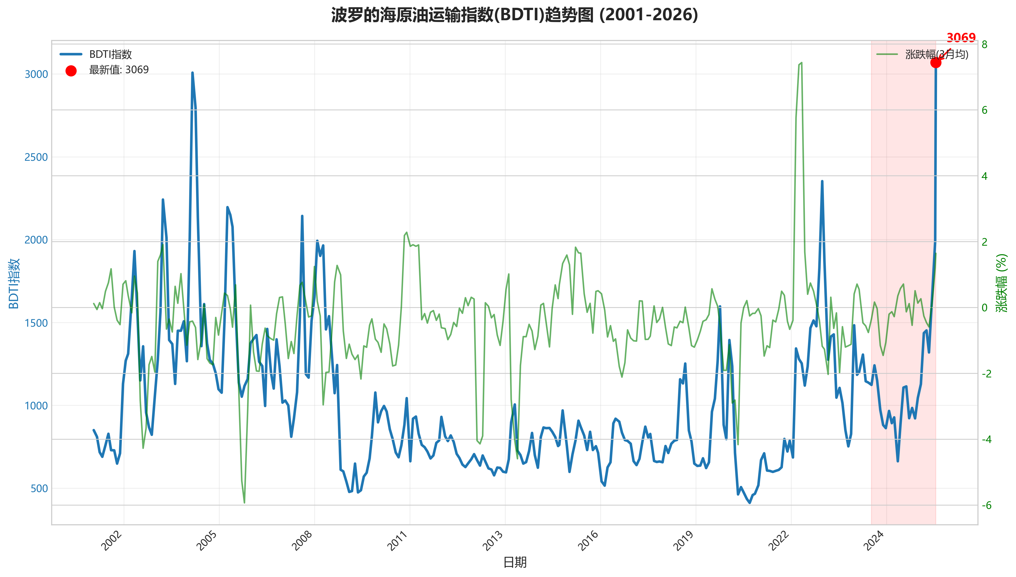 - 趋势对比:无论是短期(3个月、6个月)还是长期(1年、2年、3年),BDTI指数均呈现大幅上涨的格局,且近期(特别是近6个月)的上涨速度明显加快,显示出当前市场热度非常高。