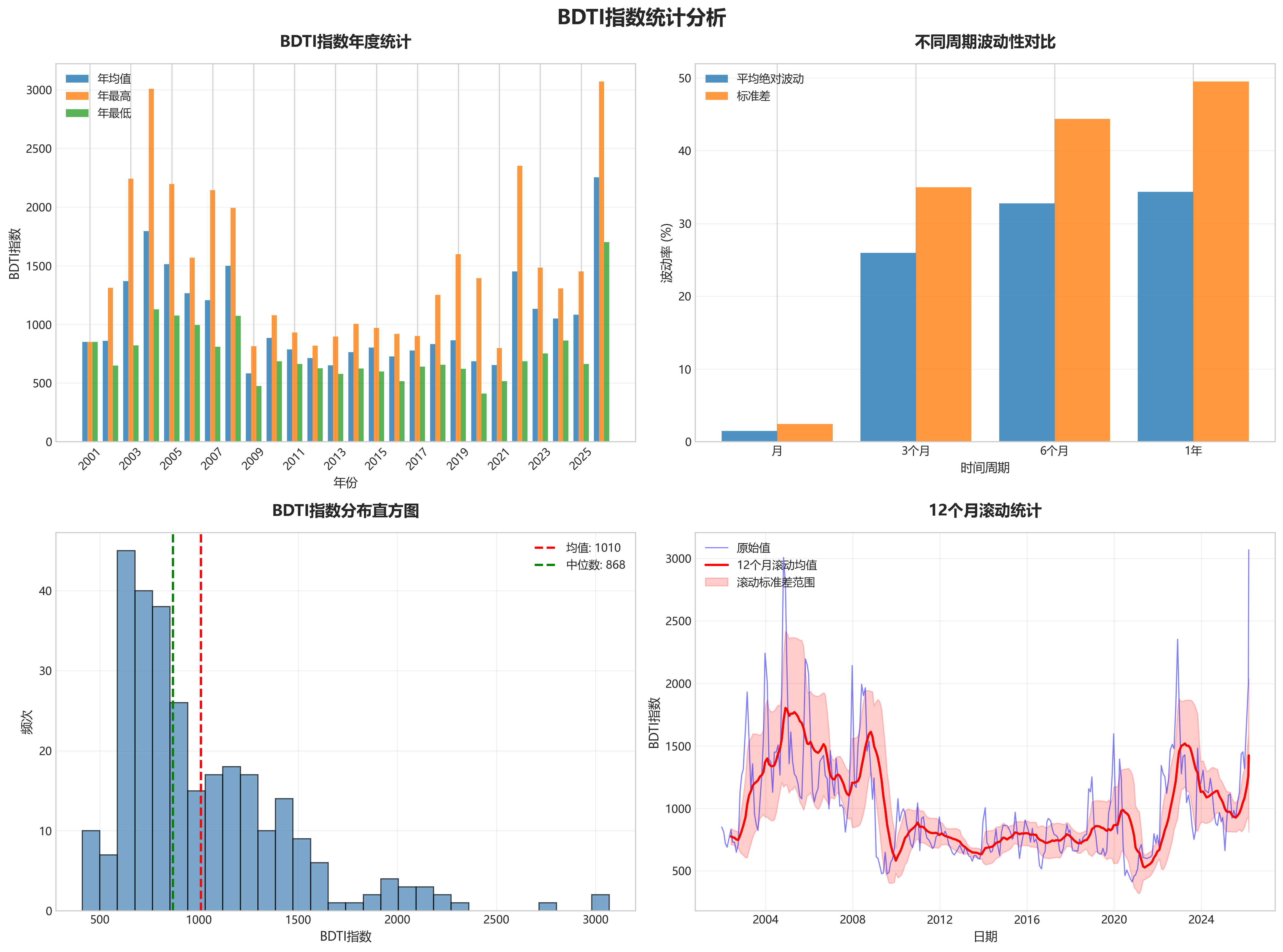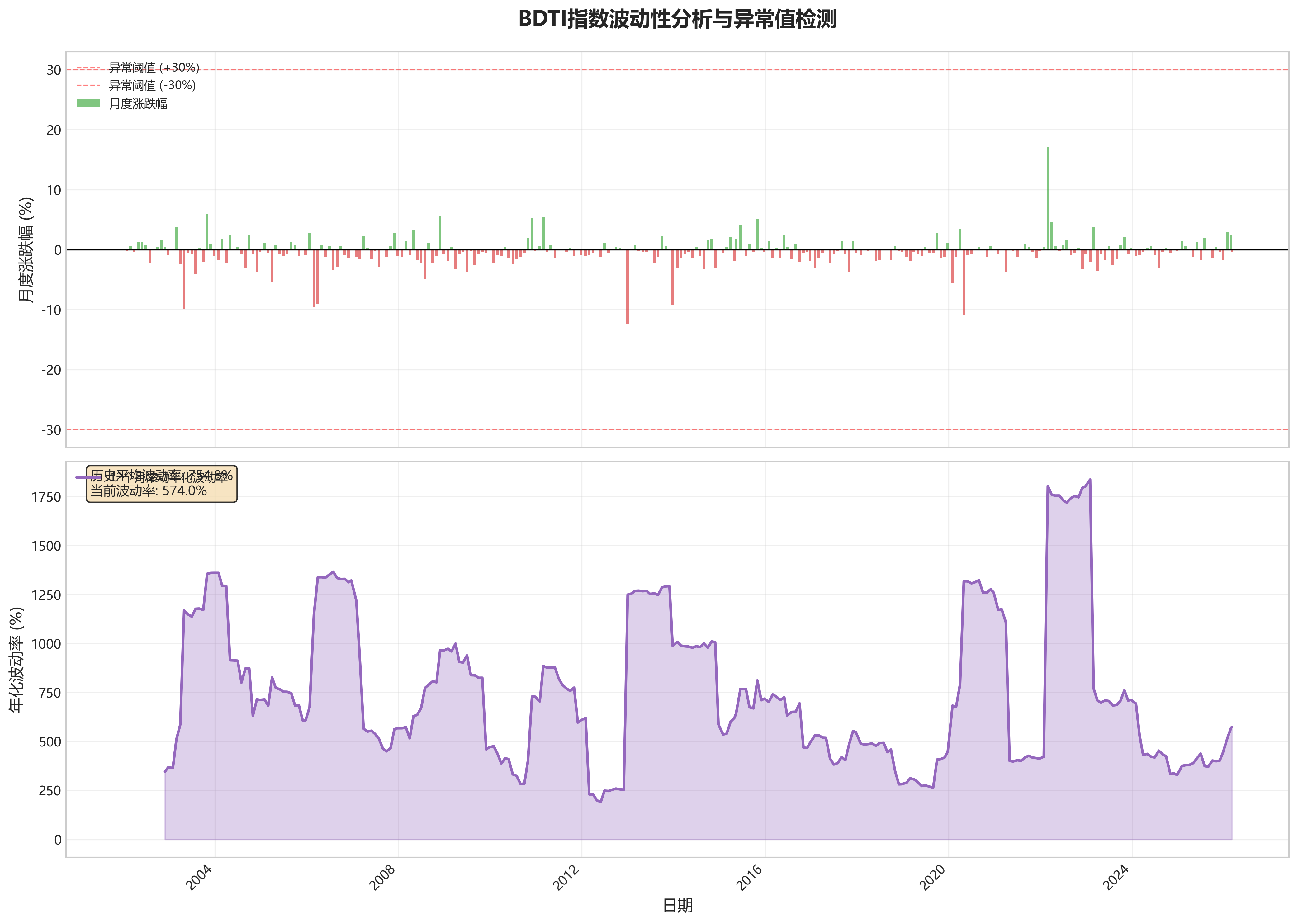 - 年化波动率:基于“最新值”对数收益率序列计算,BDTI指数的历史年化波动率约为 62.5%,属于极高波动性资产。