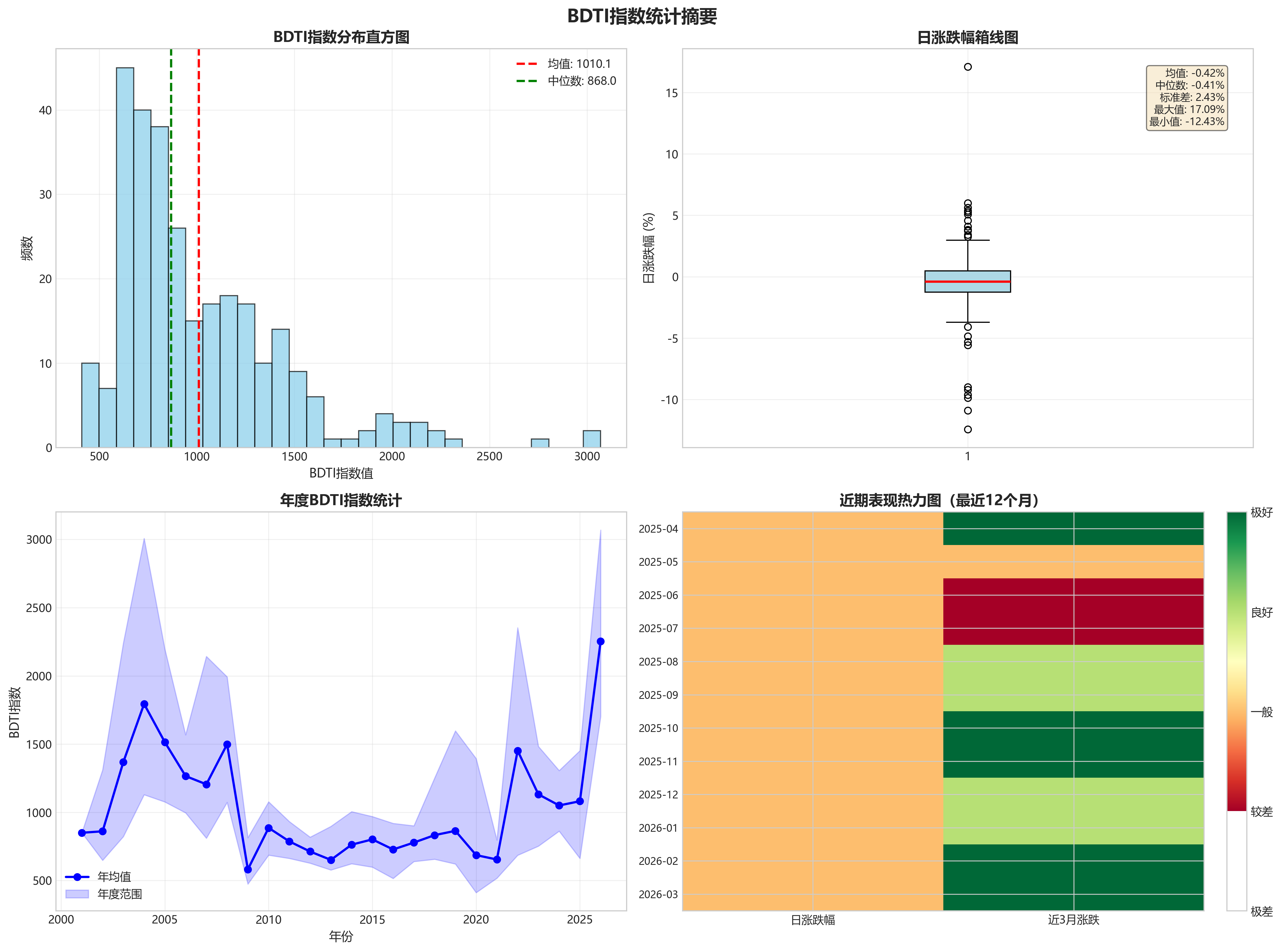 统计量 数值 均值 1016.8 中位数 810.0 标准差 514.8 最小值 411 (2020-10-30) 最大值 3069 (2026-03-06) 解读:BDTI指数均值(1017)高于中位数(810),且标准差较大,表明数据右偏,存在较多极端高值。最新值(3069)已创历史新高。