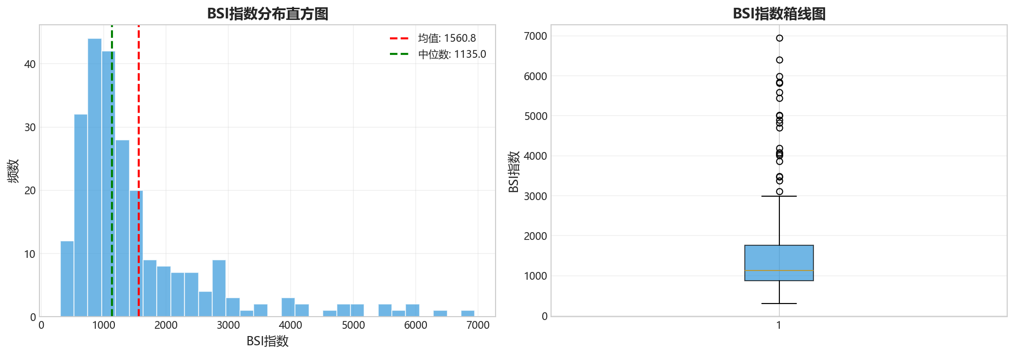 分布特征显示BSI指数呈现明显的尖峰厚尾分布,极端值出现频率较高,这与其受宏观经济周期影响较大的特性一致。