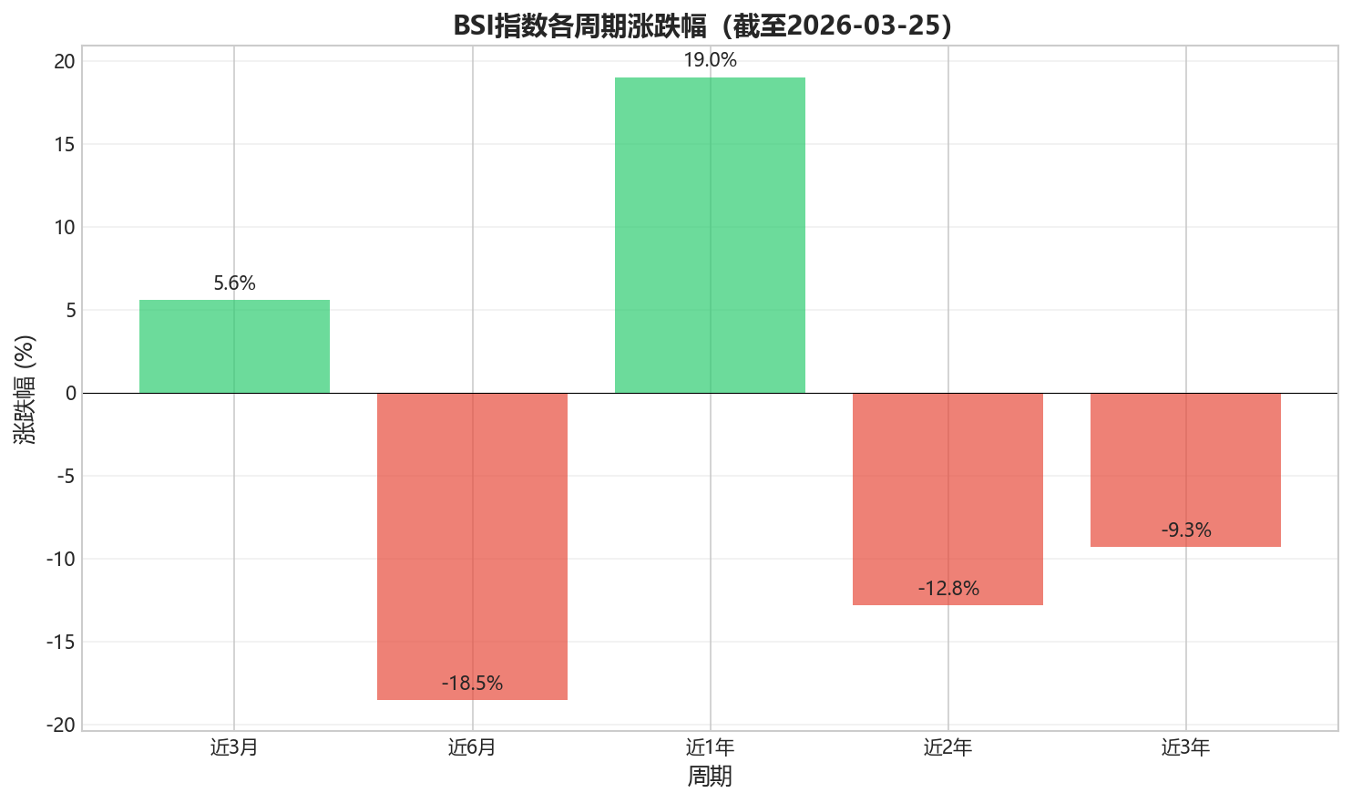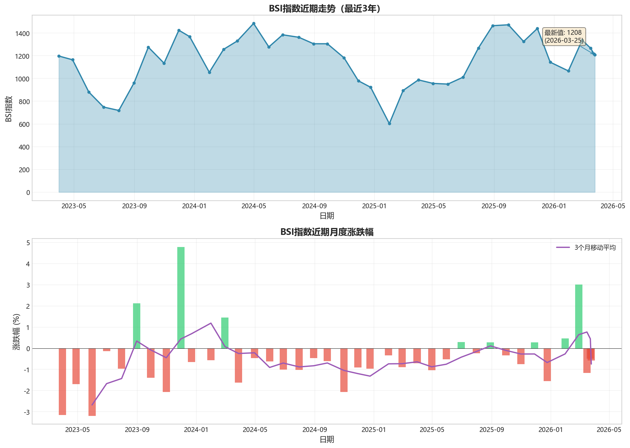 截至2026年3月25日,BSI指数最新值为1208点,处于历史中等偏低水平。近一年(2025年3月至2026年3月)指数从988点回升至1208点,涨幅约22%,显示市场有所回暖但仍处于相对疲软状态。