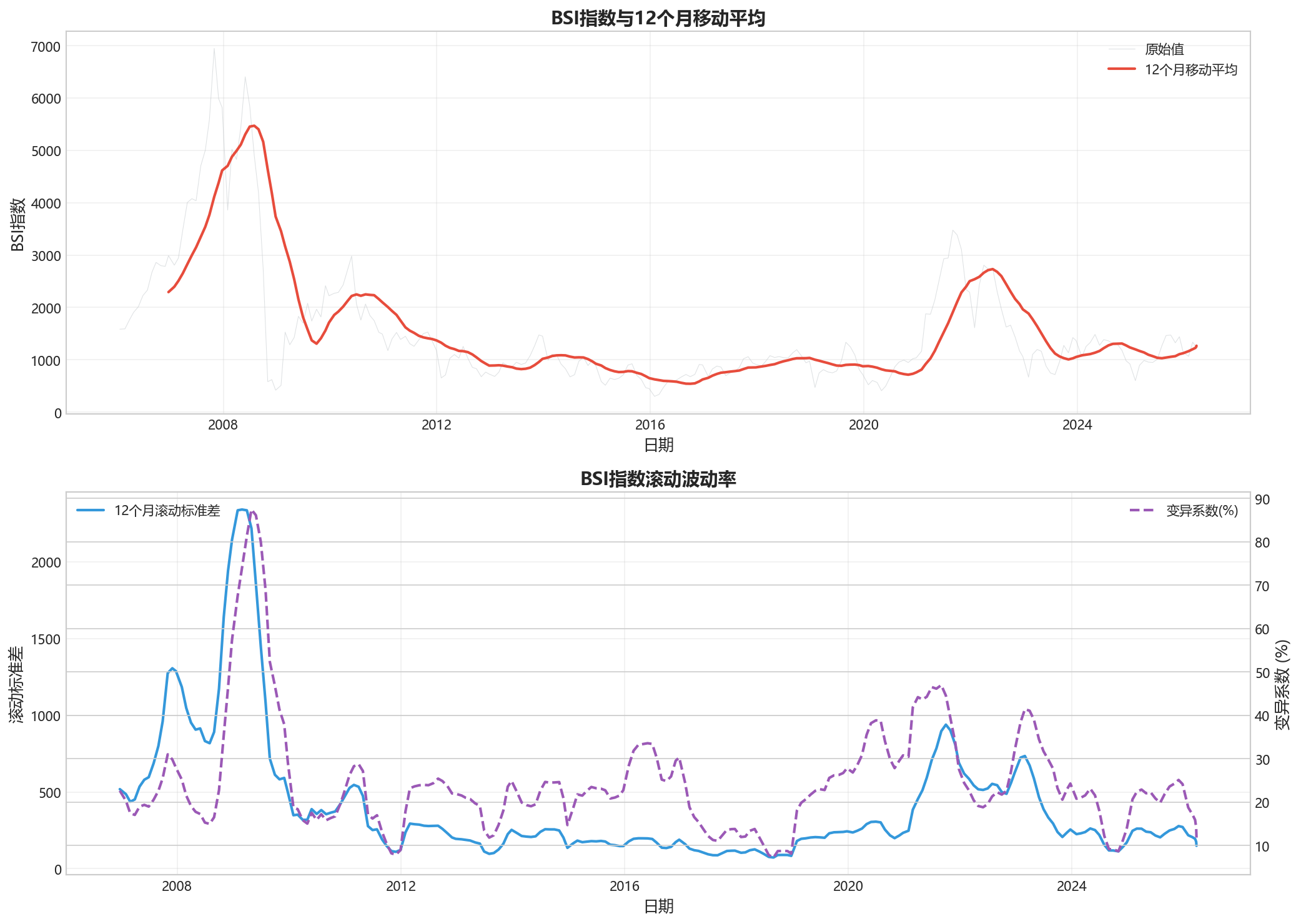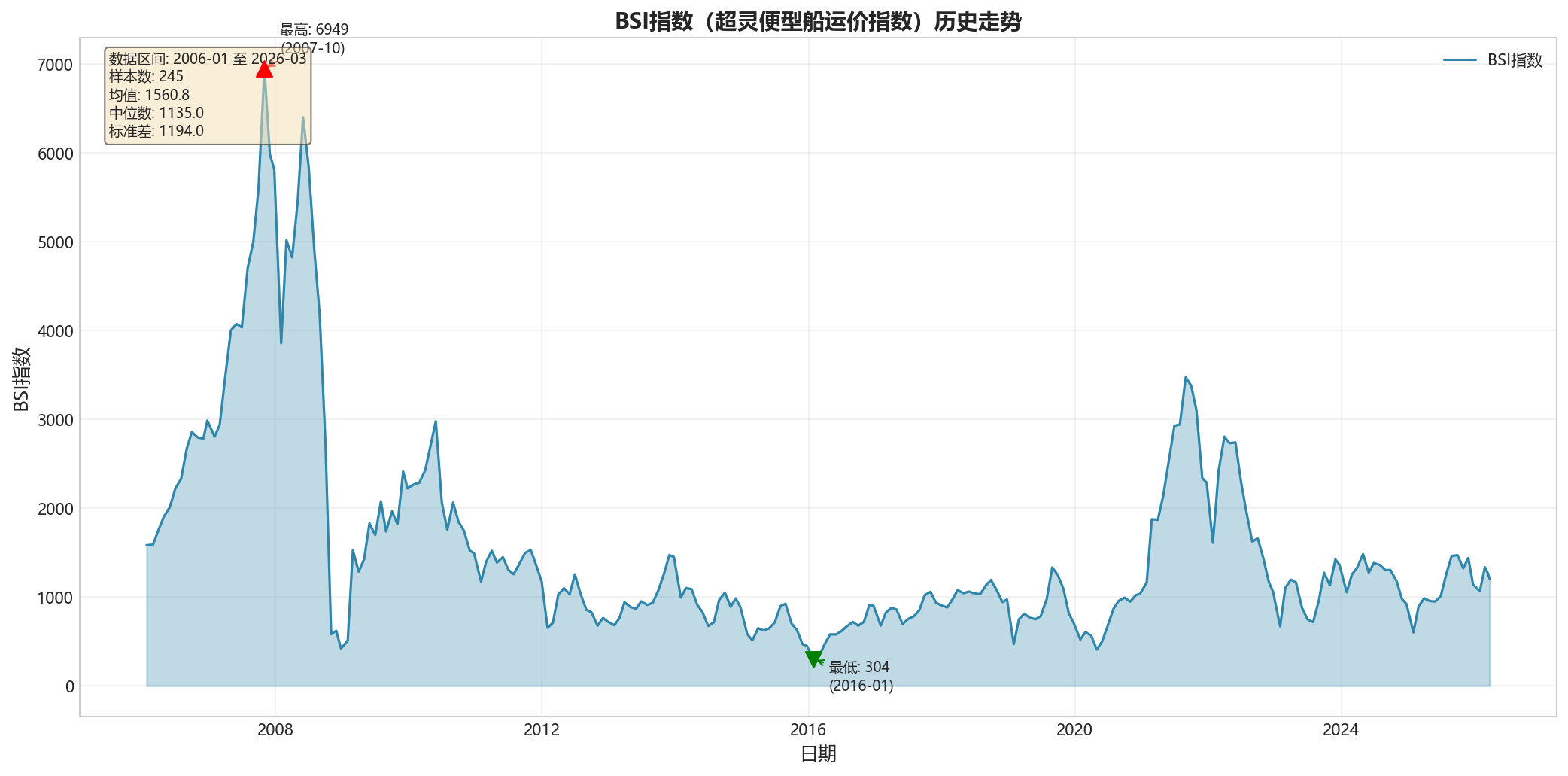 从2006年到2026年,BSI指数经历了多次大幅波动,整体呈现“剧烈震荡、底部逐步抬高”的特征: