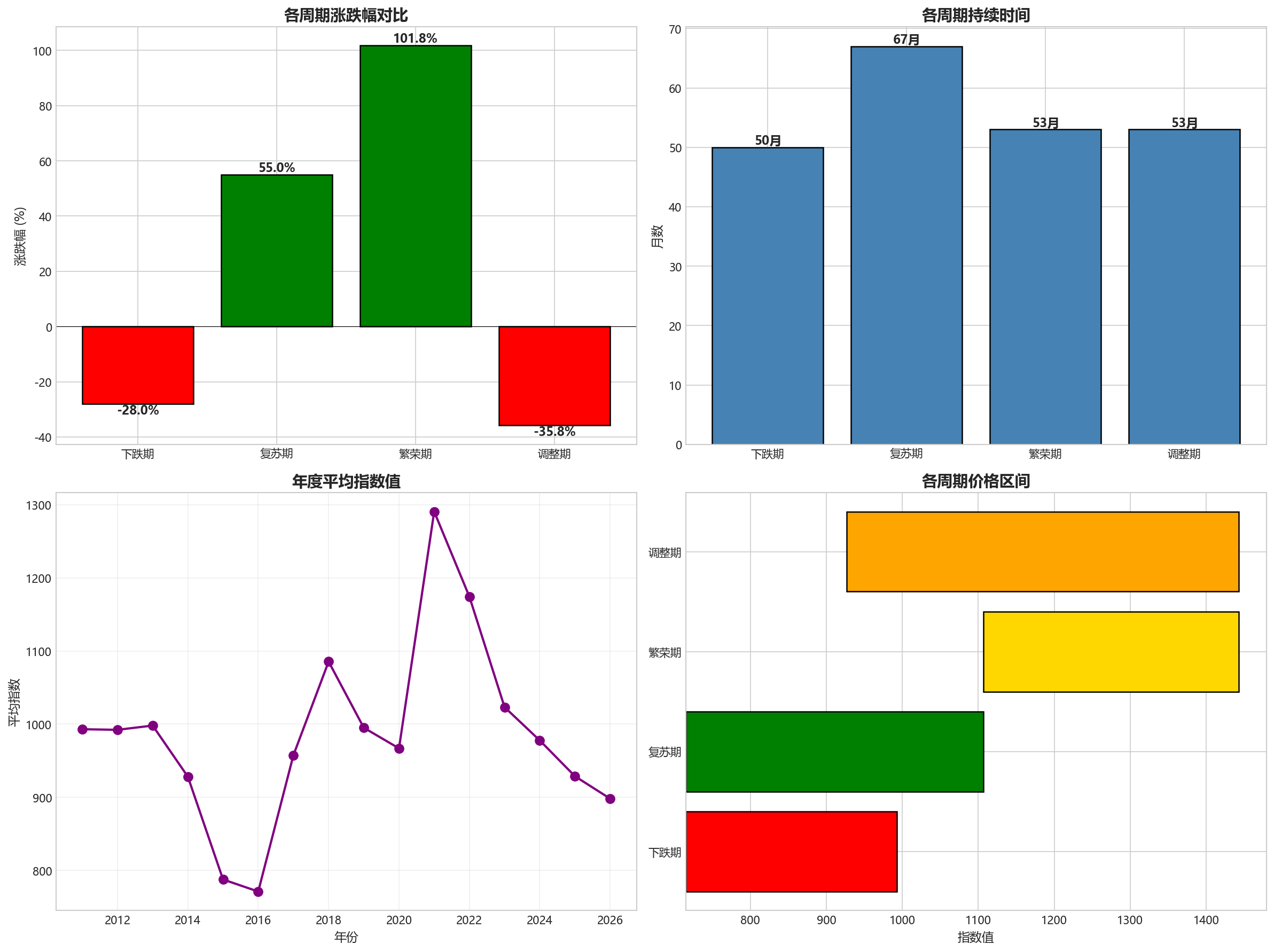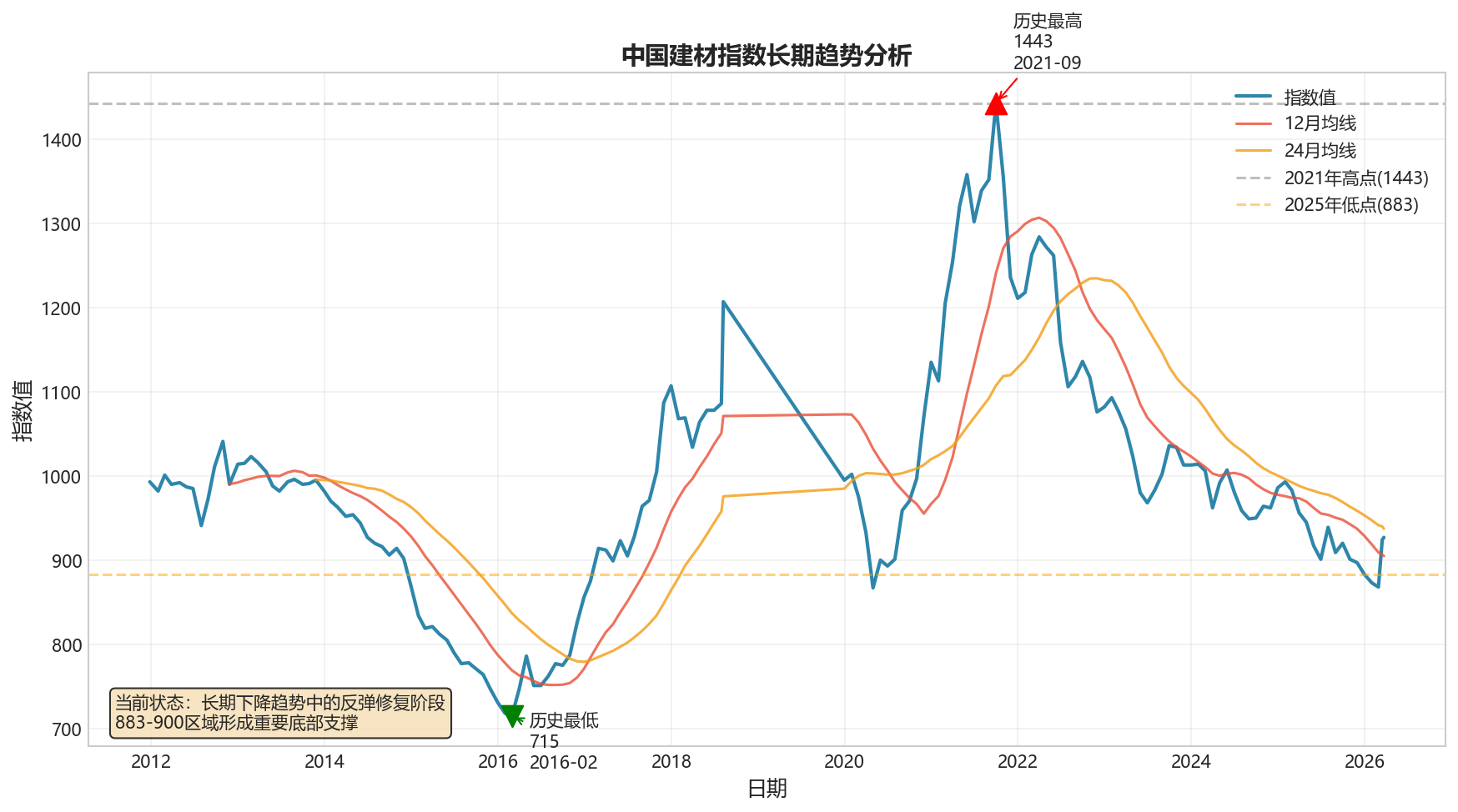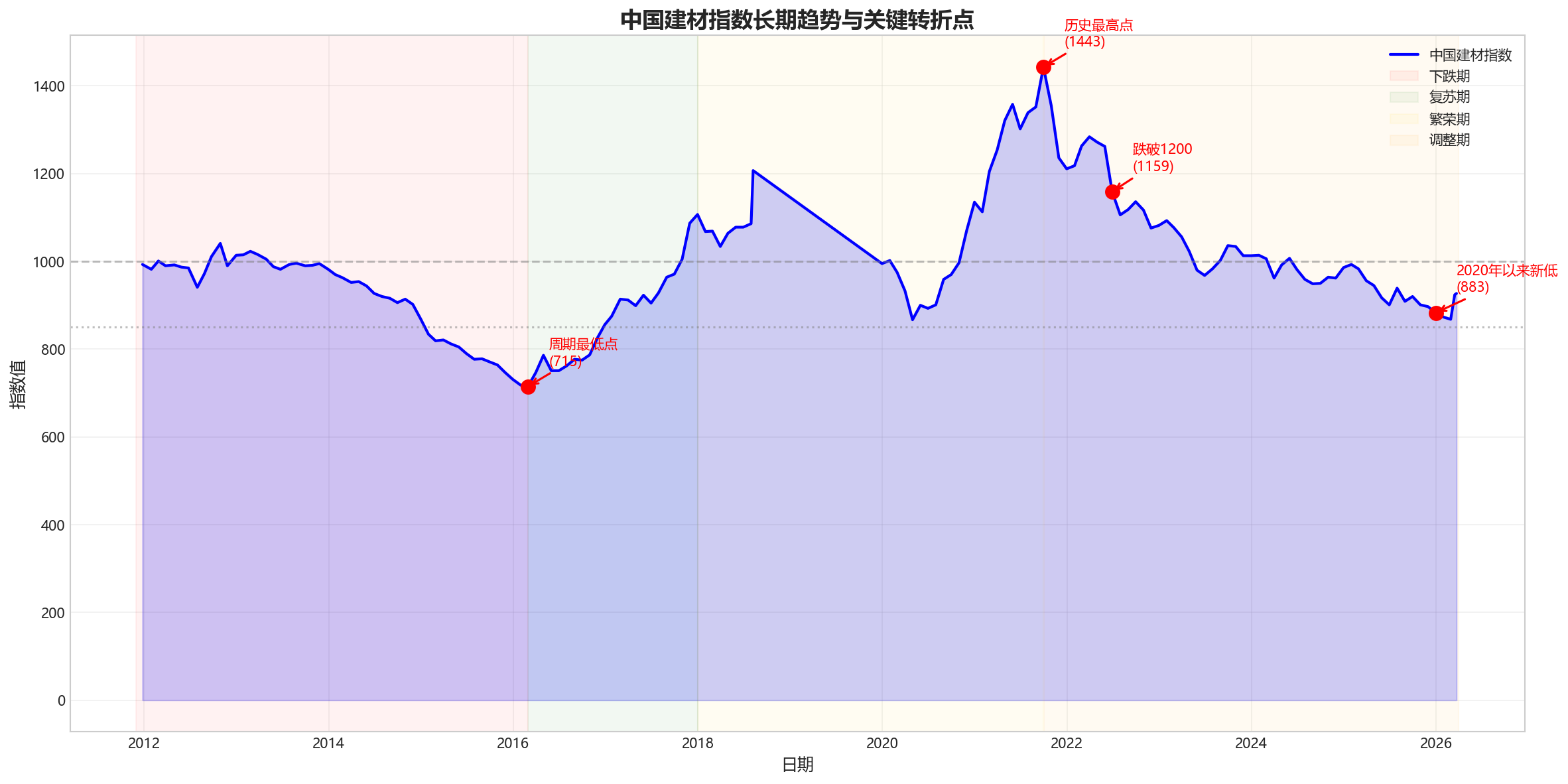中国建材指数在过去约14年的历史中呈现出明显的**“U型"复苏+高位回落**特征: