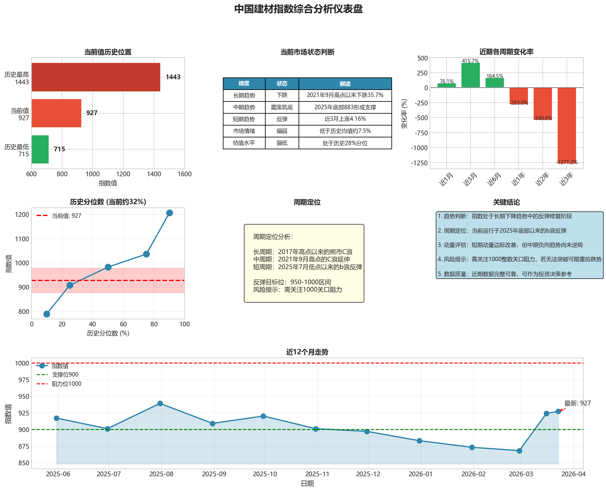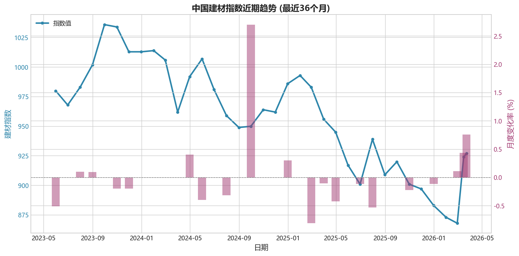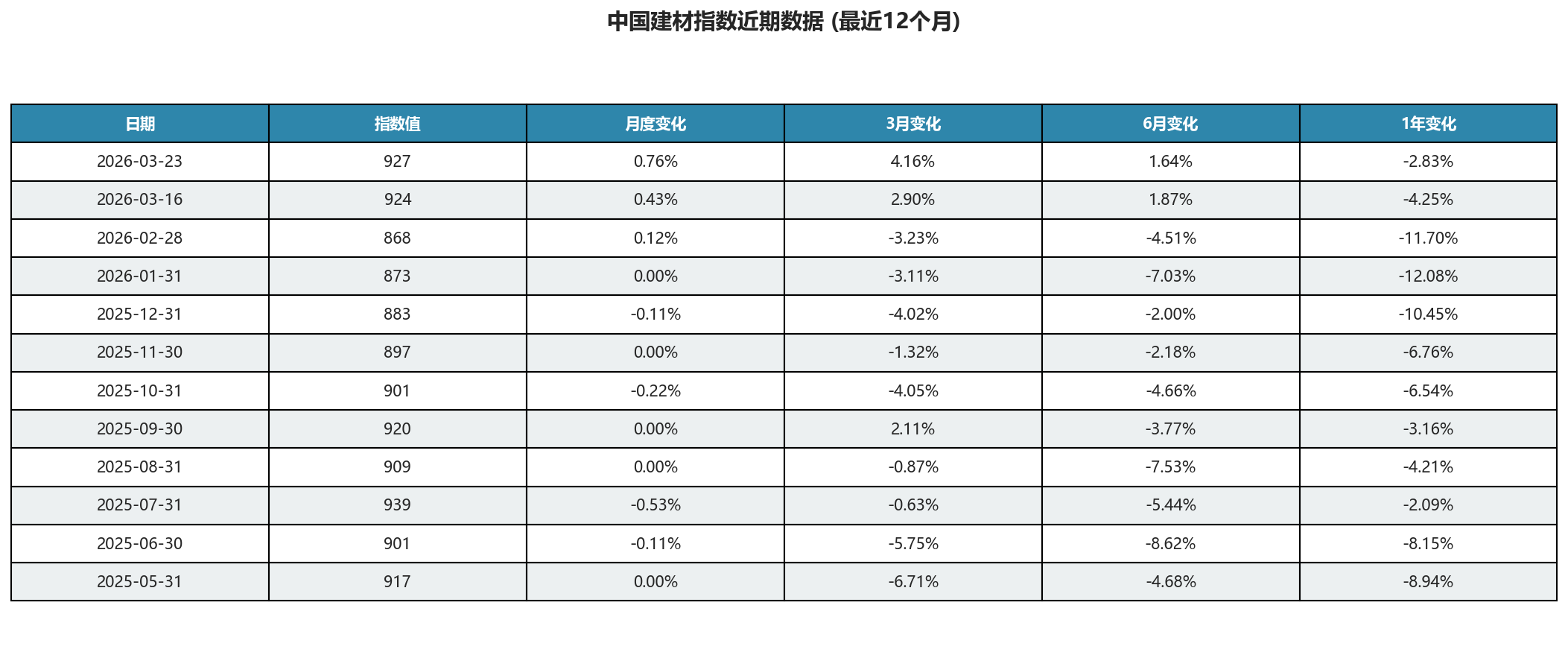 近三个月指数上涨4.16%,呈现回暖迹象。特别是2026年3月以来,指数从月初的924上升至927,显示建材市场信心有所恢复。