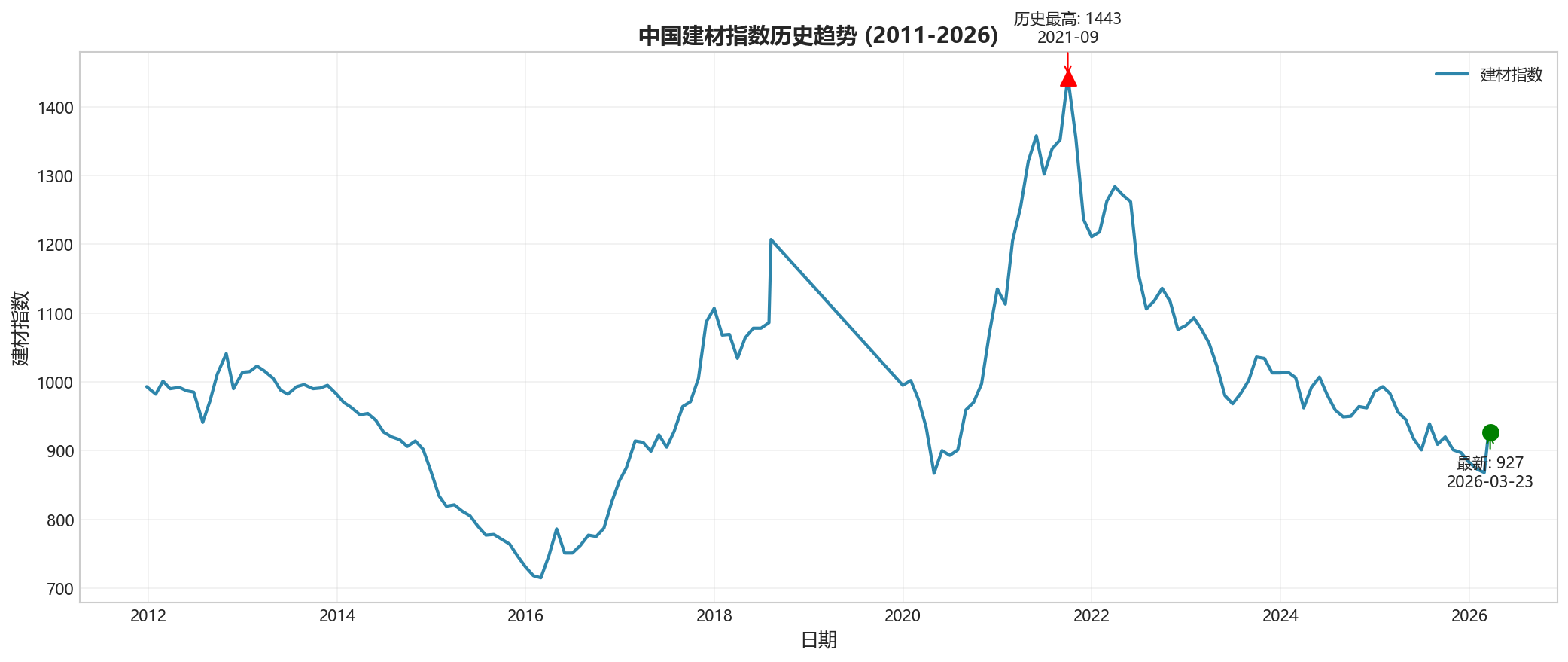 本数据记录了中国建材指数从2011年12月26日至2026年3月23日共158个月度数据点。该指数是衡量中国建筑材料行业景气程度的重要指标,指数高低直接反映了建筑市场的活跃程度。