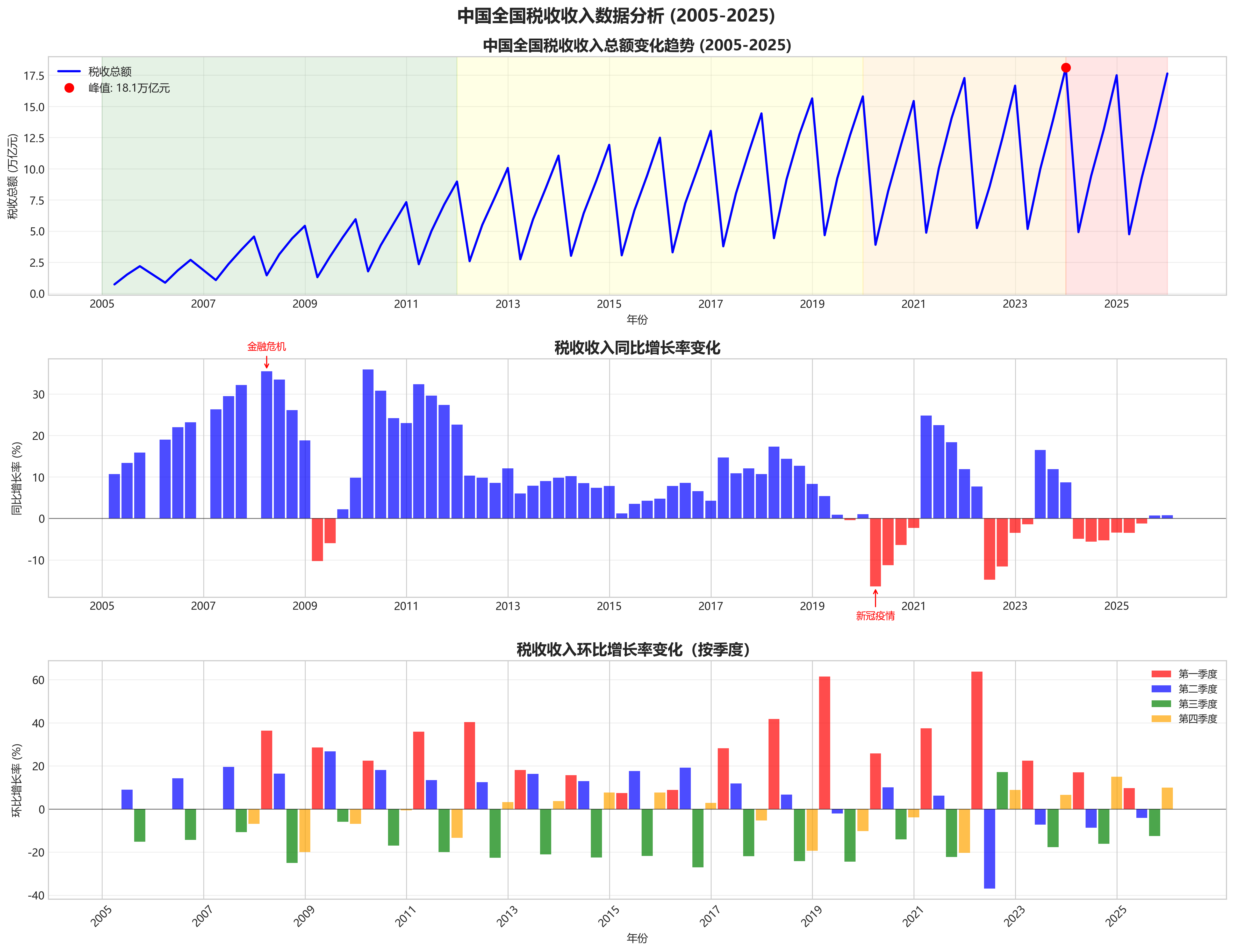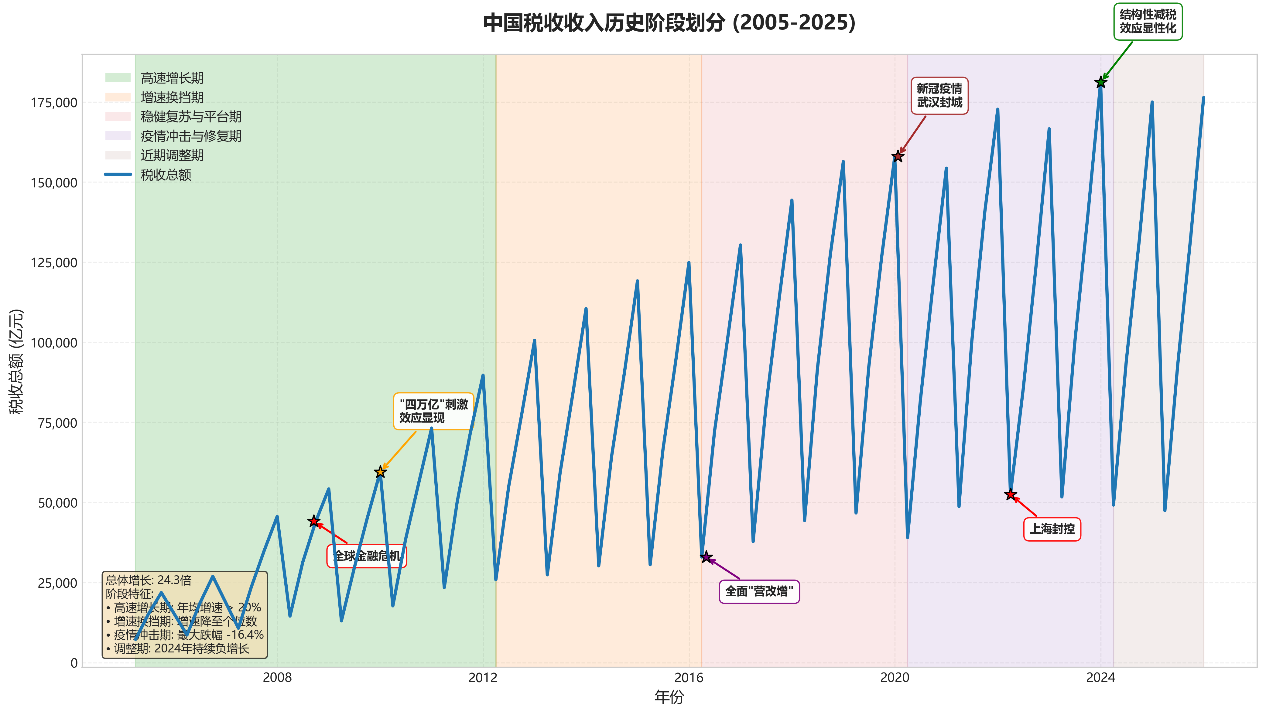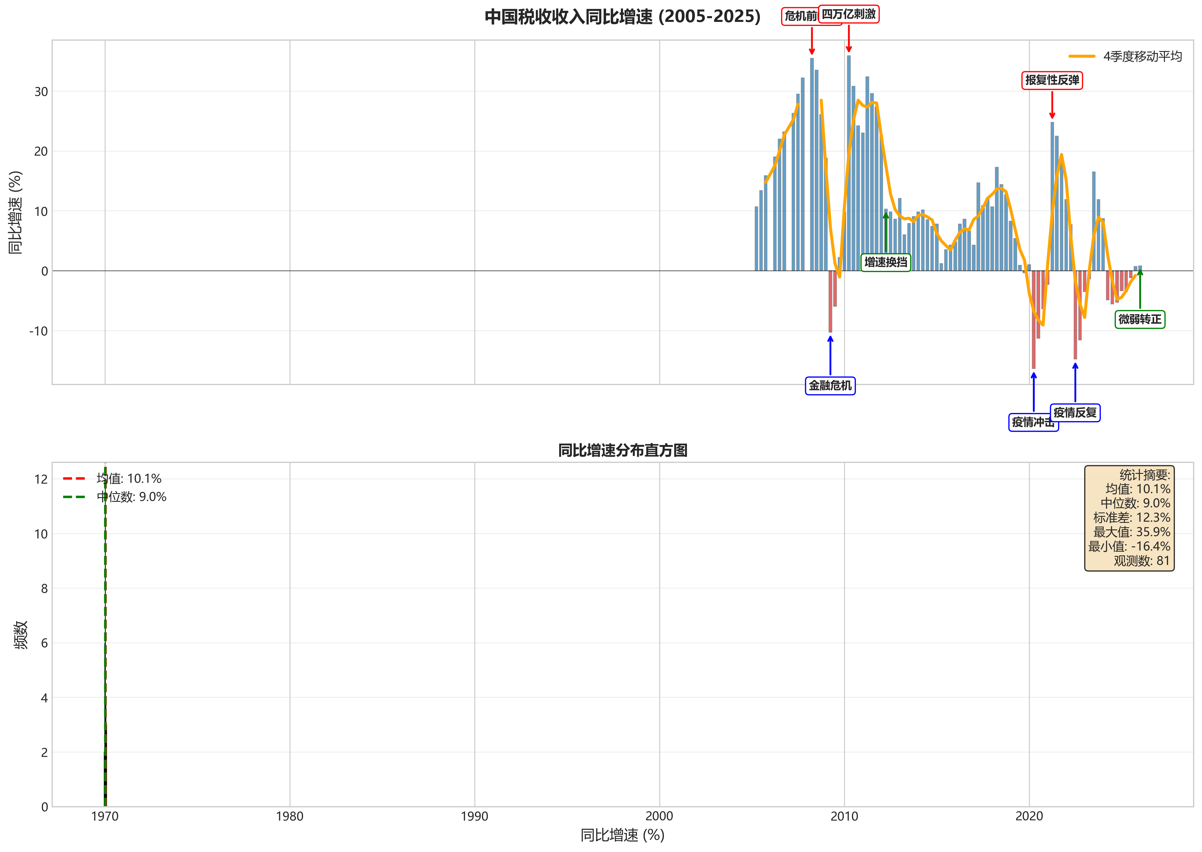 - 疫情冲击与修复期 (2020-2025):2020年上半年受新冠疫情冲击,税收大幅负增长(Q1为-16.4%)。随后在强力政策刺激下,2021年出现报复性反弹(Q1达24.8%)。2022年受疫情反复、地产下行等影响再度转负。2023年恢复正增长,但2024年又现负增长,2025年末微弱转正,显示复苏基础不牢,增长动能切换。