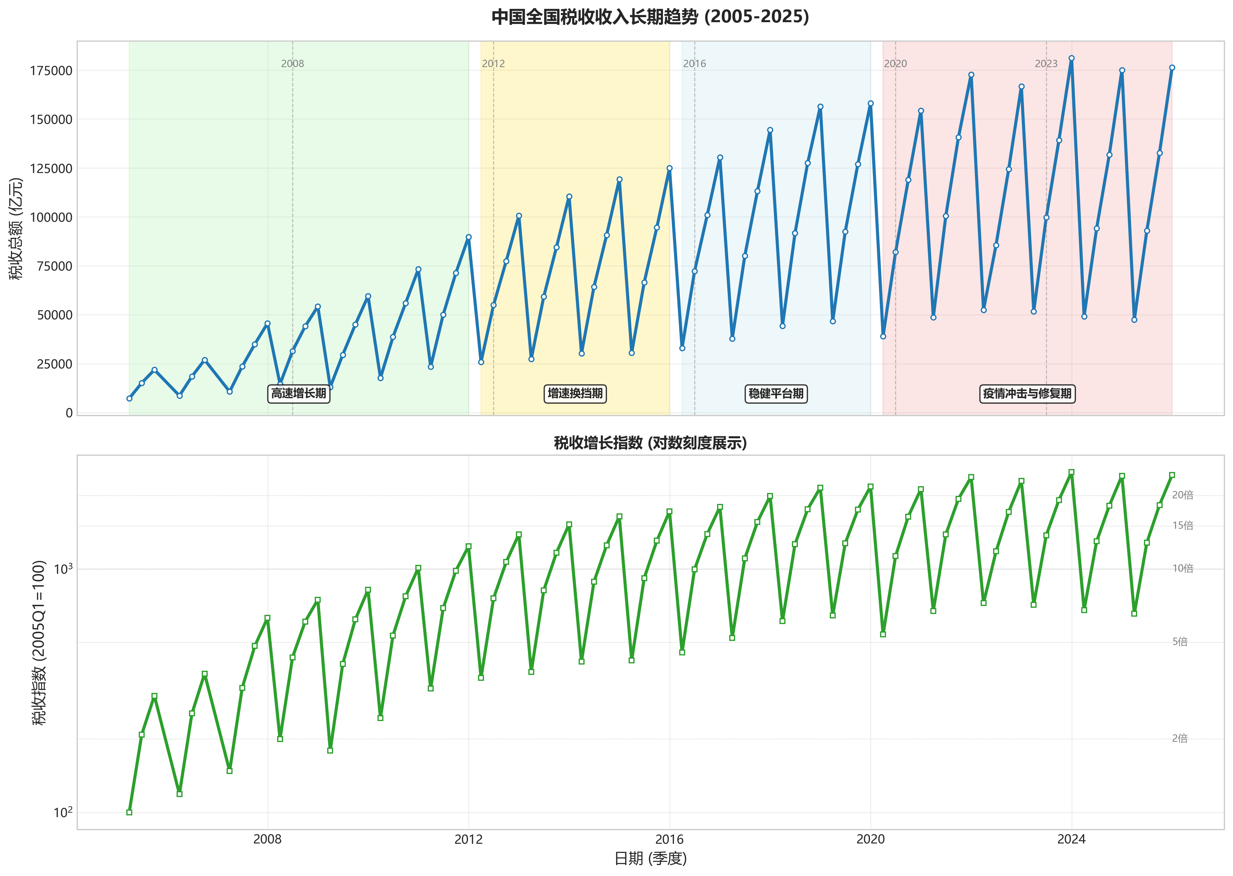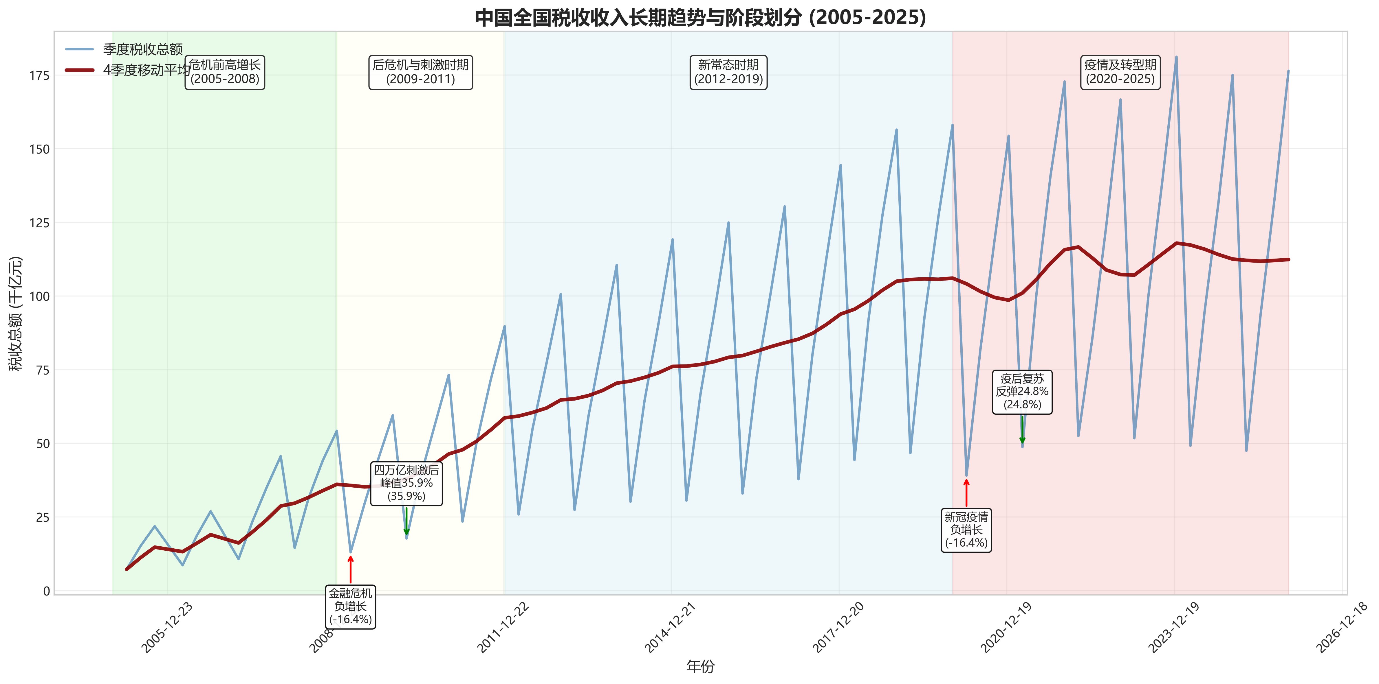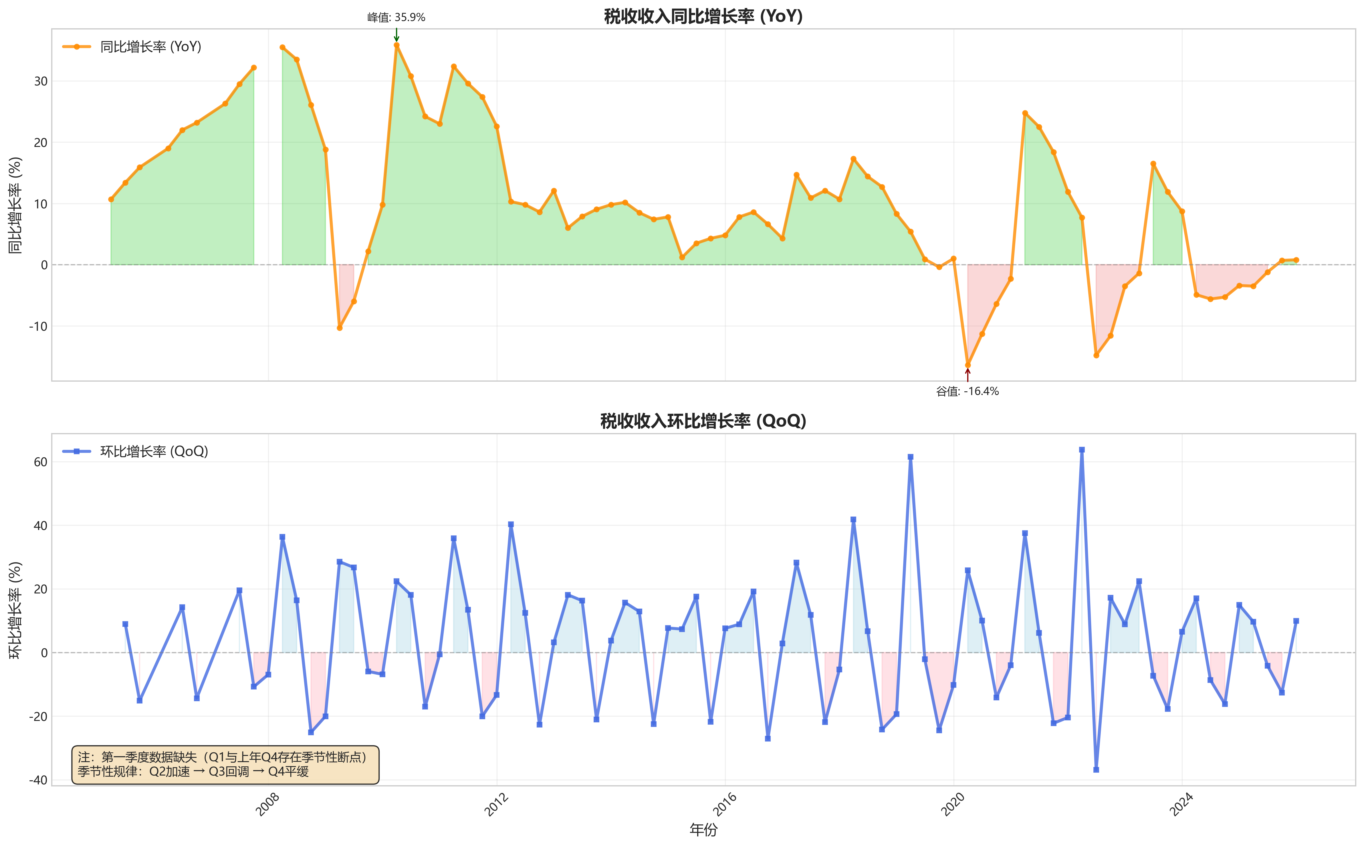 - 疫情冲击与修复期 (2020-2025):2020年上半年受新冠疫情冲击,税收大幅负增长(Q1为-16.4%)。随后在强力政策刺激下,2021年出现报复性反弹(Q1达24.8%)。2022年受疫情反复、地产下行等影响再度转负。2023年恢复正增长,但2024年又现负增长,2025年末微弱转正,显示复苏基础不牢,增长动能切换。