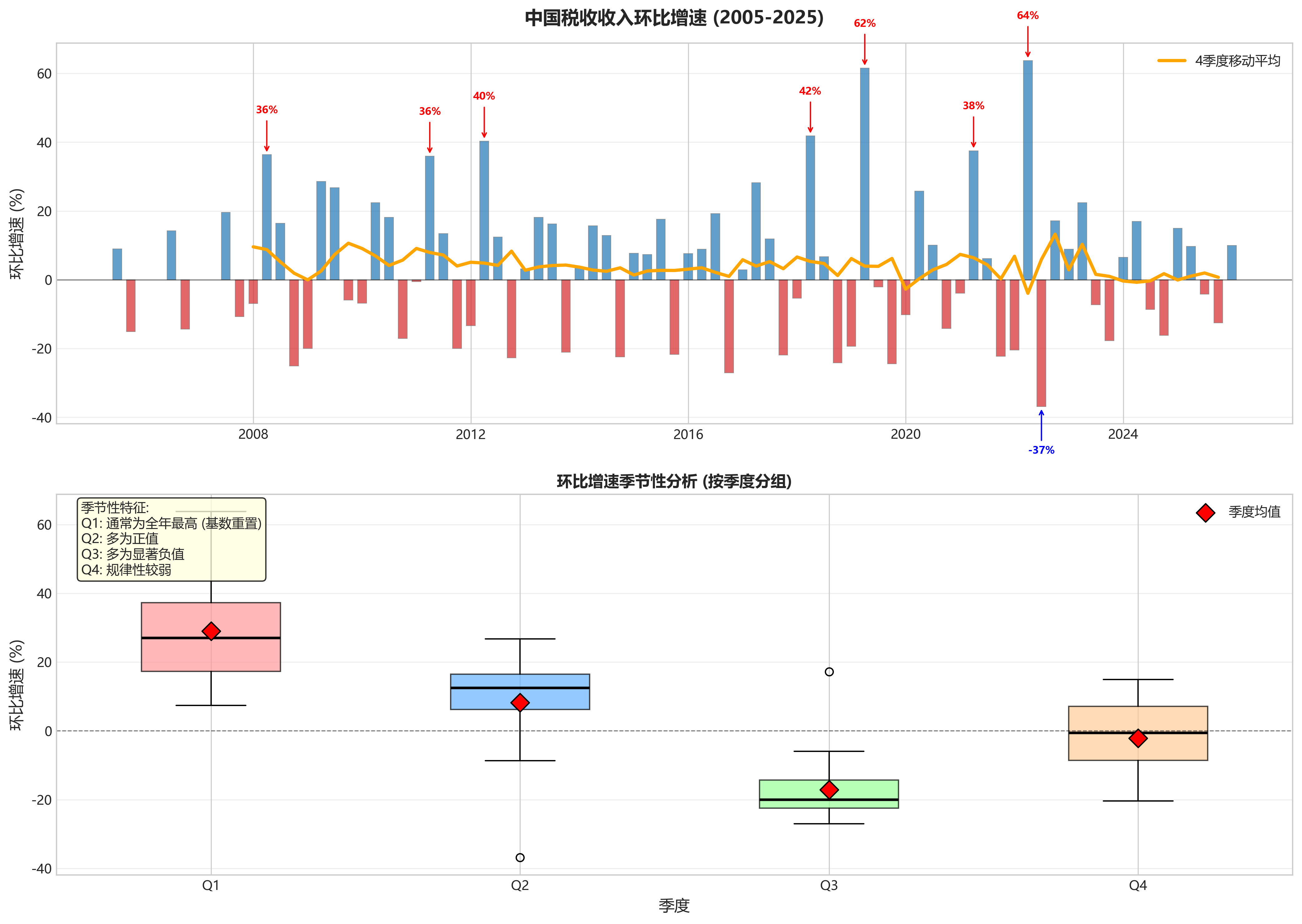 qoq_growth呈现显著的、不规则的季节性波动。通常第一季度环比增速极高(因从上一年第四季度的基数“重置”并开始新的累计),第二季度环比多为正,第三季度环比多为显著负值(可能与季节性征管、企业利润结算周期有关),第四季度环比有正有负,规律性较弱。这种模式反映了税收作为季度累计数据的统计特征。 - 异常波动:短期环比波动时常放大宏观冲击,如2022年Q1环比高达63.8%(可能包含缓税入库等特殊因素),紧接着Q2环比暴跌-36.9%,显示了极端的内外部冲击带来的巨大扰动。