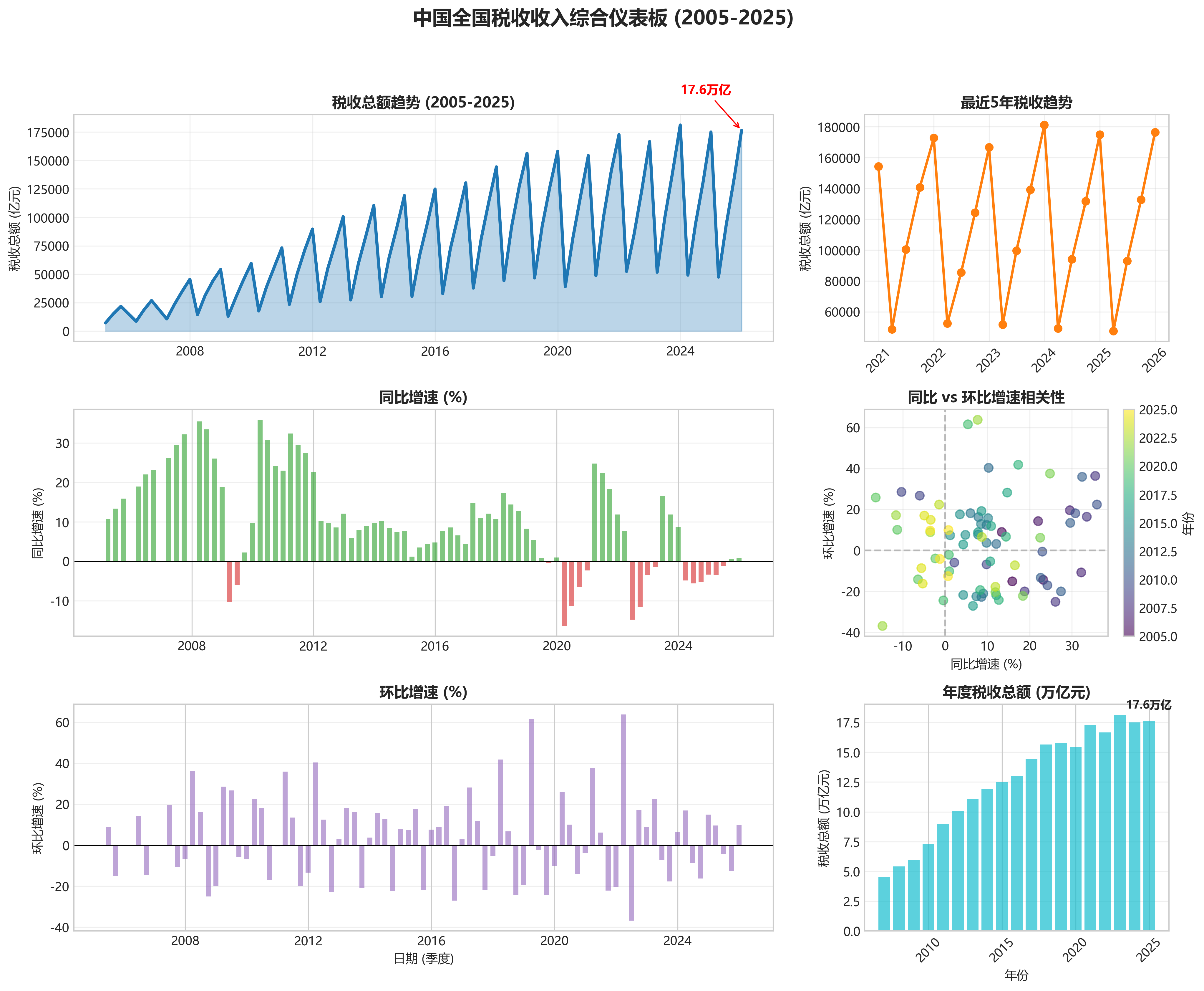 - 高波动性特征:税收增速对经济周期和外部冲击(金融危机、疫情)极为敏感,波动剧烈,反映出作为流量收入的固有属性和中国经济结构的调整阵痛。