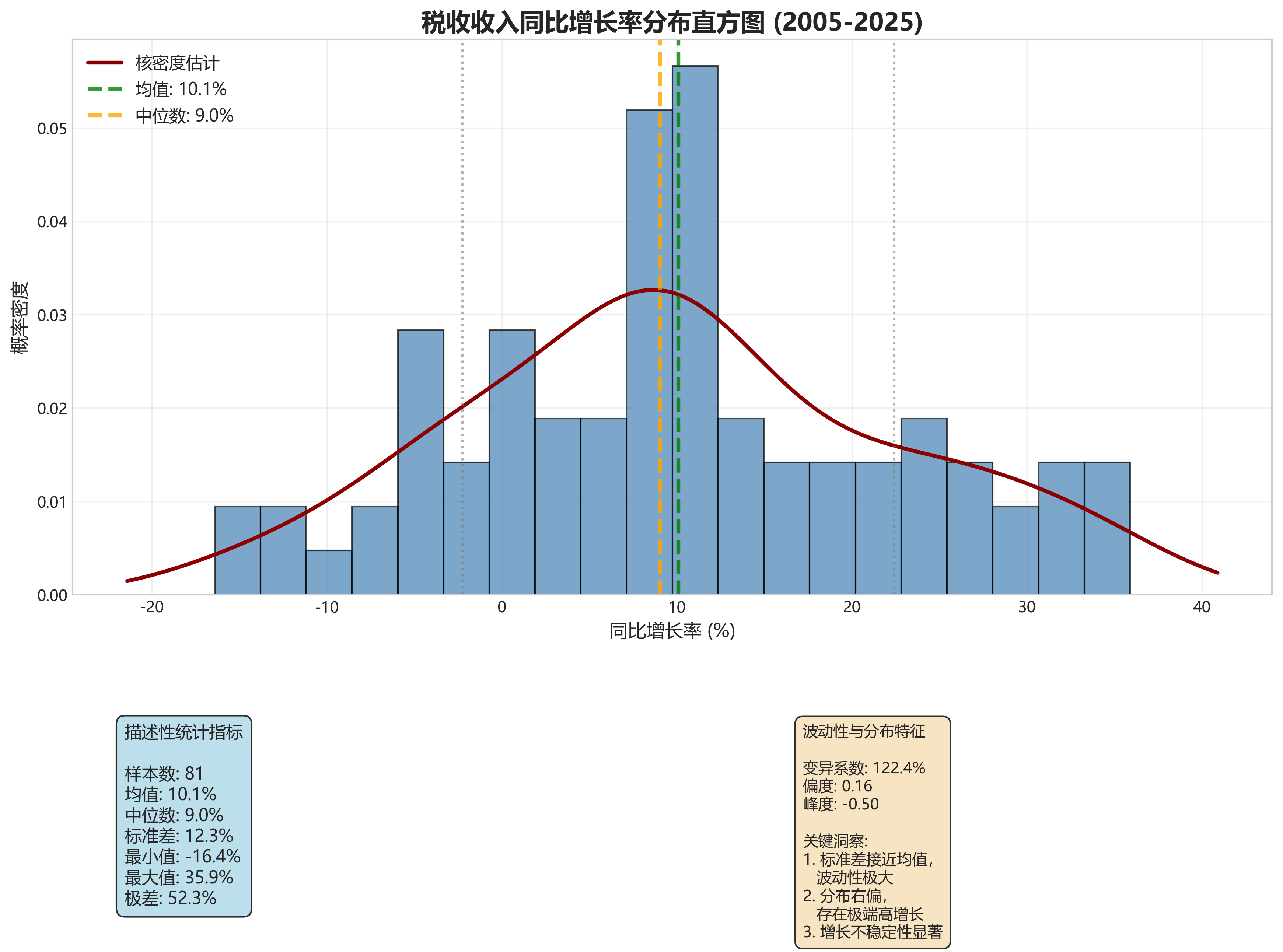 yoy_growth):标准差达11.5个百分点,极差高达52.3个百分点(-16.4% 至 35.9%),表明中国税收收入的年度增长具有较高的不稳定性,对经济周期和政策冲击极为敏感。 - 环比波动 (