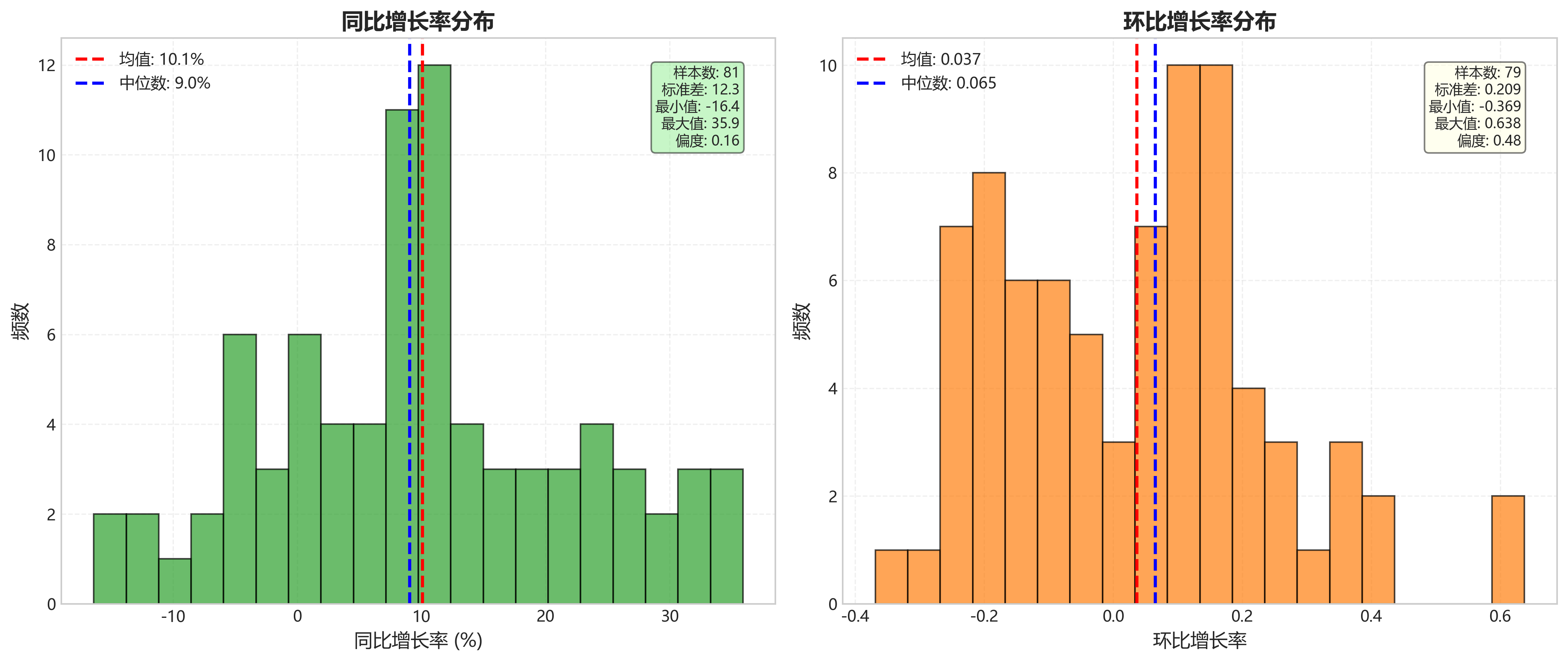 - 增速特征:同比增速均值10.1%,但标准差高达10.8个百分点,波动性显著。环比增速均值接近零,符合季度累计值在年内“前低后高”再重置的规律,其波动(标准差0.19)反映了季度间的剧烈变化。