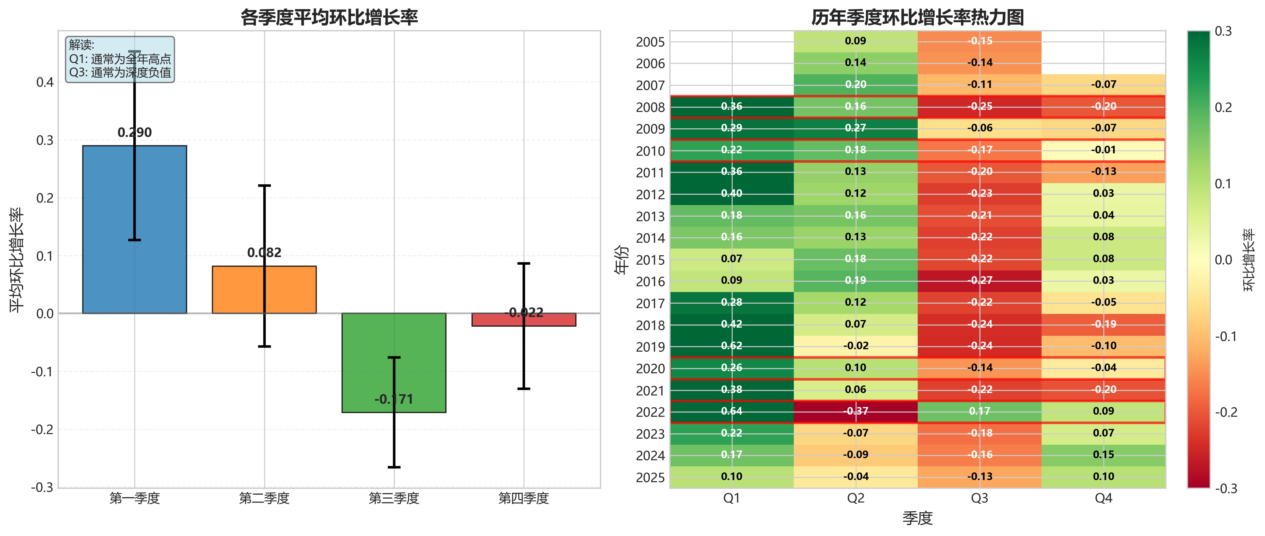 qoq_growth强度变化,通常会领先影响后续的yoy_growth趋势。例如,2021年各季度强劲的环比增长(Q1达0.38)支撑了全年高同比增速;而2024年持续疲弱的环比,直接导致了同比负增长的延续。 - 基数效应:异常的环比值会通过基数效应强烈影响下一年的同比增速。如2022年第二季度环比暴跌(-0.37),导致2023年第二季度同比基数极低,从而实现了16.5%的高增长。