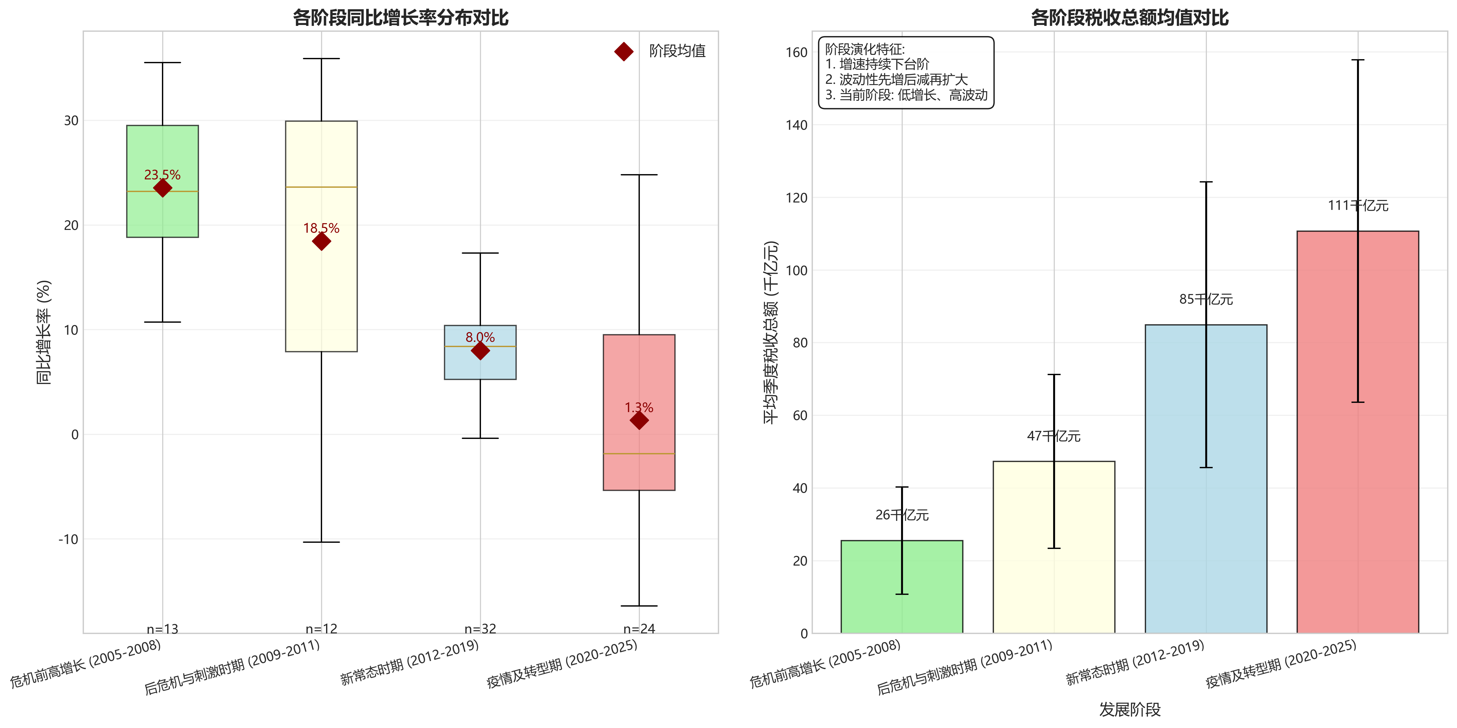 yoy_growth均值 8.0%,标准差 3.9pct;total_tax_amount季度均值 103,167亿元。增速中枢下移,但波动性显著收窄,增长更平稳。 - 疫情及转型期 (2020-2025):