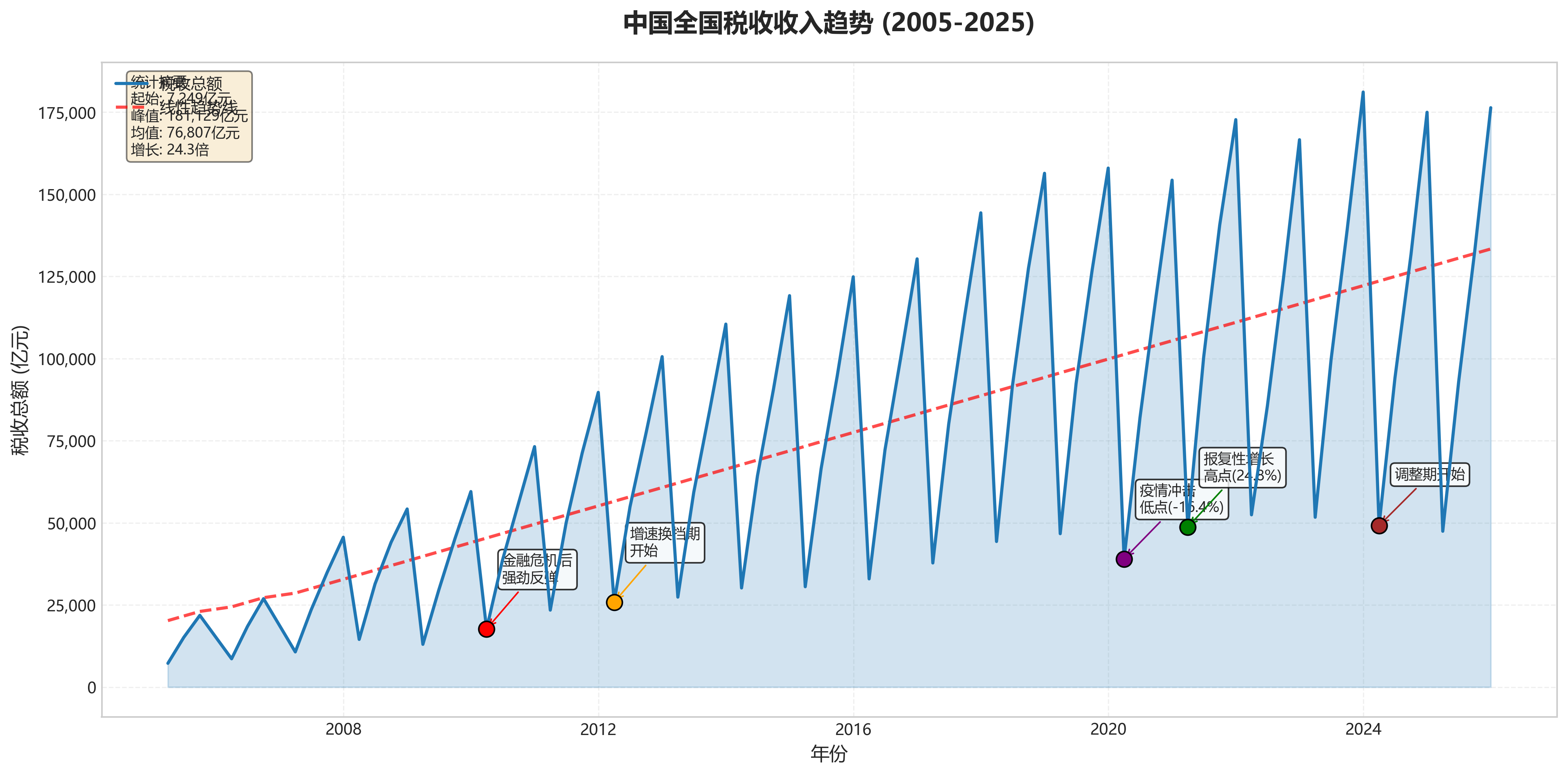 - 高速增长期 (2005-2011):受益于经济高速增长、工业化与城镇化快速推进,税收收入规模急剧扩张。总额从2005年的约2.2万亿元跃升至2011年的近9万亿元。