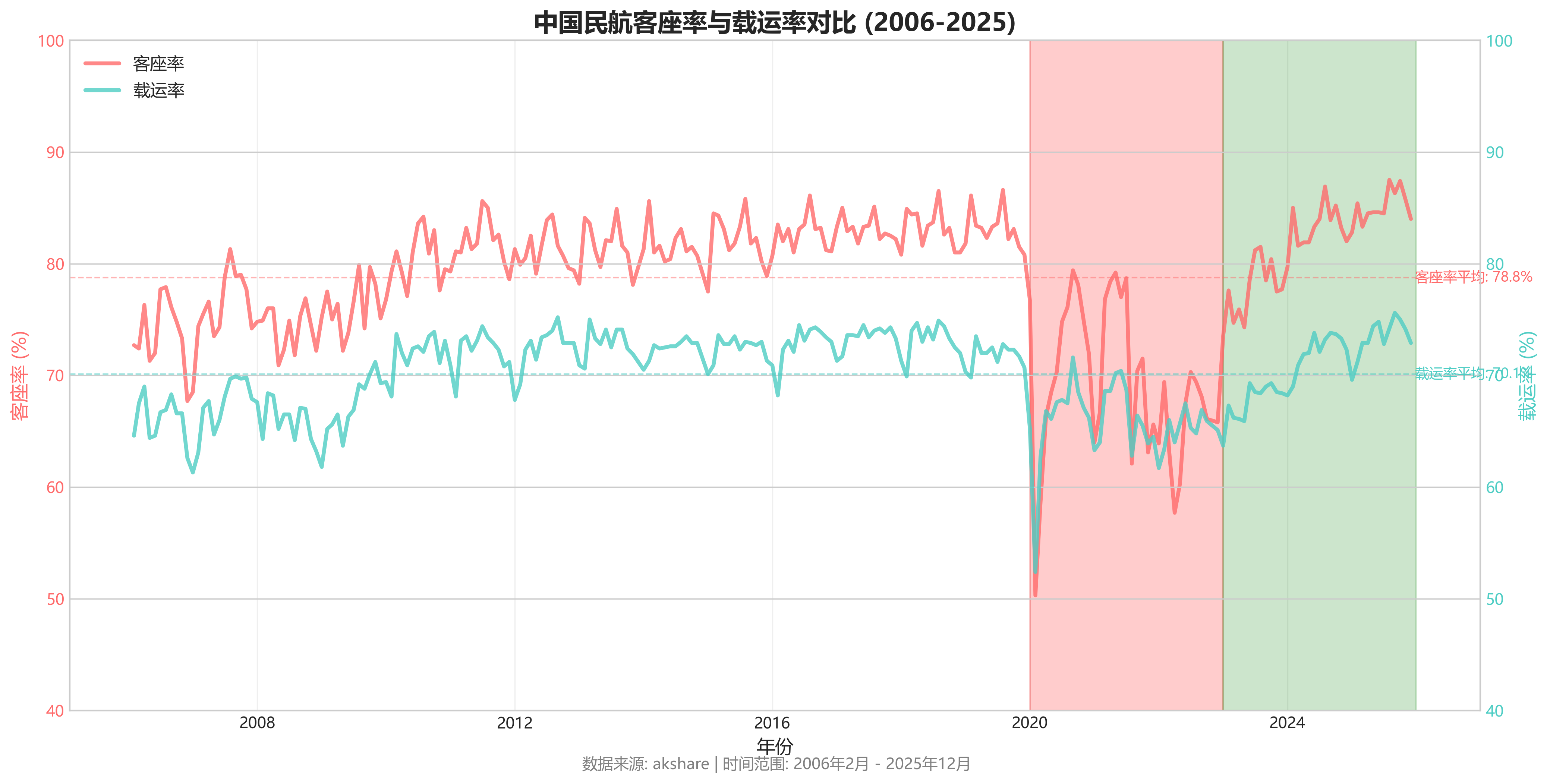 - 稳步上升期(2006-2019年):除2008年全球金融危机期间有短暂小幅下滑外,两大指标整体呈波动上升态势,尤其在2010年后,客座率多次突破80%,运营水平迈上新台阶。
