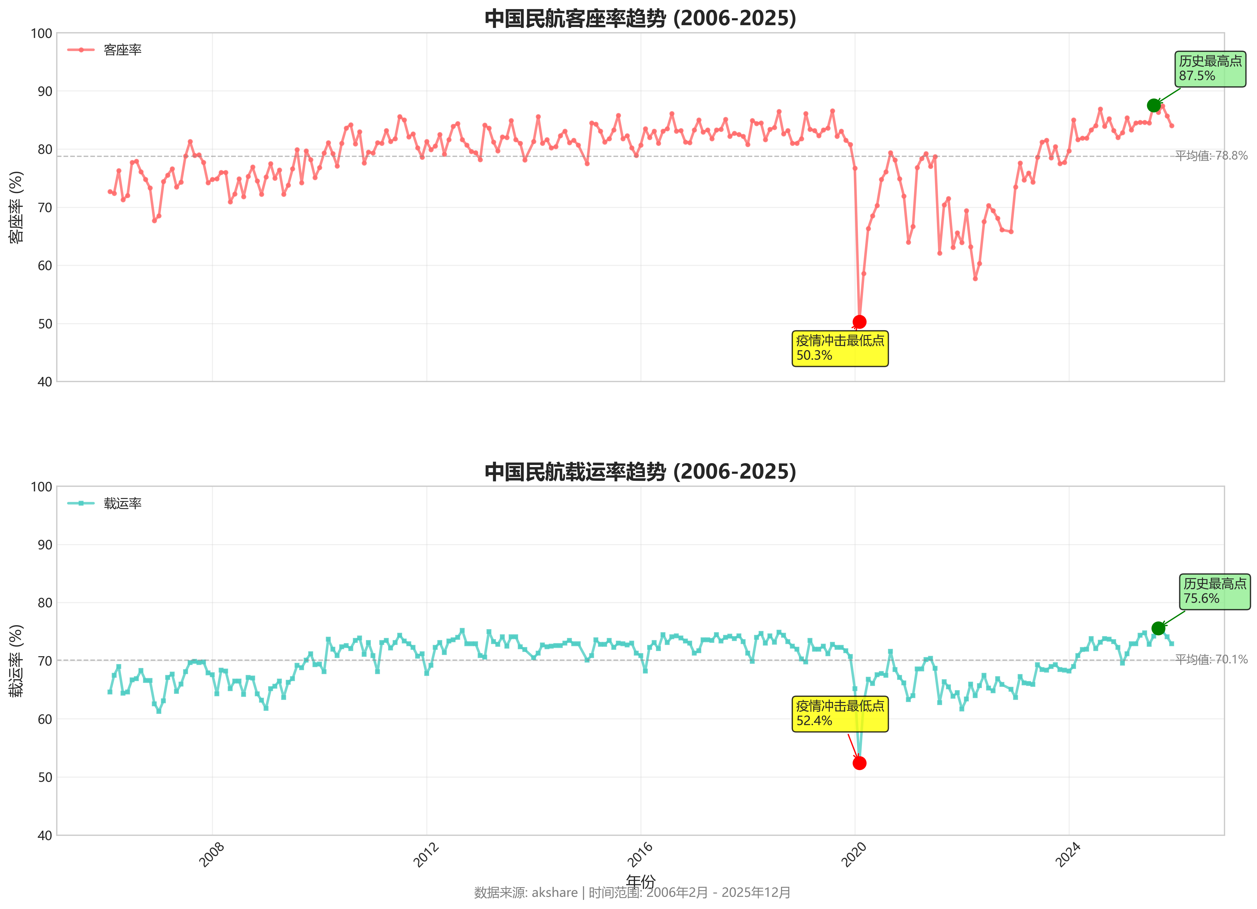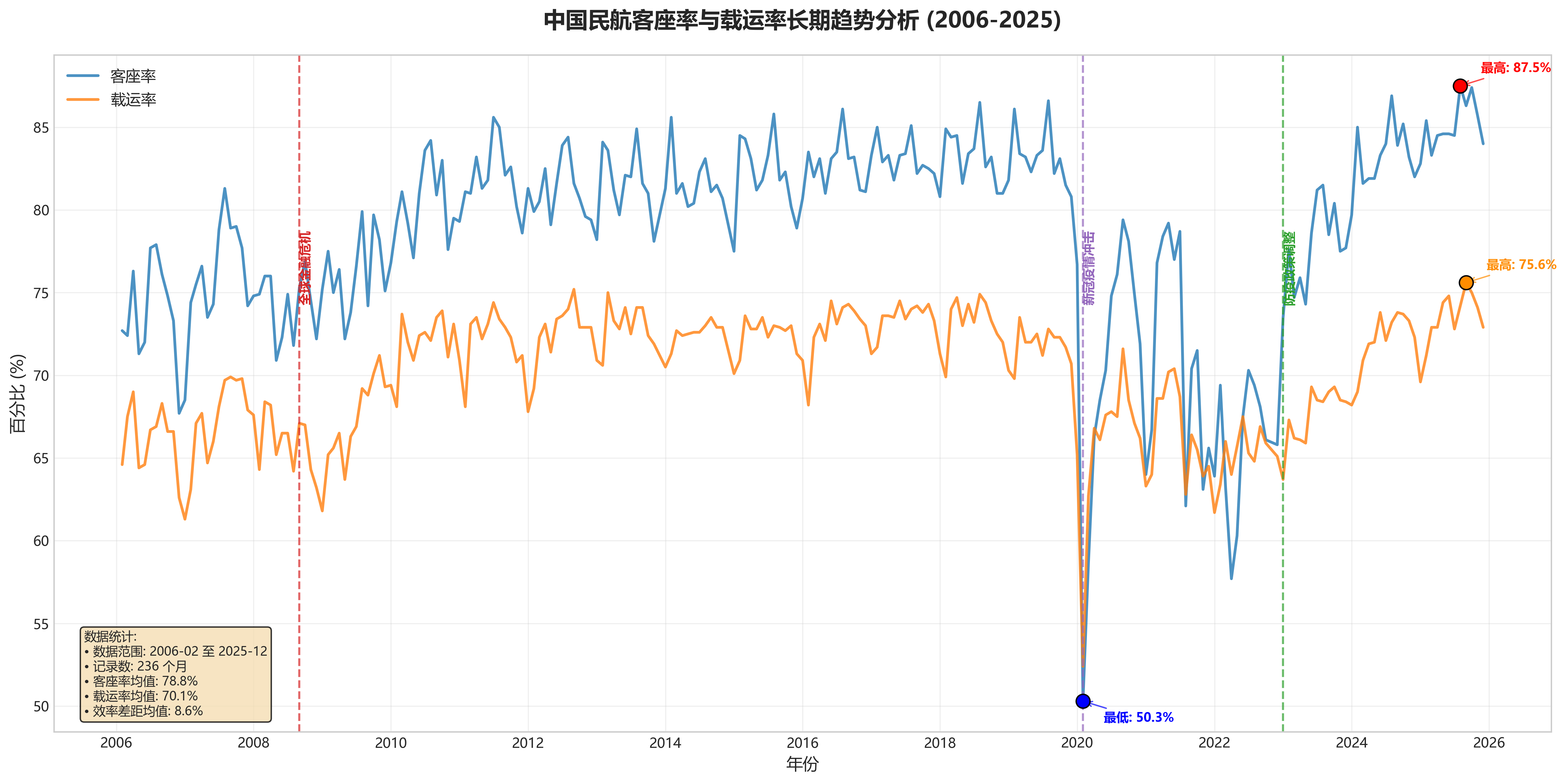 过去二十年,中国民航运营效率(以客座率和载运率为代表)经历了“长期提升-疫情重挫-快速复苏并创新高”的完整周期。2020年初新冠疫情的冲击是数据中最突出的断点,其影响深度和持续时间远超2008年金融危机。