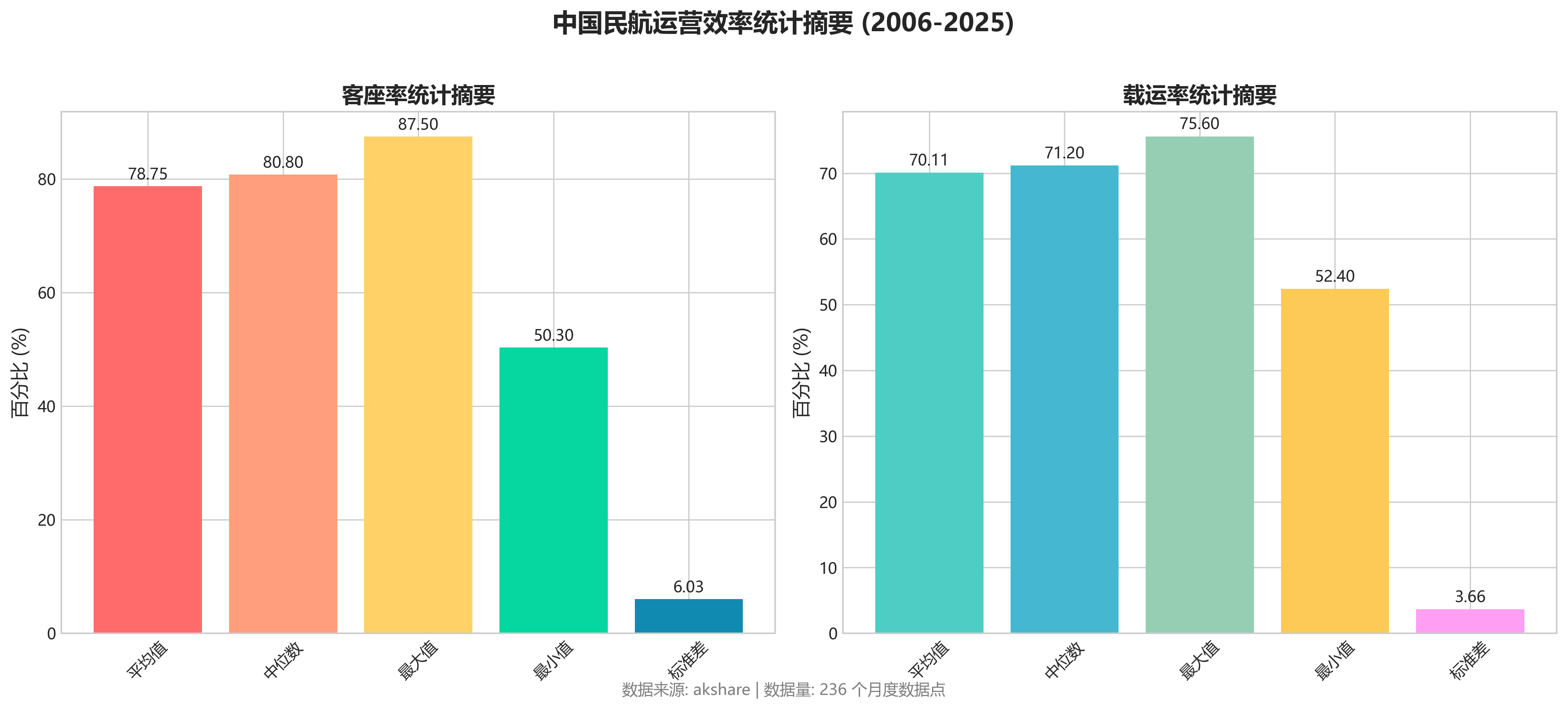 - 整体水平:近二十年间,中国民航平均客座率为 78.4%,平均载运率为 69.6%。客座率中位数高于平均值,表明数据分布左偏,存在较多低于平均水平的时期(如疫情期间)。