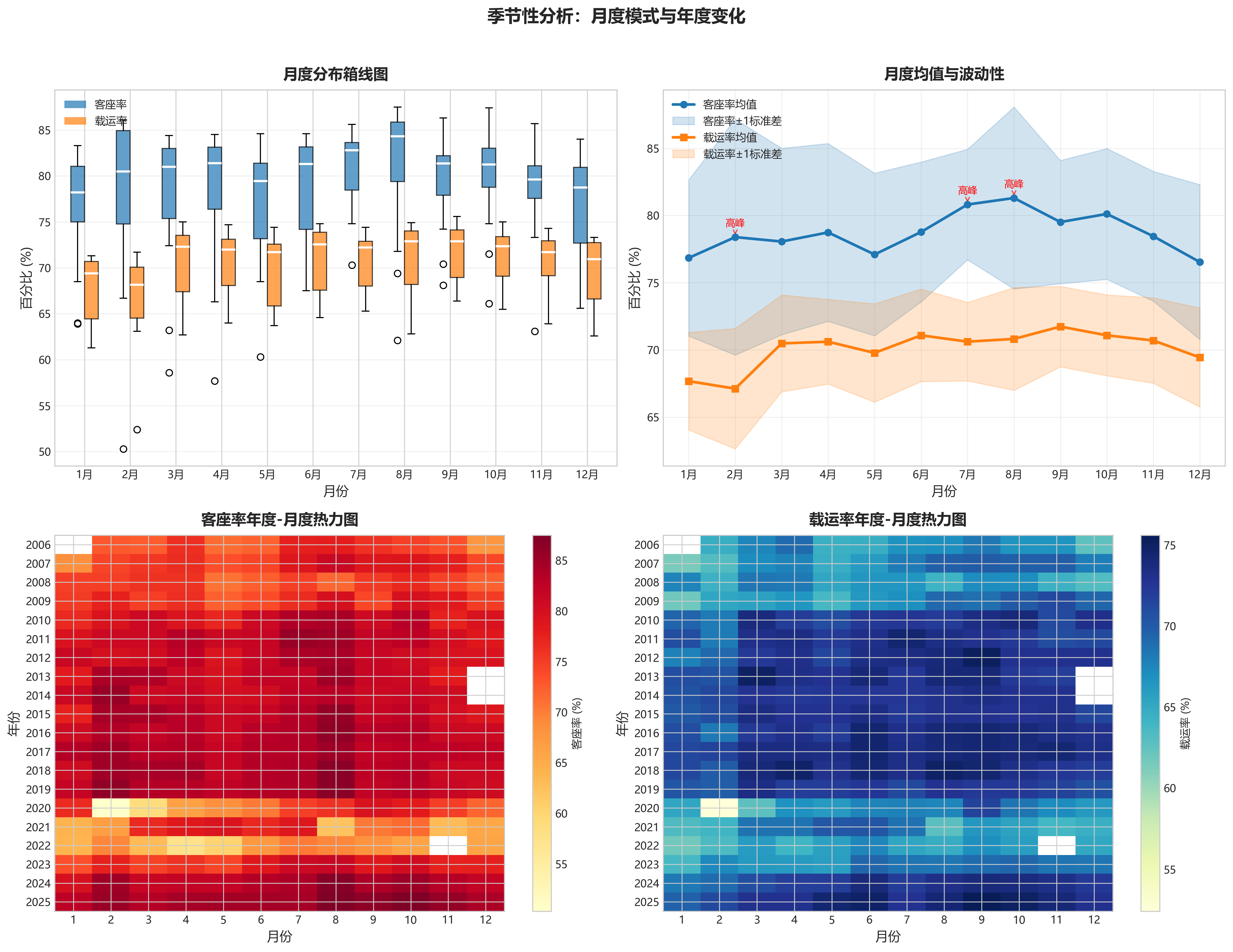 - 季节性分析:数据呈现显著的年度季节性规律。夏季(7-8月)和春运期间(2月) 通常是客座率的高峰期,这与旅游旺季和节假日出行需求旺盛相符。第一季度末(3月)和第四季度初(10月) 也常出现小高峰。冬季(1月、12月)和春季(5月) 通常是相对的淡季。载运率的季节性模式与客座率高度同步,但波动幅度相对较小。