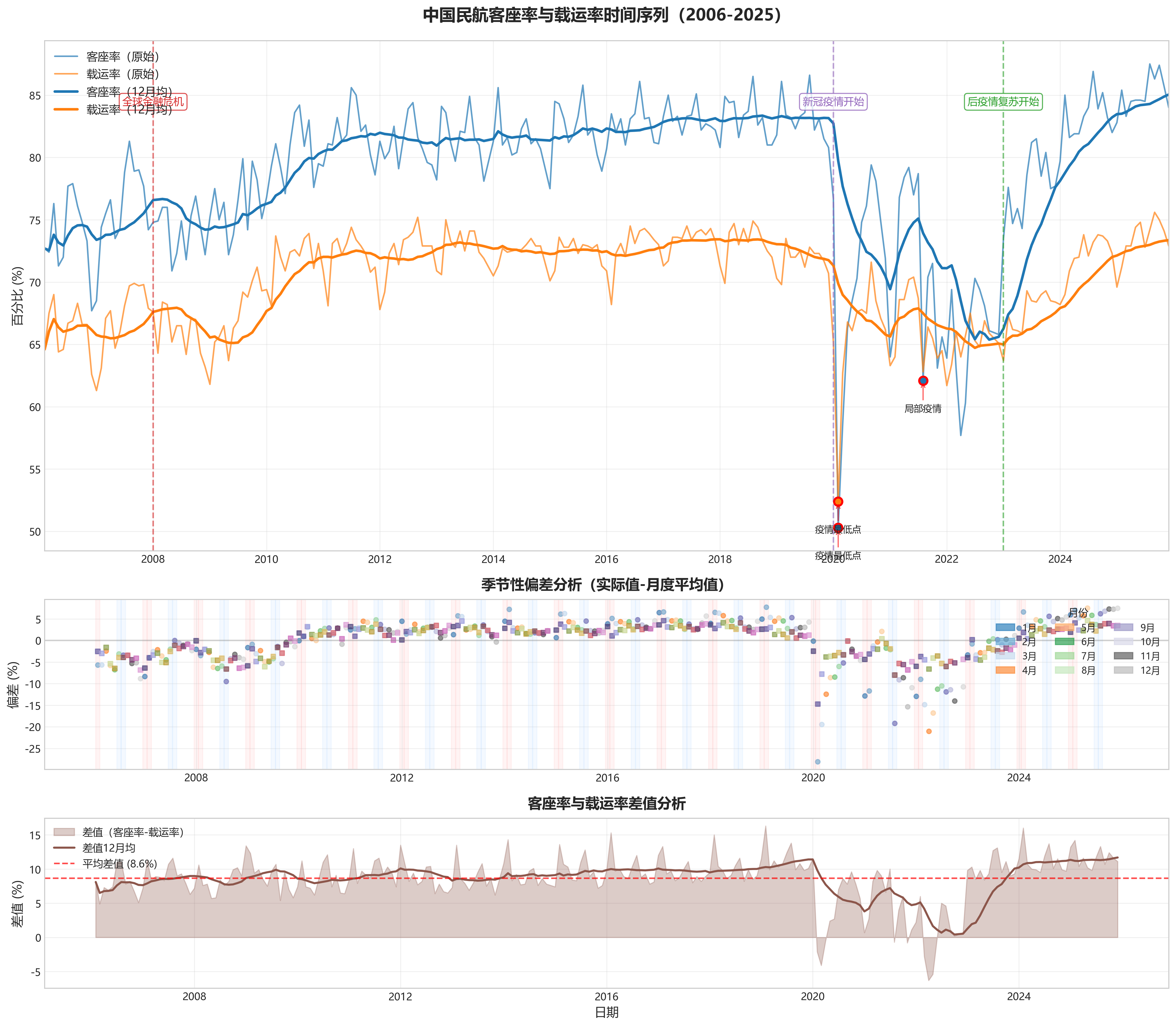 - 其他重要低点:2022年4月(客座率 57.7%),受上海等地疫情封控影响;2021年8月(客座率 62.1%),受Delta变异株引发的本土疫情扩散影响。