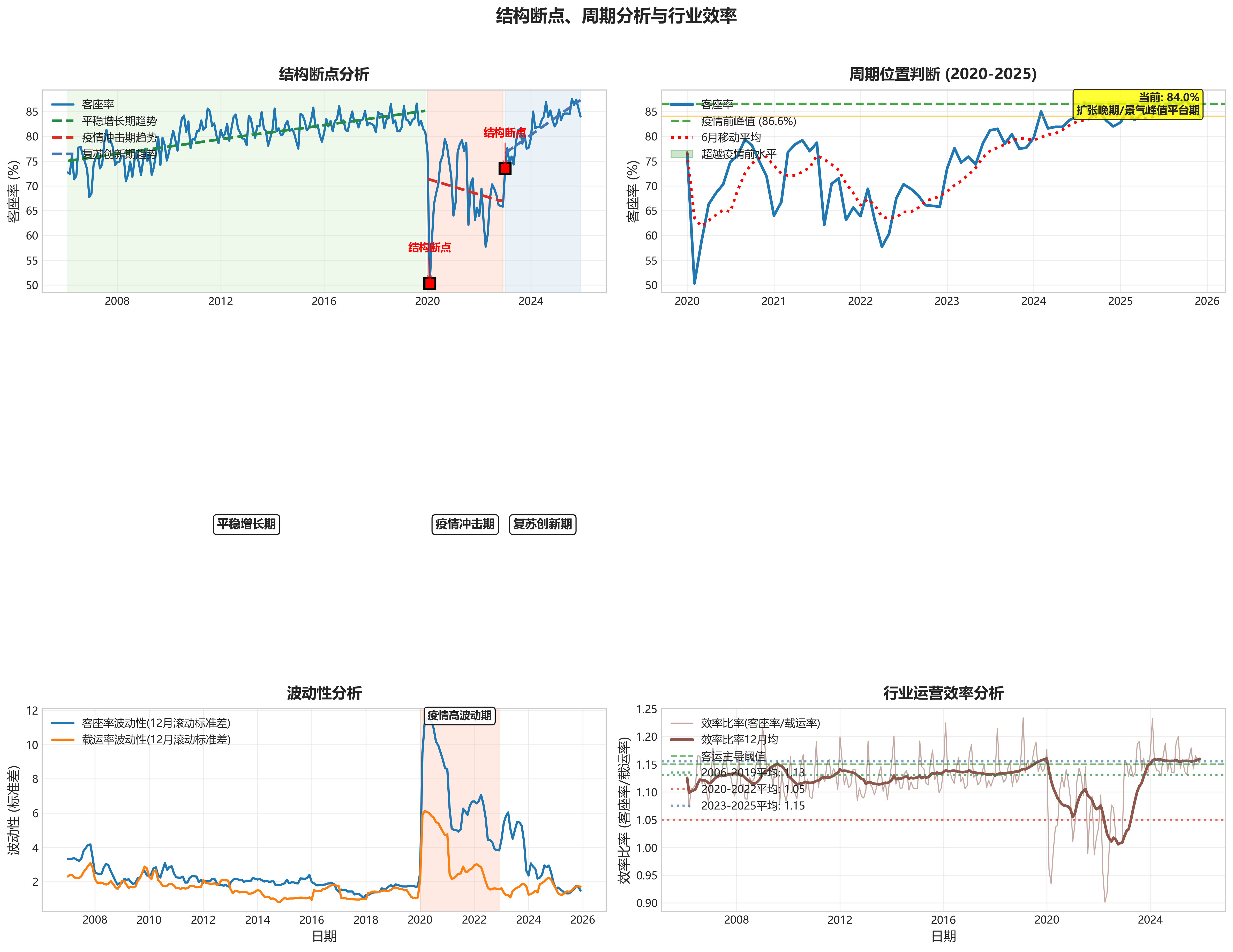 - 潜在结构性断点:数据中存在两个明确的断点。1. 2020年2月:趋势、水平和波动性的全面断裂,标志疫情时代的开始。2. 2023年1月:趋势的逆转点,标志后疫情复苏周期的启动。此外,2010-2011年前后,客座率均值平台出现一次跃升(从75%-78%区间升至80%以上平台),这可能与中国高铁网络初步成型后,民航业进行航线优化、提升干线运营效率有关。