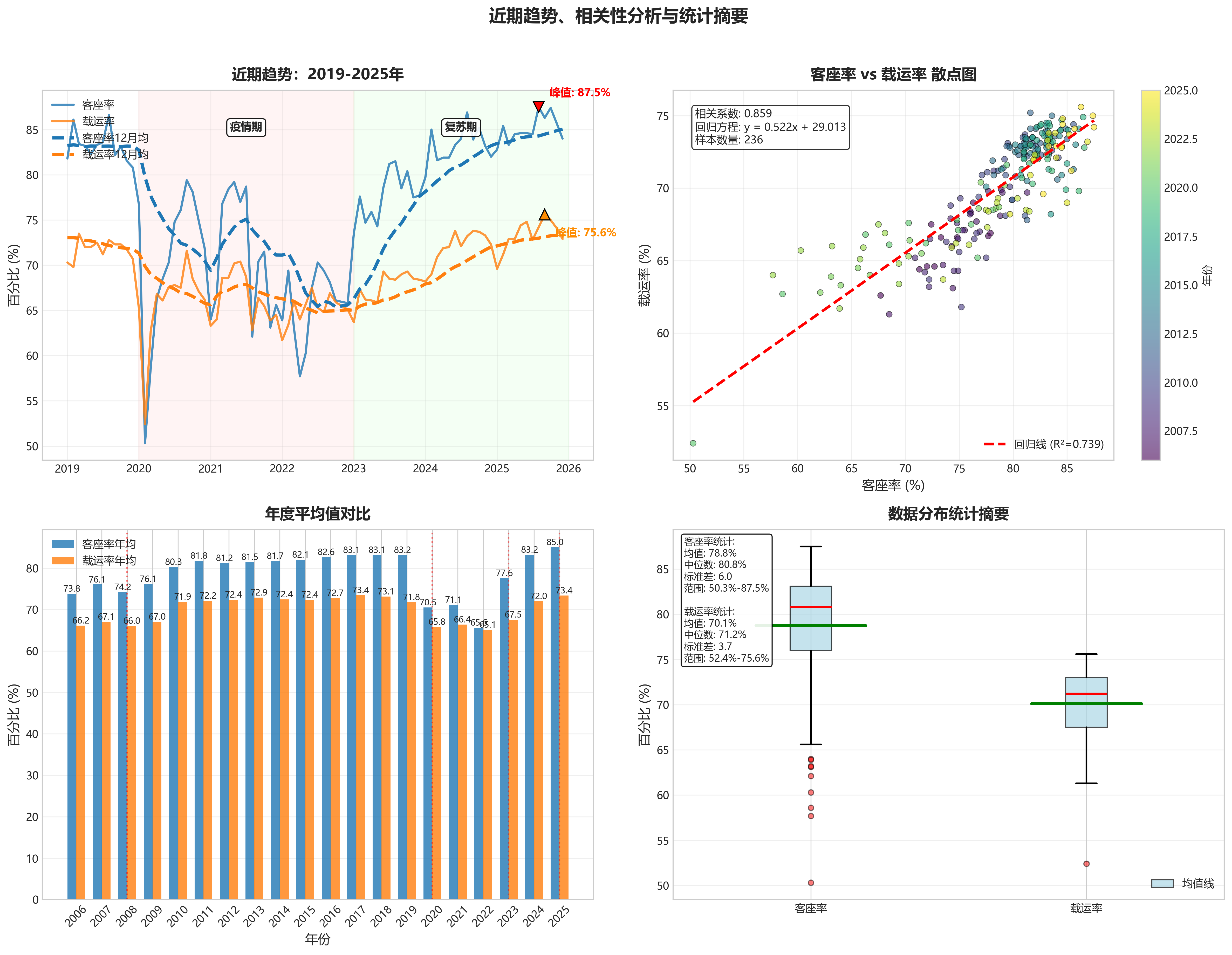 - 疫情冲击期(2020-2022年):2020年初,两项指标断崖式下跌,其中**2020年2月客座率跌至50.3%**的历史极低点。随后三年在低位剧烈震荡,多次因局部疫情反复而下滑(如2021年8月、2022年4月),恢复过程艰难曲折。