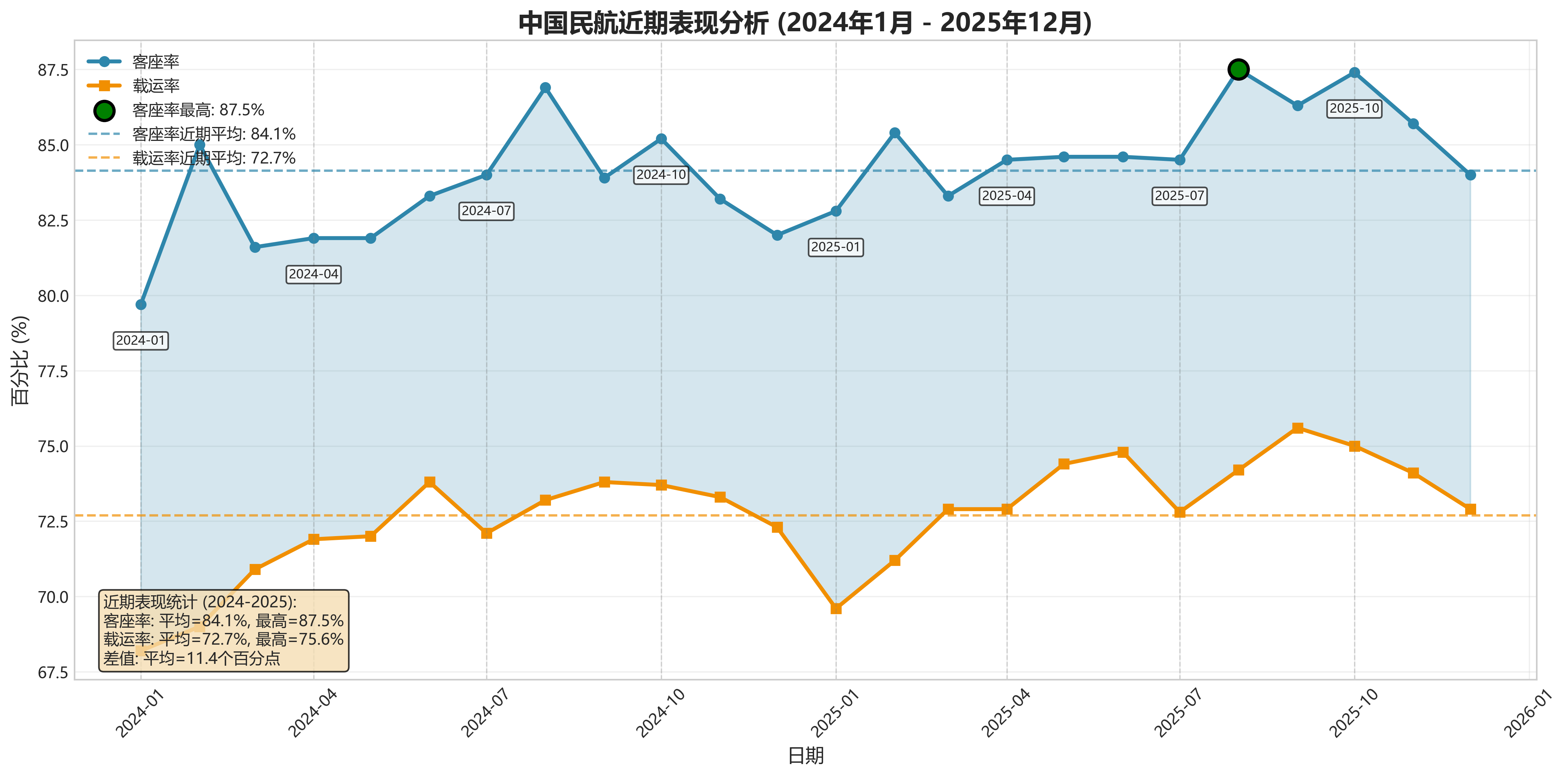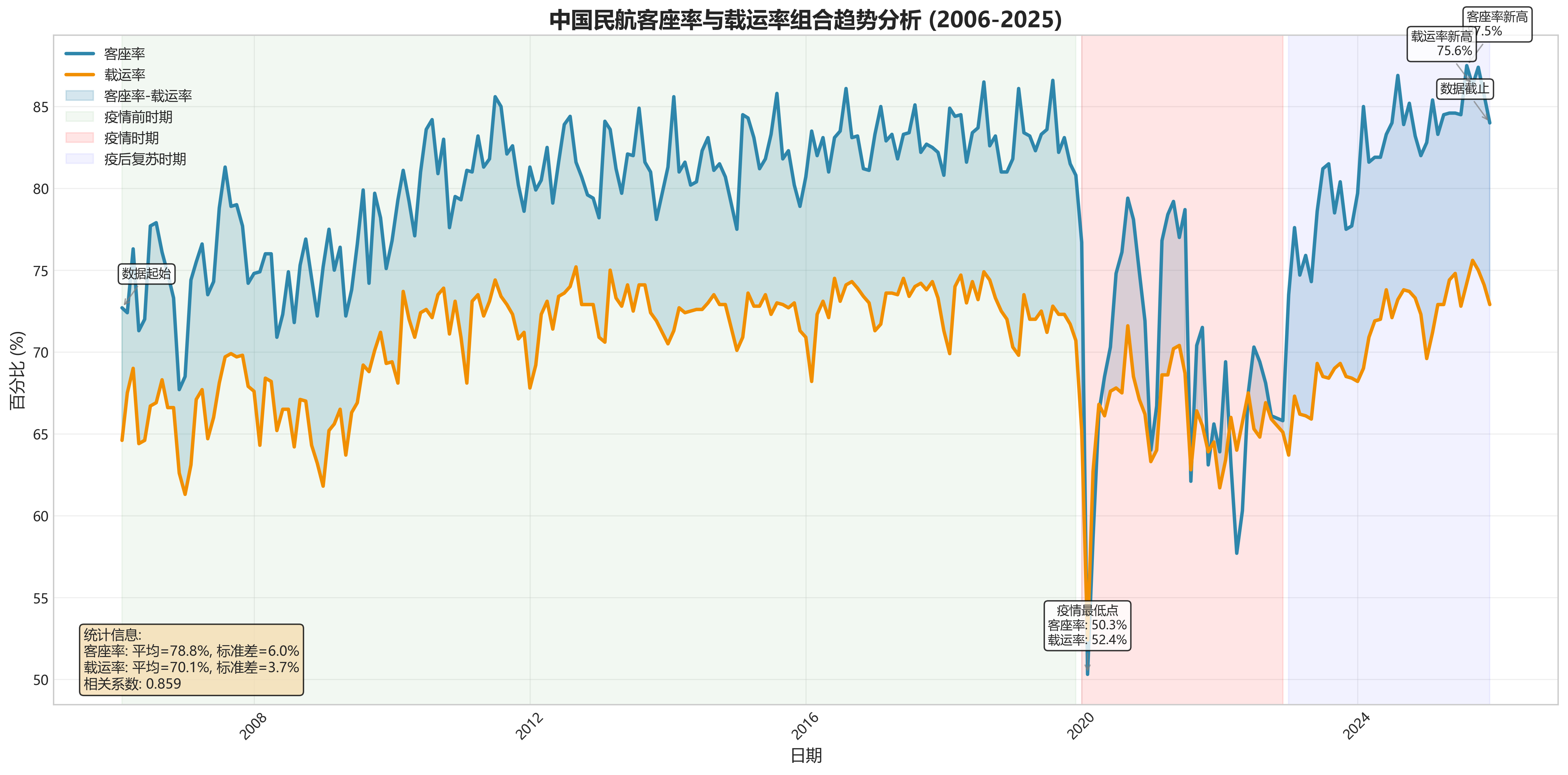 - 复苏与新高期 (2023-2025):自2023年起,指标进入快速复苏通道。2024年下半年起,客座率已恢复并持续超越疫情前水平,在2025年多次创下历史新高(如2025年8月达87.5%)。载运率亦稳步回升,于2025年9月达到历史峰值 75.6%。