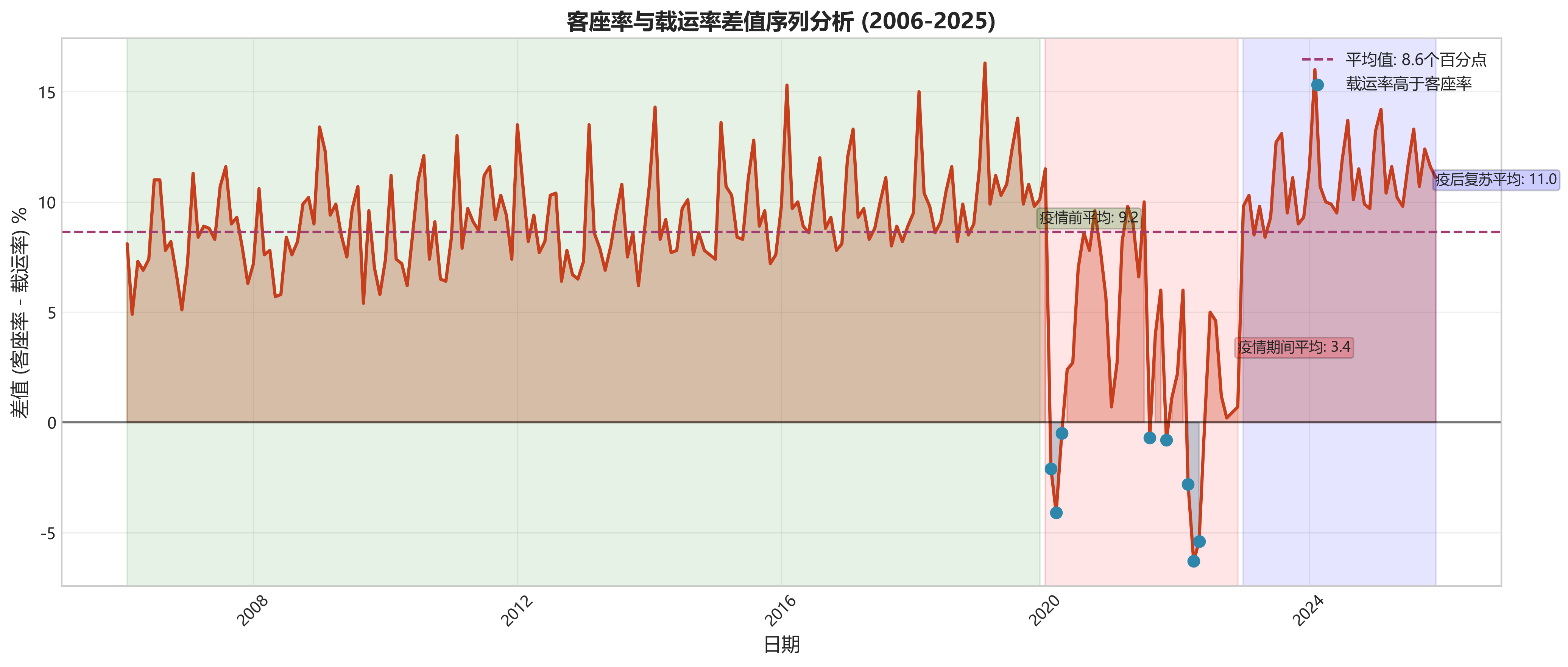 - 整体水平:差值的长期平均值约为 8.8个百分点,这主要反映了客运座位在总运力中占据主导地位,且客运的单位收益(或需求强度)通常高于货运。
