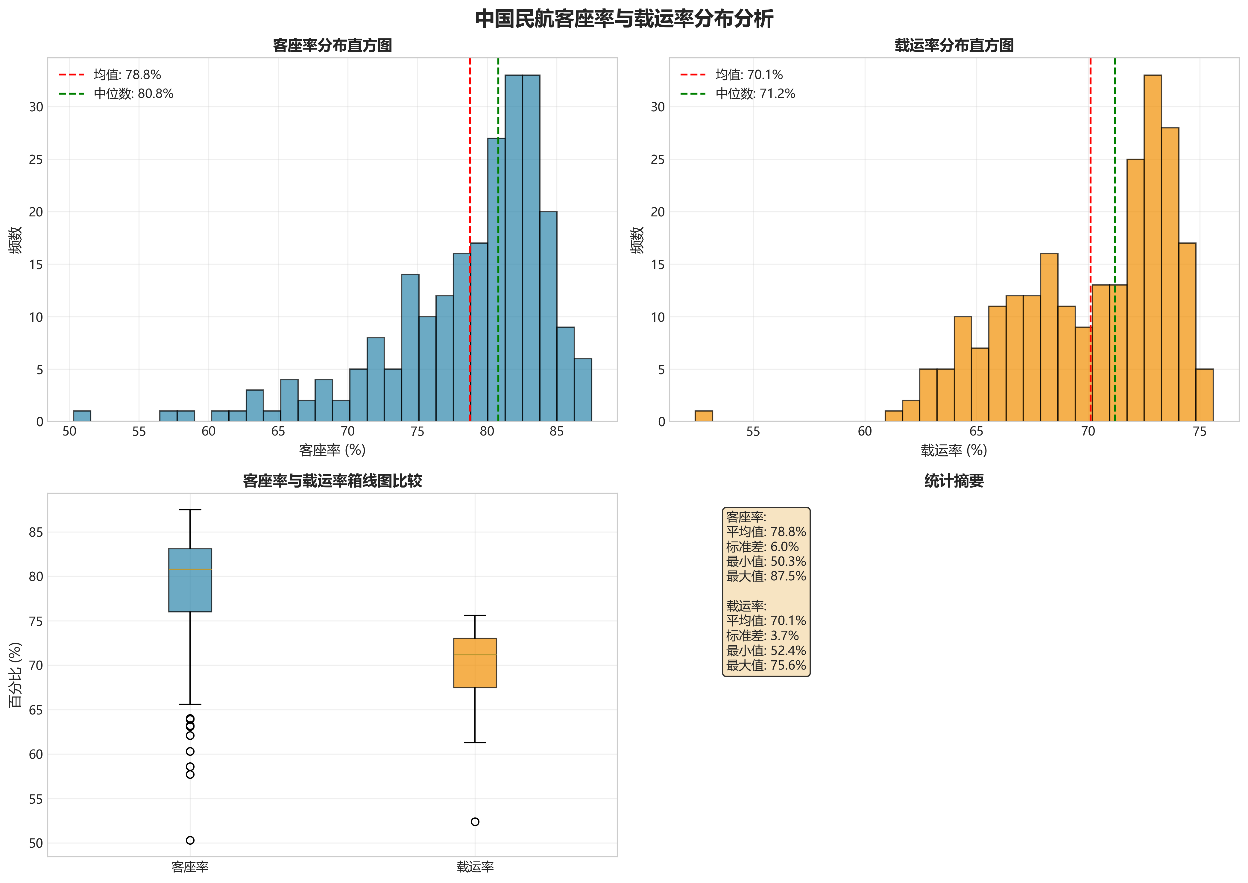 - 分布形态:客座率分布呈现明显的左偏态,受2020-2022年疫情期间极端低值影响,平均值被拉低。载运率分布相对更为集中和对称。