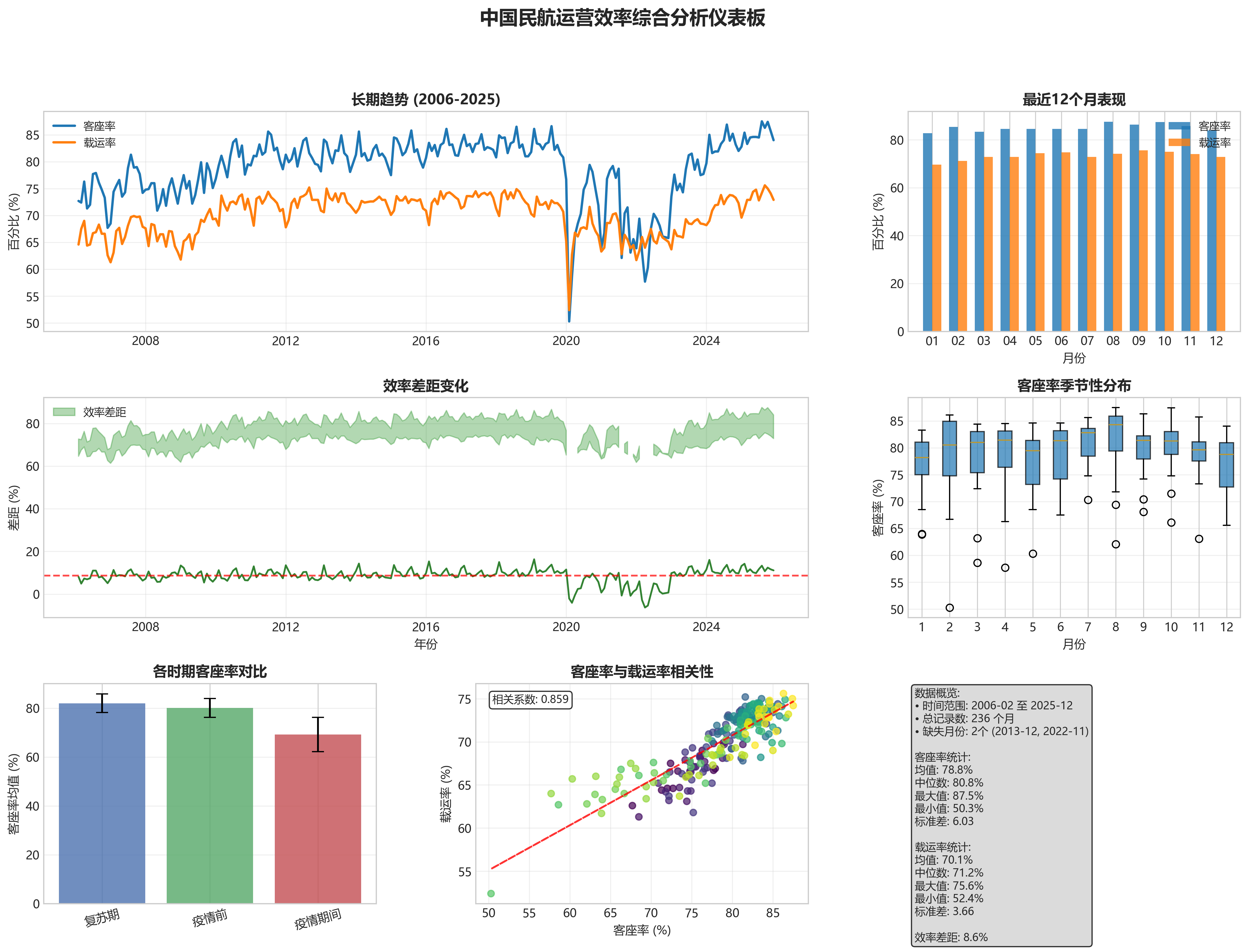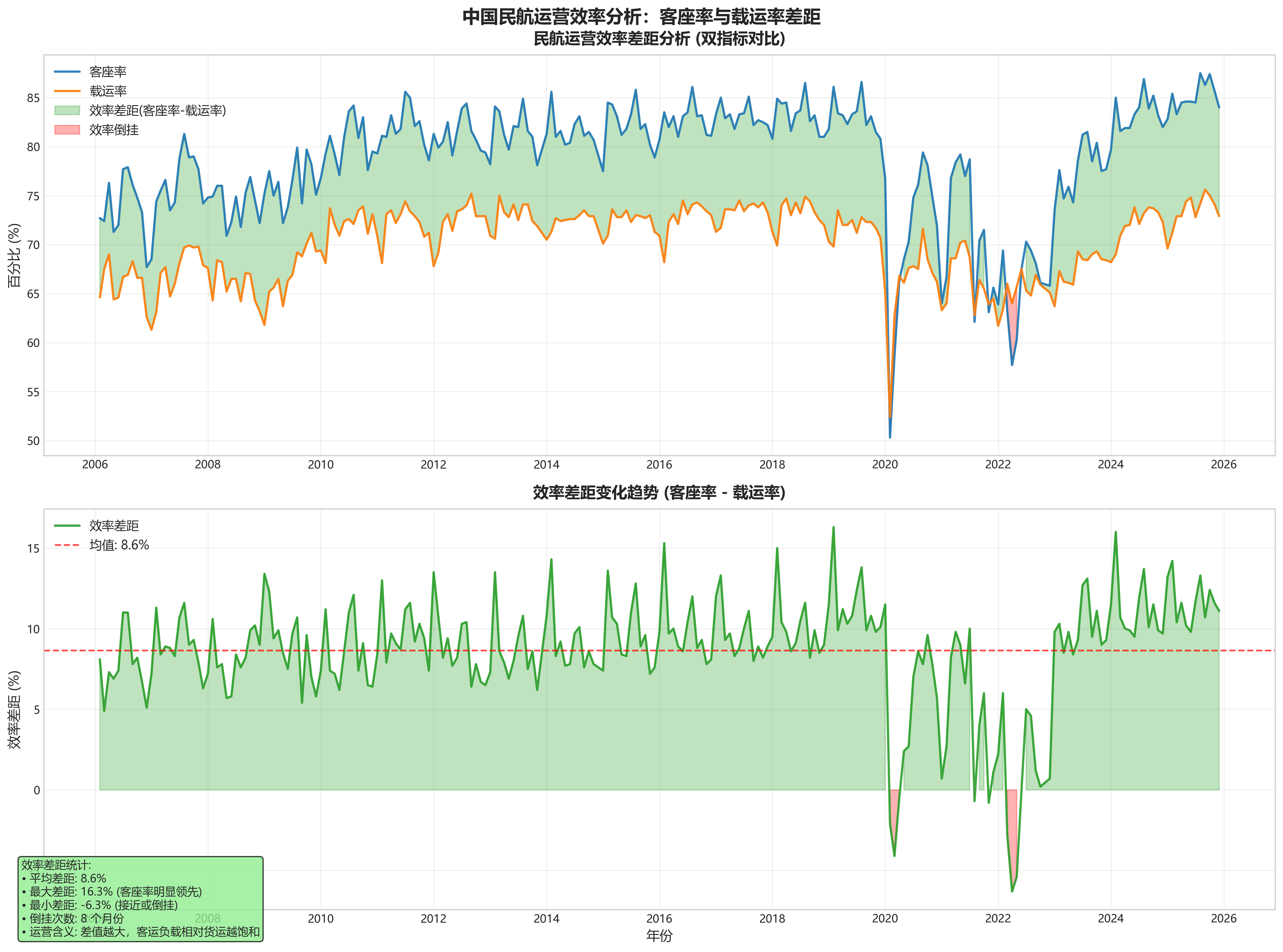- 可视化建议:建议使用面积图或双轴折线图展示客座率、载运率及两者差值,直观呈现效率缺口的变化。