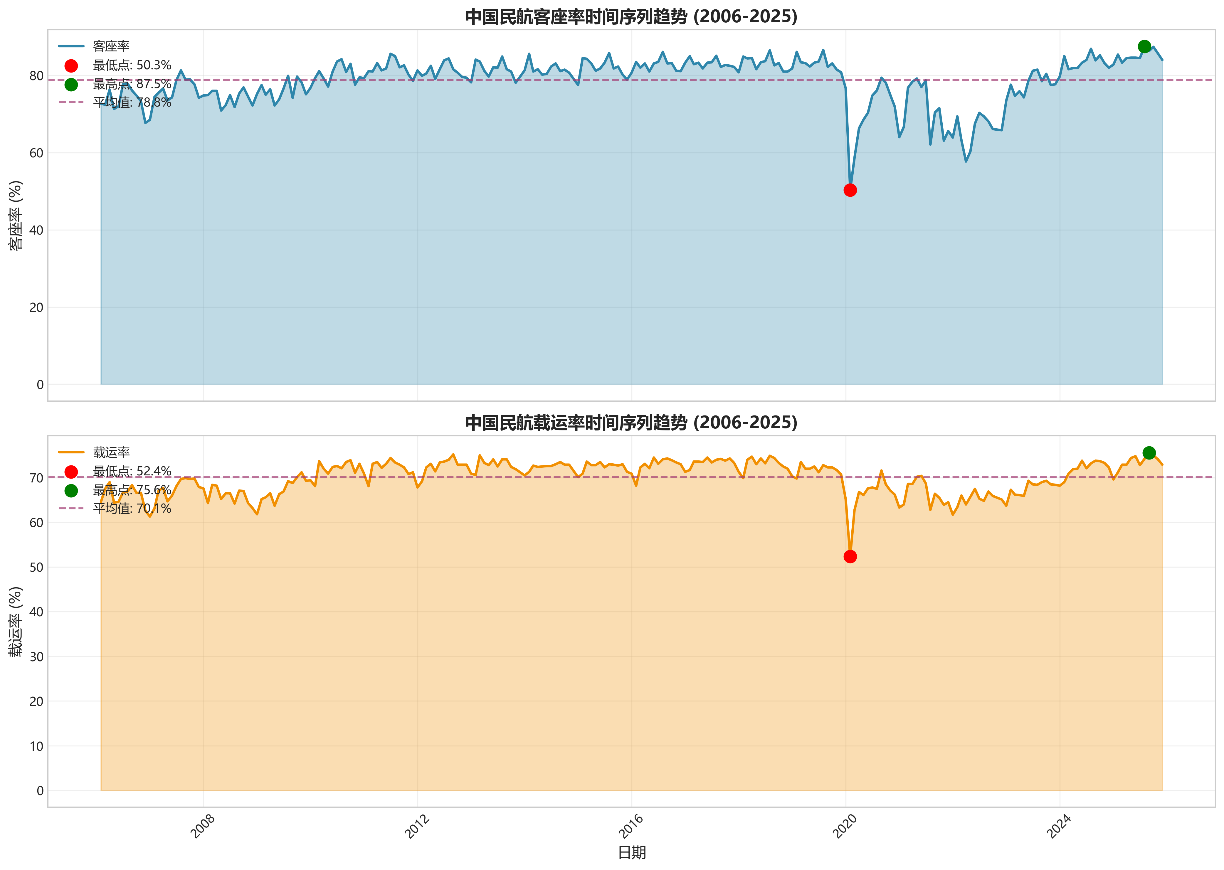 - 异常值检查:数据整体在合理范围内(0%-100%)。存在两个显著的异常低点:2020年2月(客座率50.3%,载运率52.4%)和2021年8月(客座率62.1%)。这两个异常值与新冠疫情导致的出行封锁和局部疫情暴发等外部冲击高度相关,属于可解释的极端值,并非数据错误。