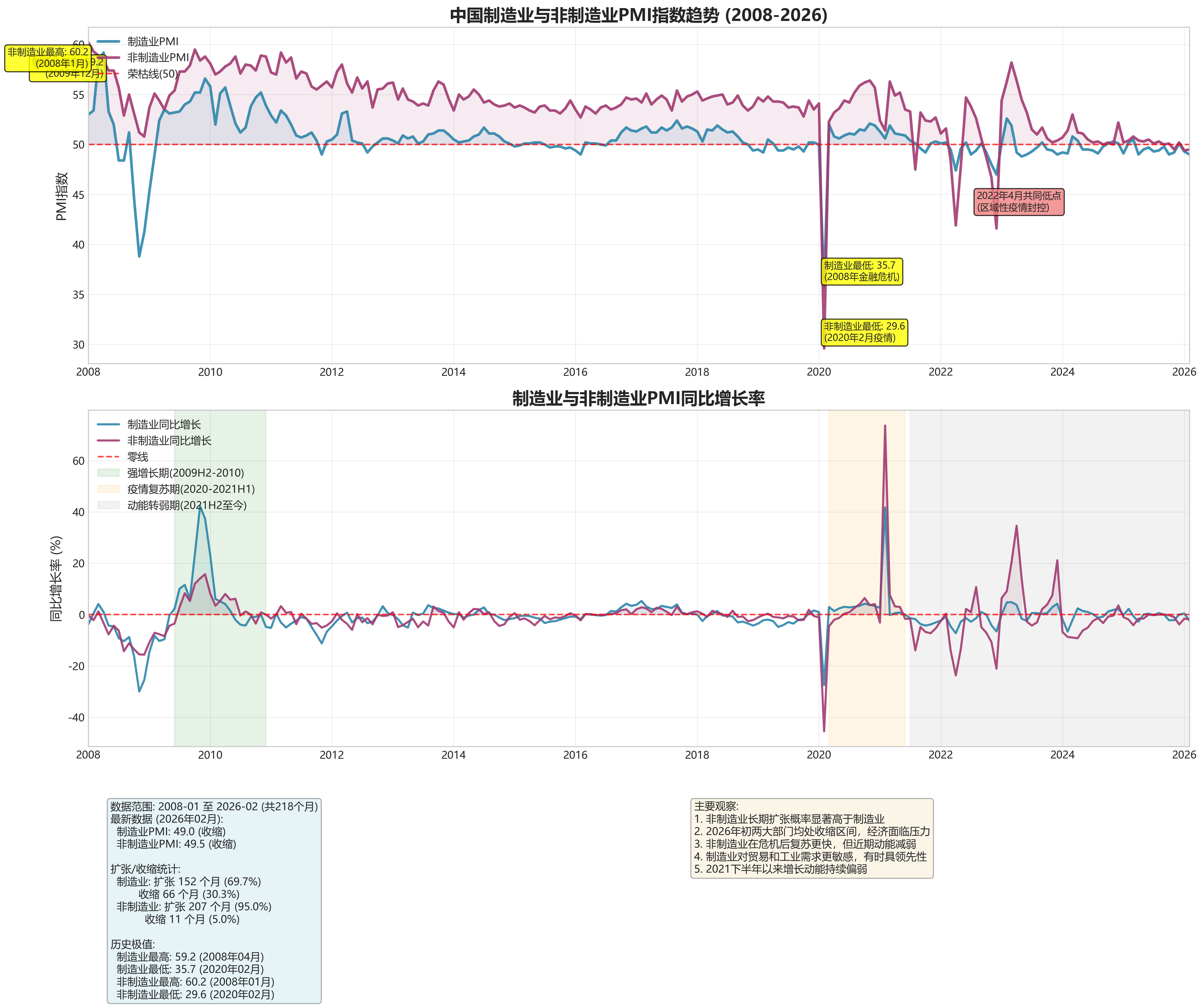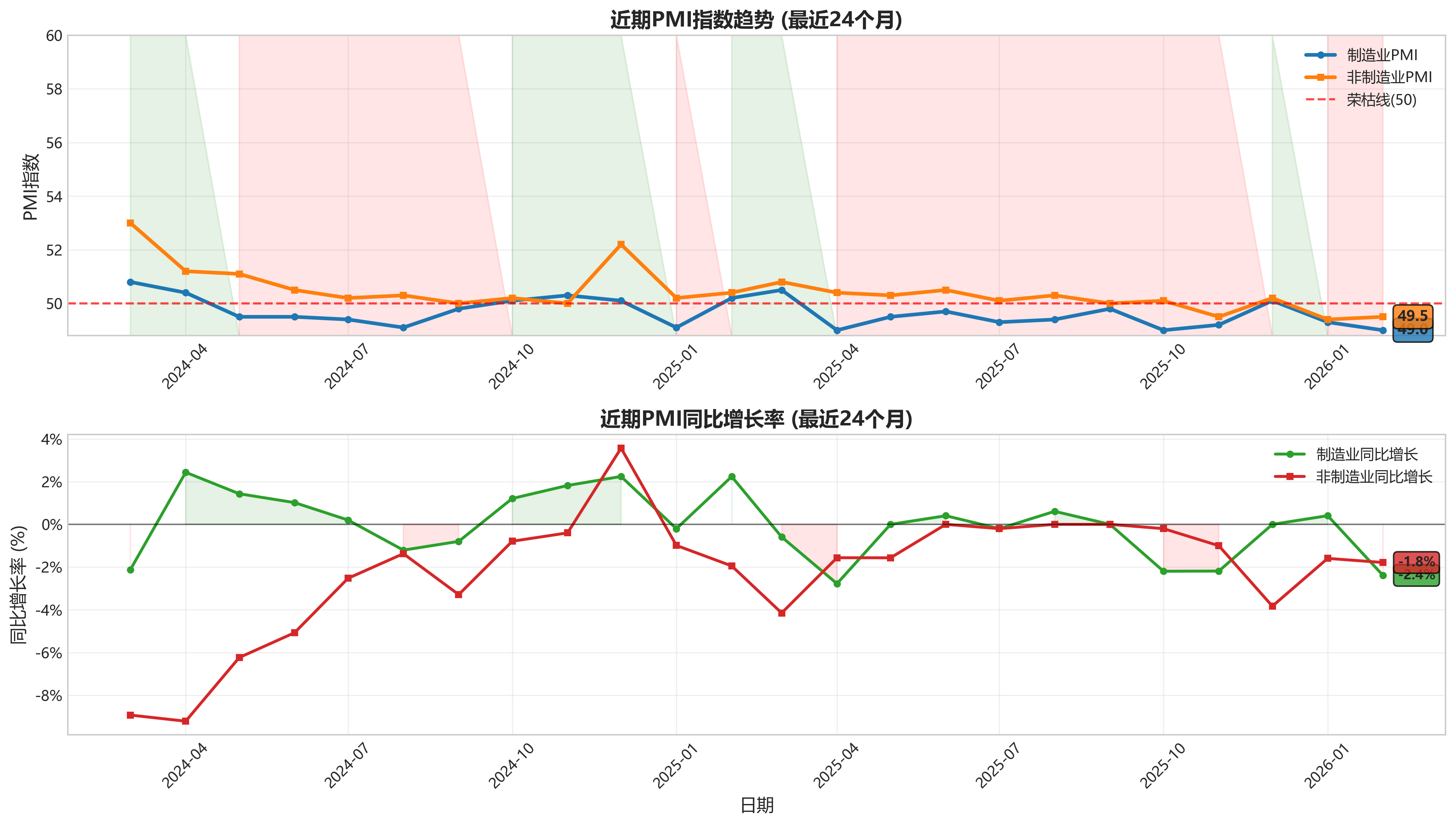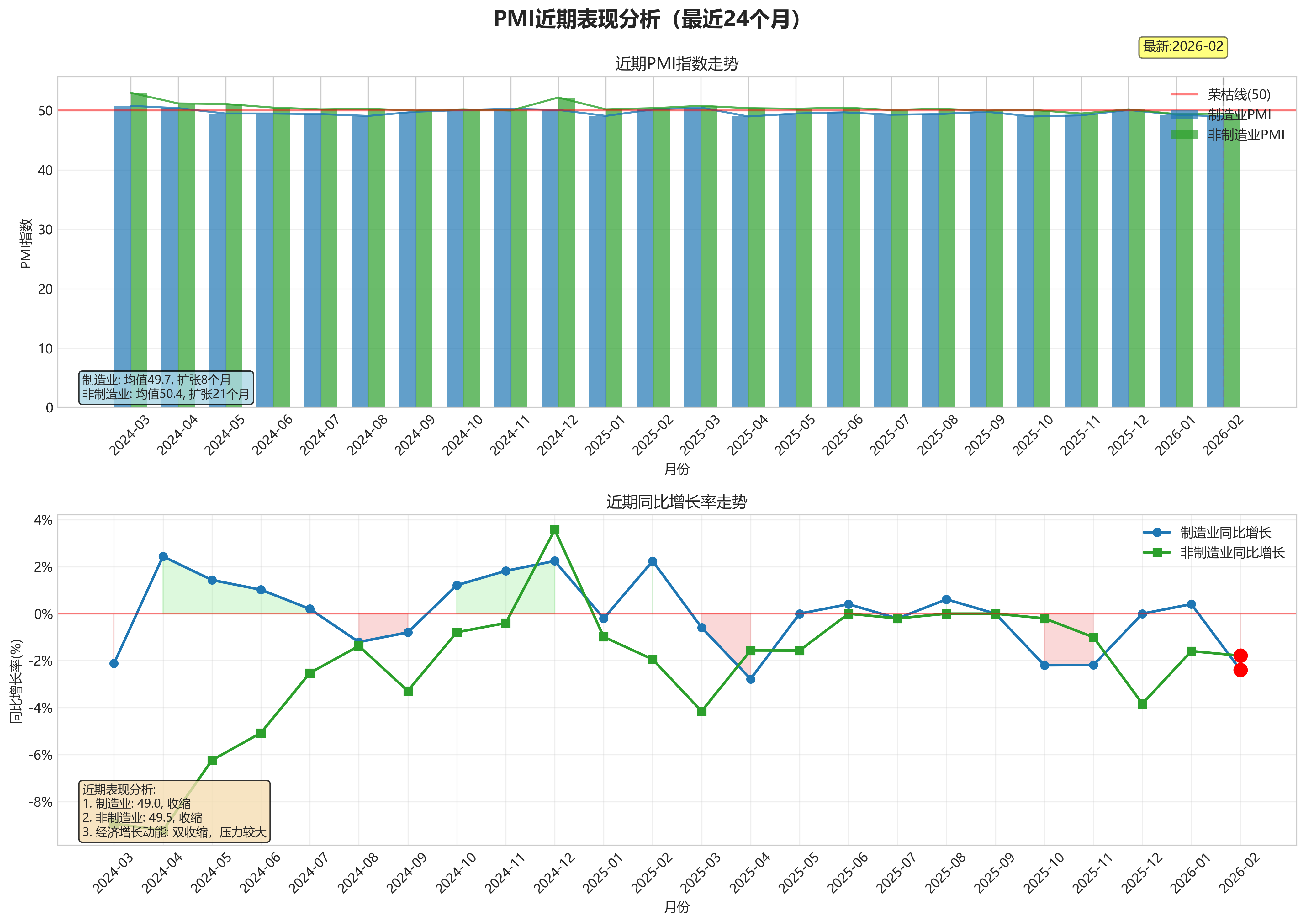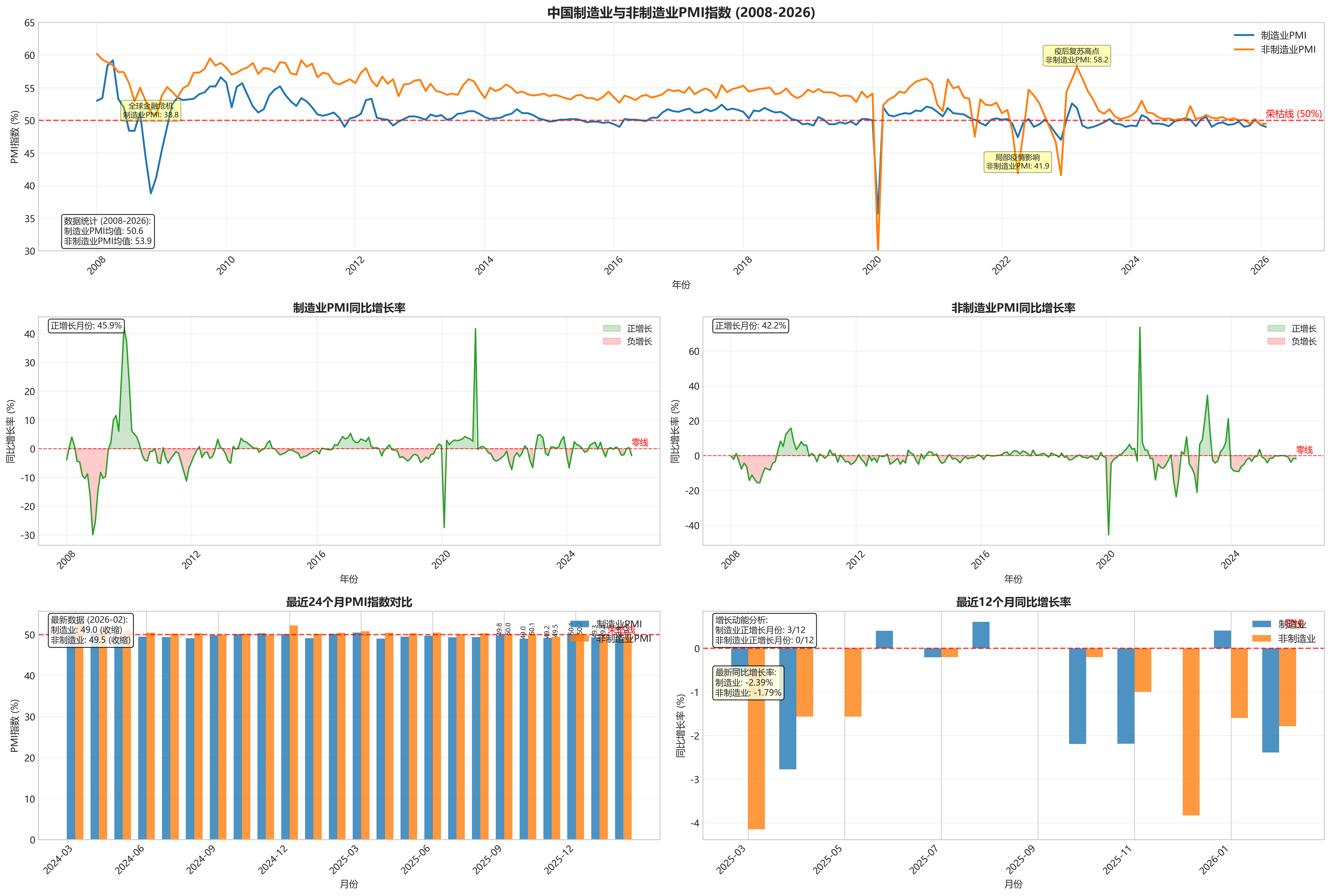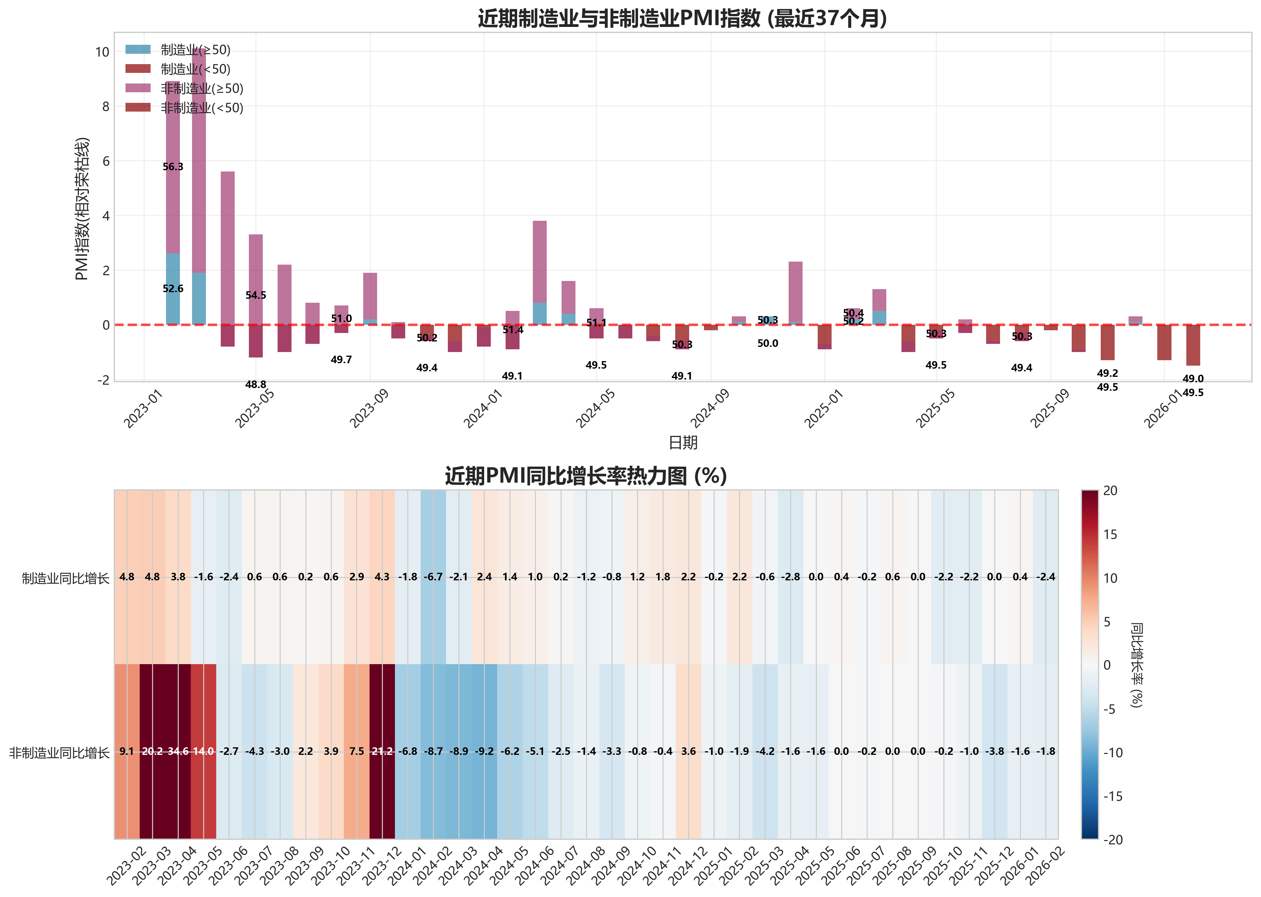 指标 最新值 (2026-02) 3月前 (2025-11) 6月前 (2025-08) 12月前 (2025-02) 历史均值 制造业PMI 49.0 49.2 49.4 50.2 50.9 非制造业PMI 49.5 49.5 50.3 50.4 54.6 制造业PMI同比 -2.39% -2.19% 0.61% 2.24% -0.05% 非制造业PMI同比 -1.79% -1.00% 0.00% -1.95% 0.67% - 观测建议: