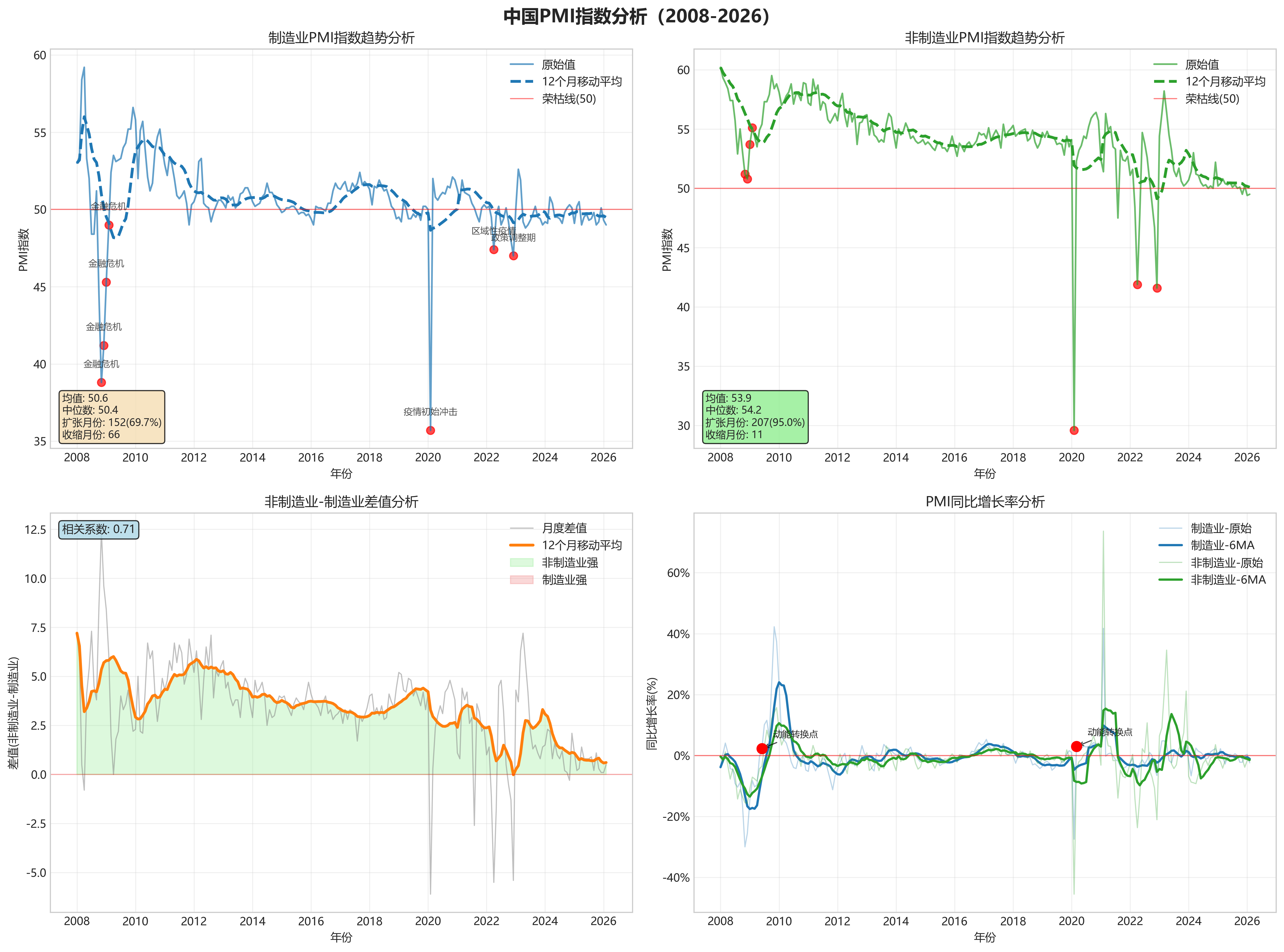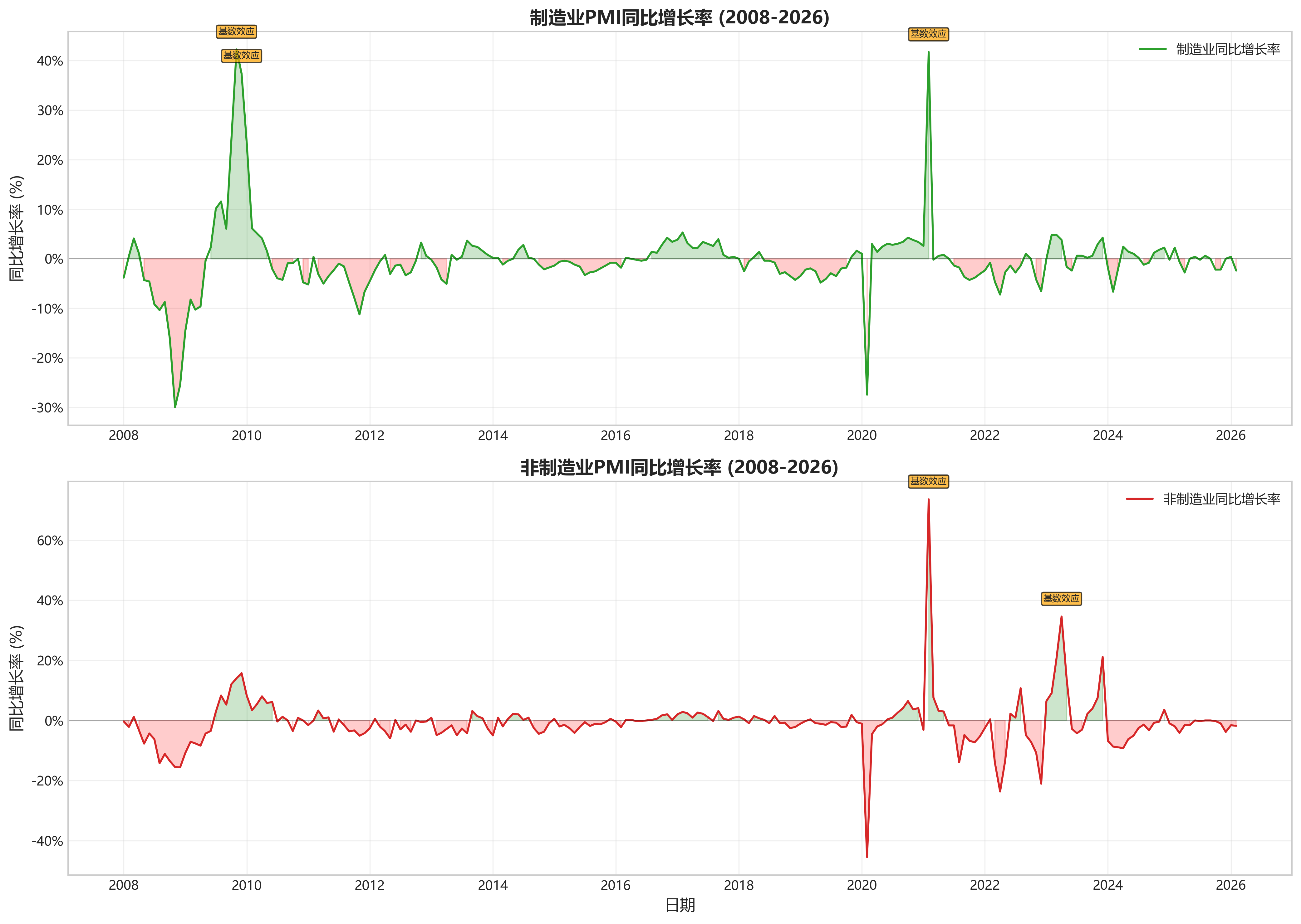 - 同步性:制造业与非制造业的同比增长率在多数重大拐点时期表现同步(如2008年底同步暴跌、2009年同步高增、2020年初同步深跌后反弹、2022年中同步低迷)。