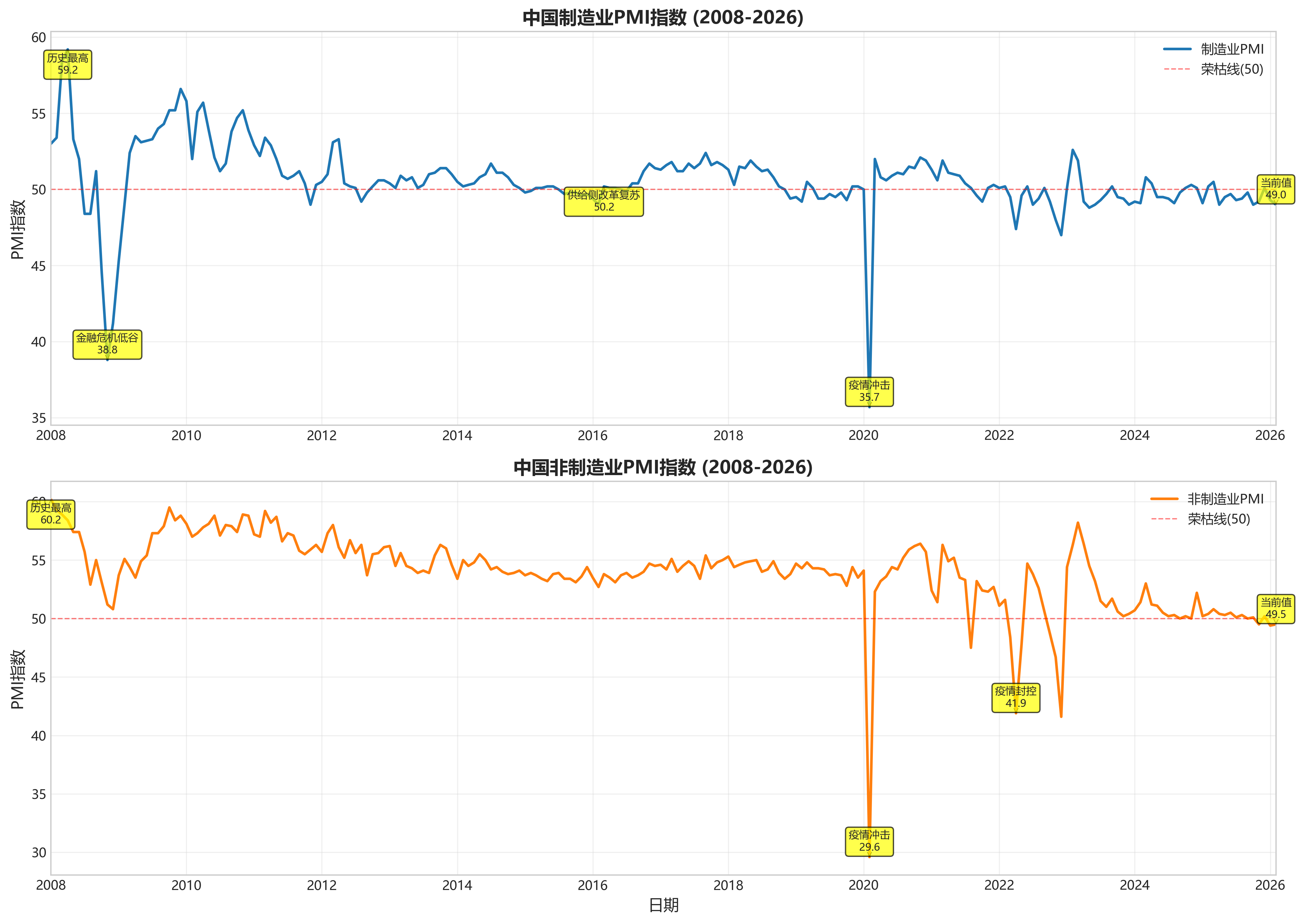 - 2020年新冠疫情冲击:2020年2月,制造业和非制造业PMI分别骤降至35.7和29.6,创下数据期内最深跌幅。