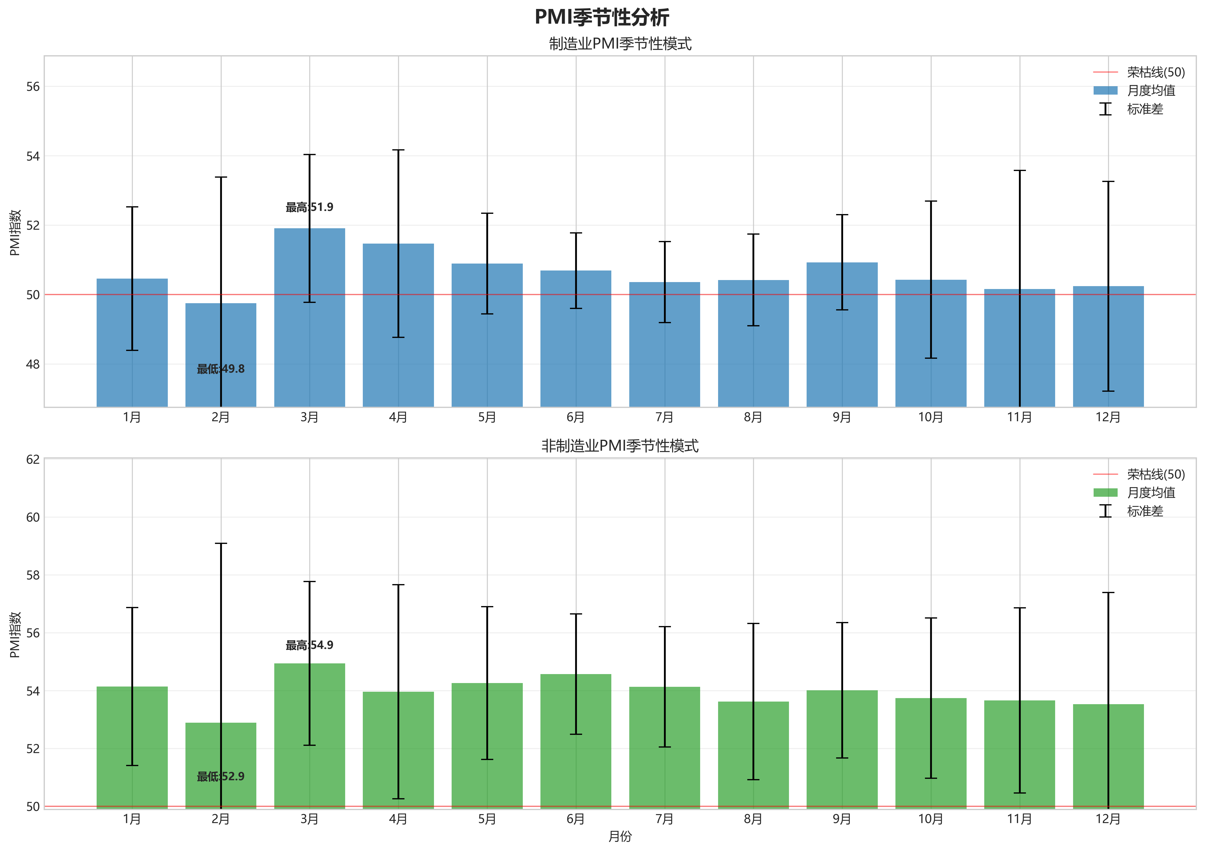 - 近期重要低点:2023年4月制造业(49.2)和2024年9月非制造业(50.0)均触及或接近荣枯线,反映复苏进程中的波折。