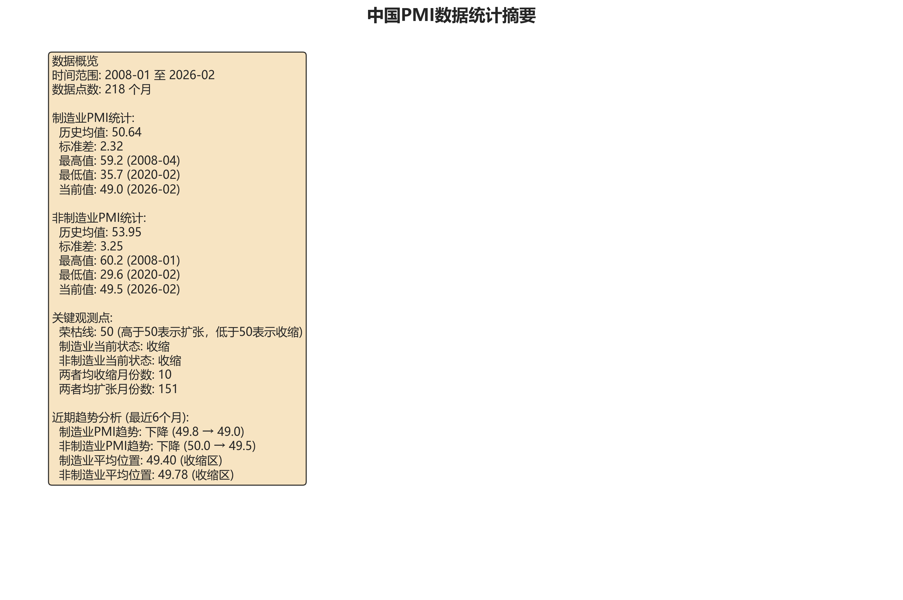 - 2020年2月:受新冠疫情影响,制造业PMI(35.7)和非制造业PMI(29.6)出现极端低值,属于已知重大外部冲击下的异常值,数据本身有效。