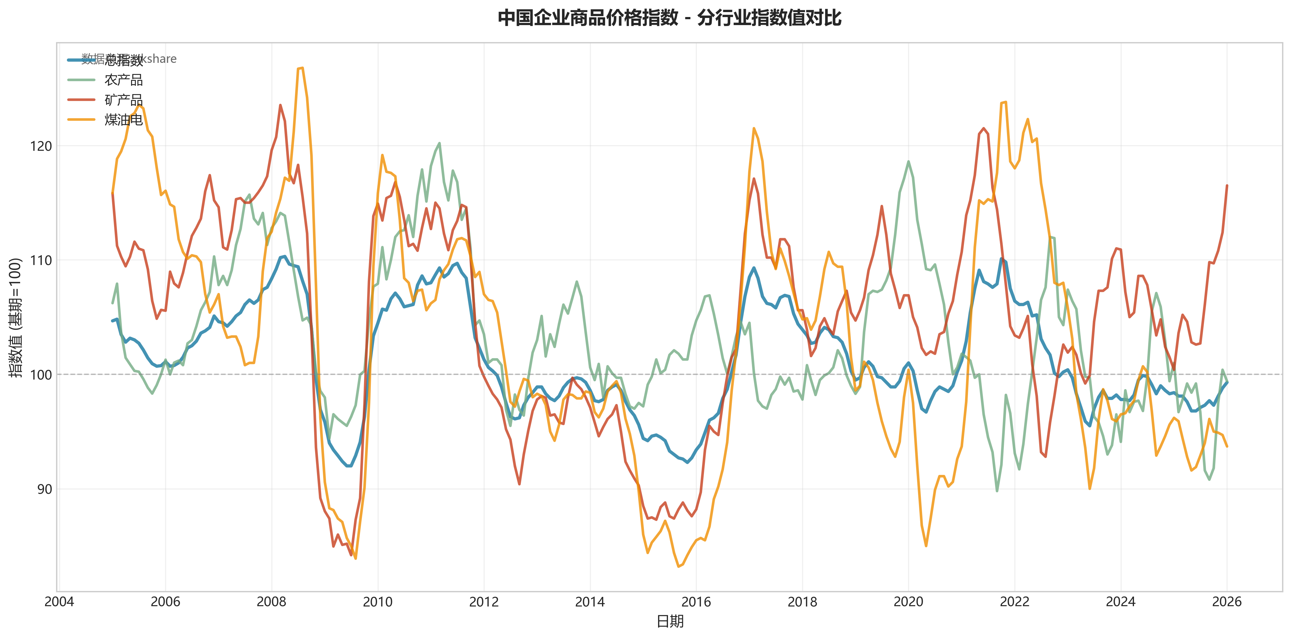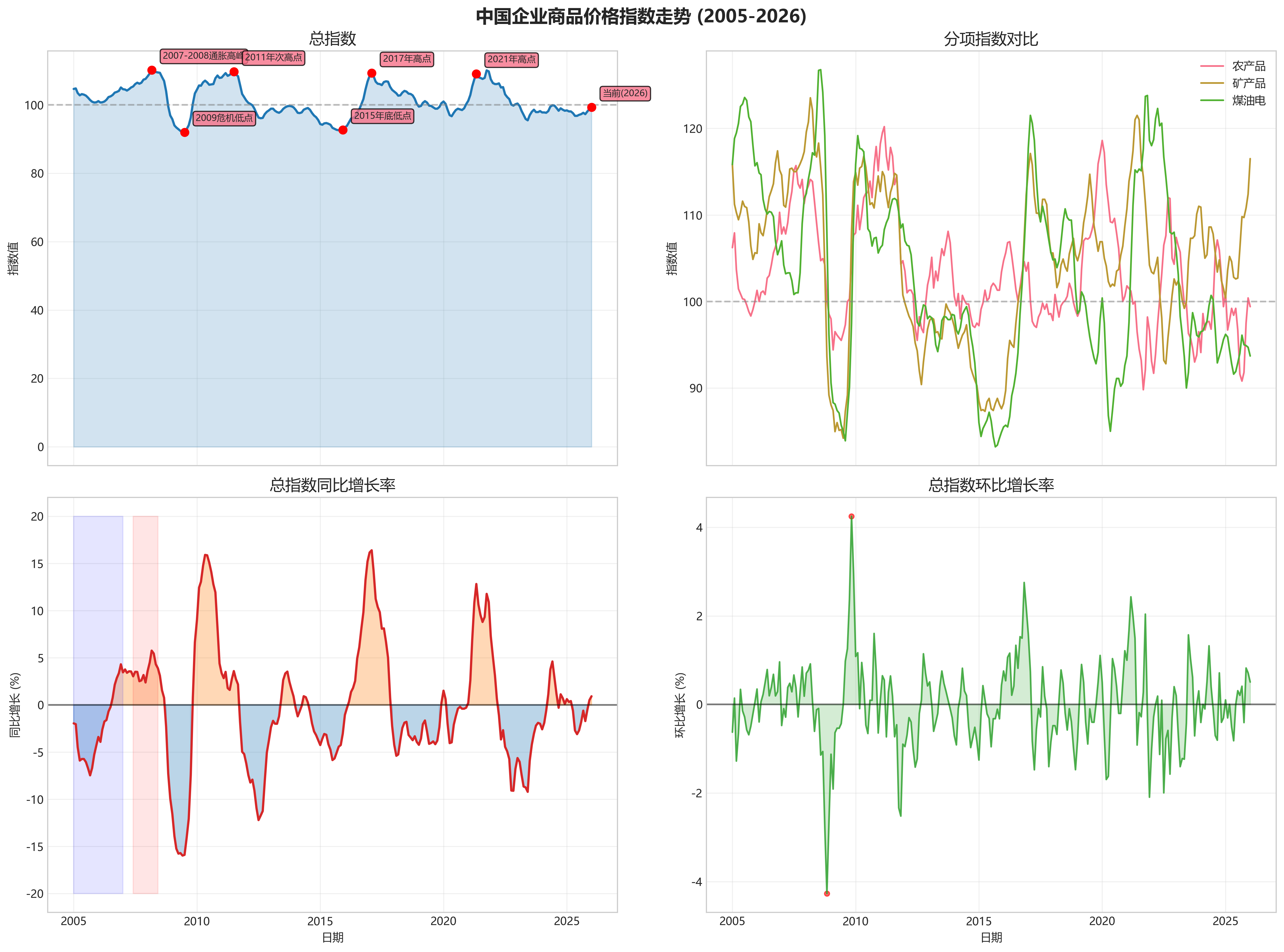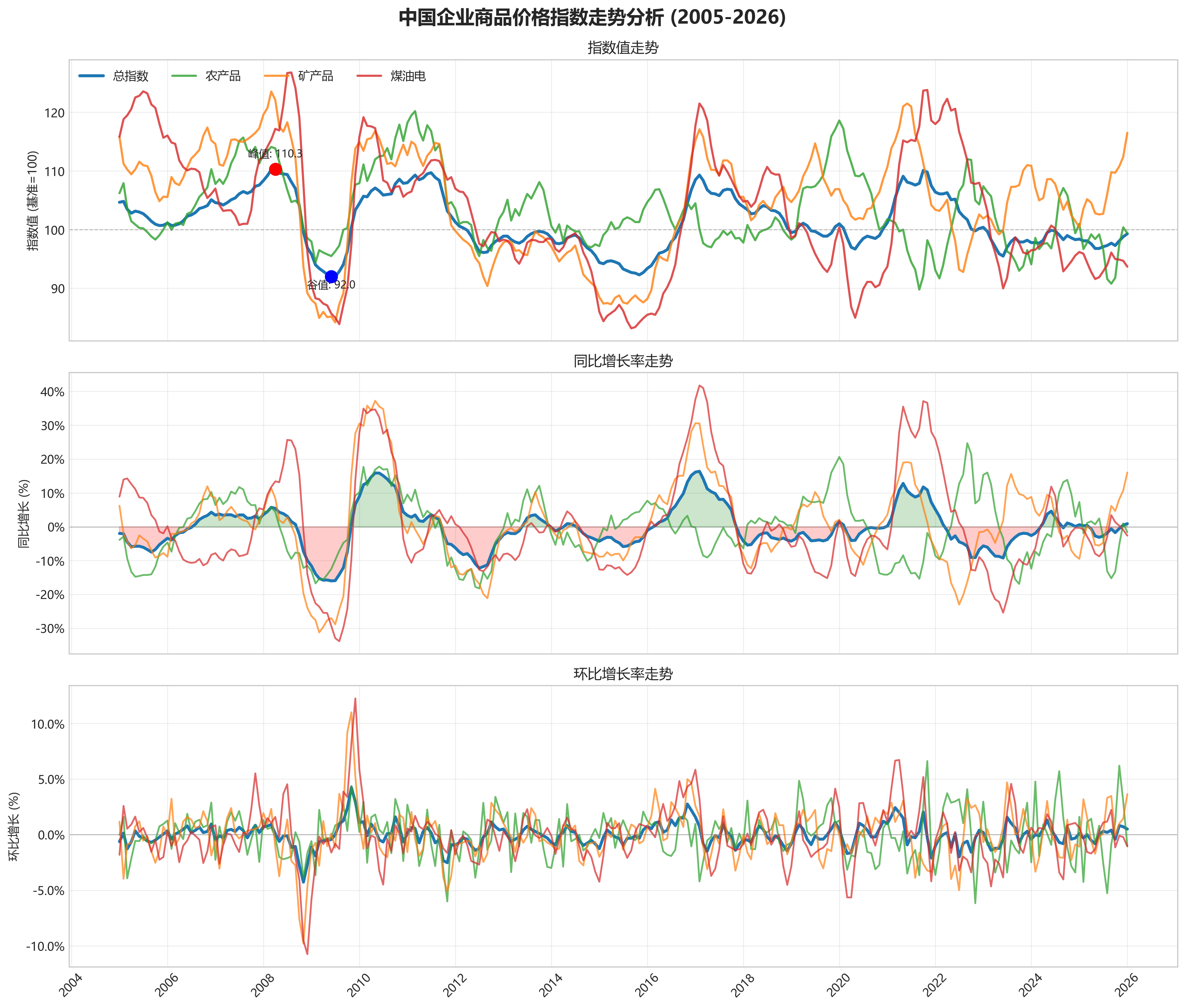 - 总指数:在2005-2026年的21年间,中国企业商品价格总指数呈现明显的周期性波动,但长期中枢相对稳定。指数值在2008年7月达到峰值(109.4),在2009年7月触及谷底(92.0),随后进入一轮长达数年的宽幅震荡。2016年下半年至2017年底,总指数经历了一轮强劲的上升周期,于2017年2月达到第二峰值(109.3)。此后指数震荡下行,2020年新冠疫情冲击下再次探底(2020年5月为96.7),随后在2021年出现显著反弹,但未能突破前高。2022年下半年以来,总指数再次进入下行通道,近期在98附近窄幅波动。