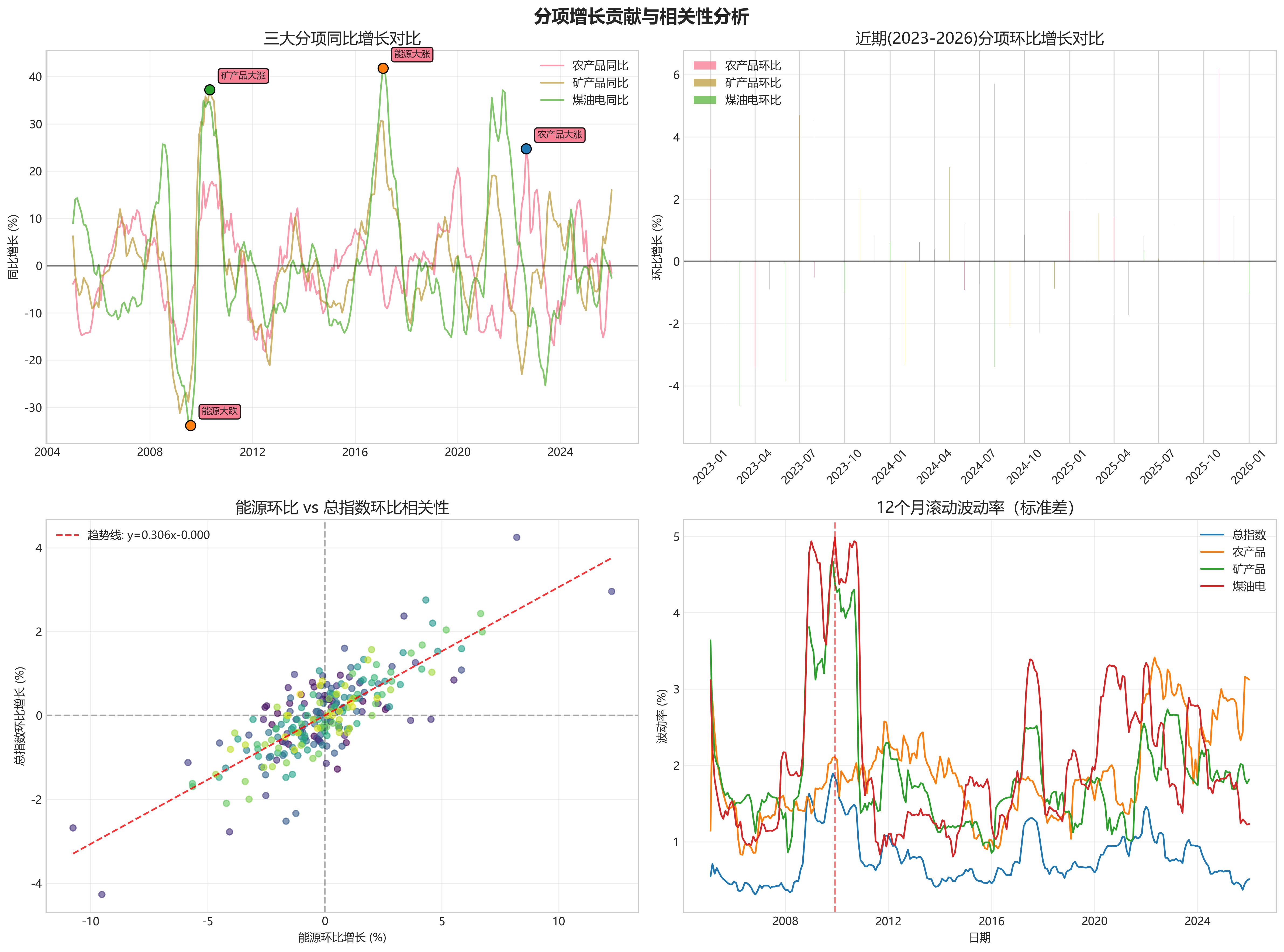 25.69%,而在2009年7月低至-32.91%;矿产品同比在2010年3月达35.83%,在2009年3月低至-31.22%。这主要受全球大宗商品周期、地缘政治、国内产能政策等影响。 - 波动相对较小:农产品同比波动虽也显著,但极端值出现的频率和幅度低于能源和矿产品。其波动更多受季节性、气候灾害、生猪周期等供给端因素驱动。