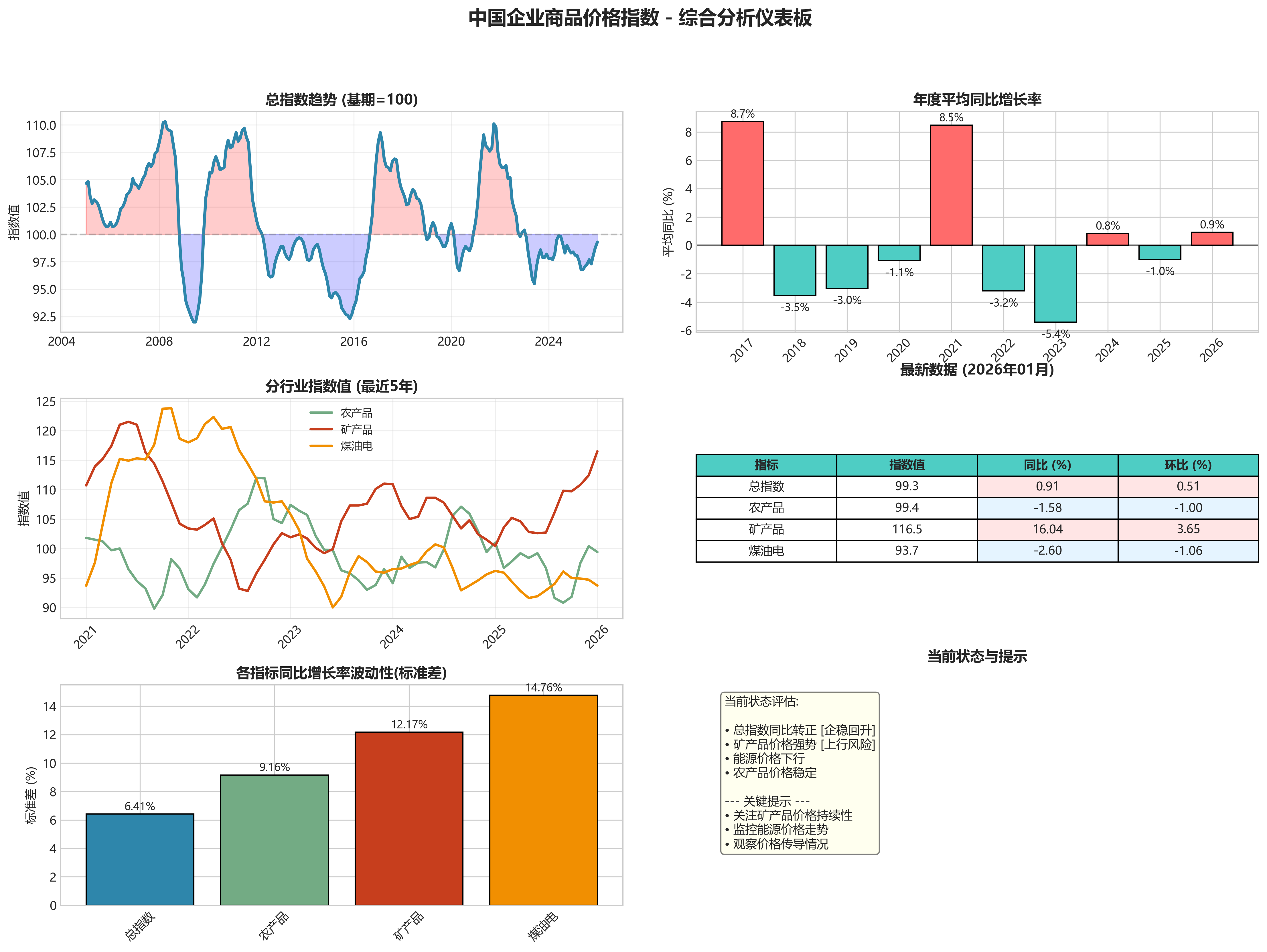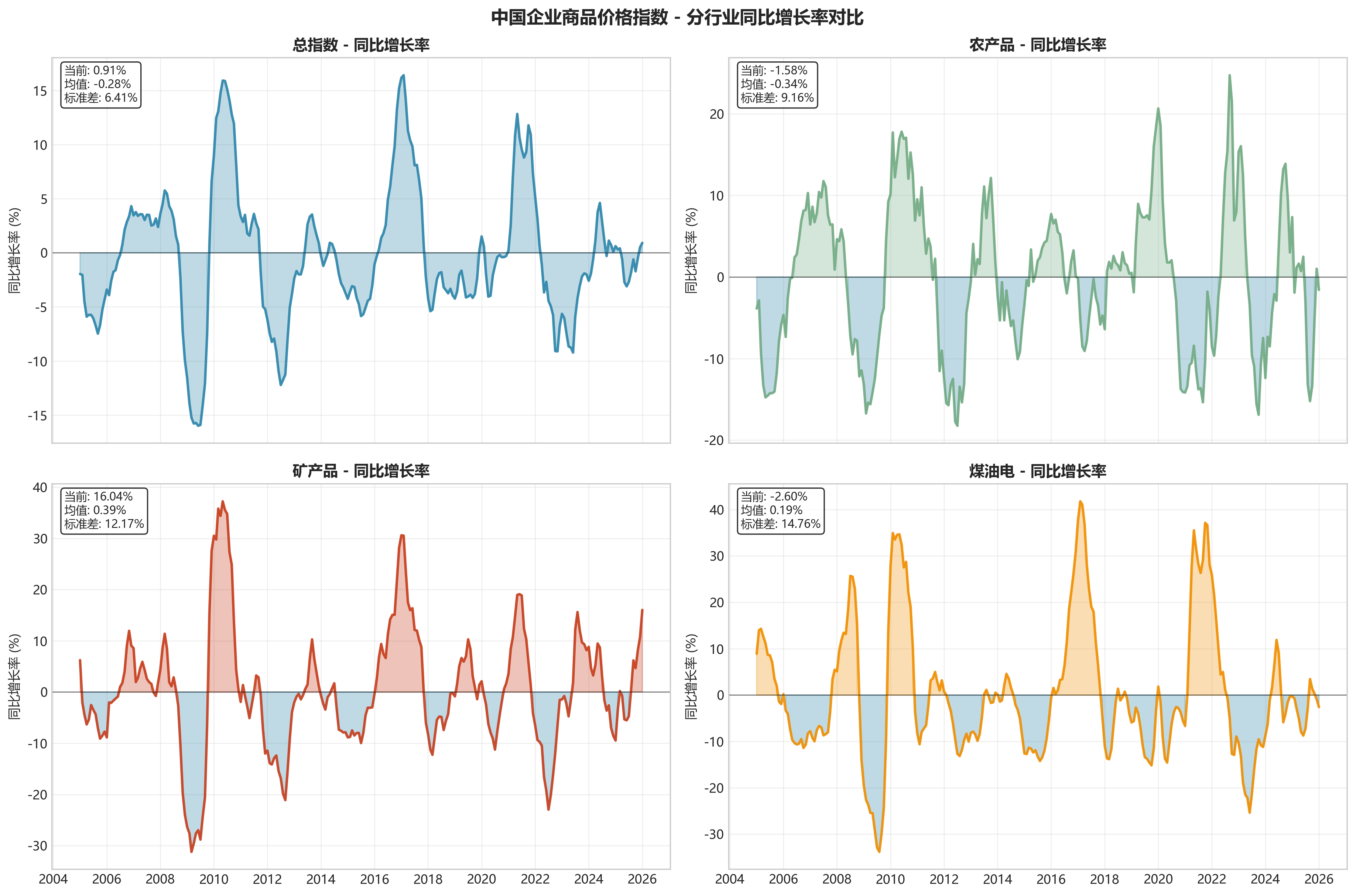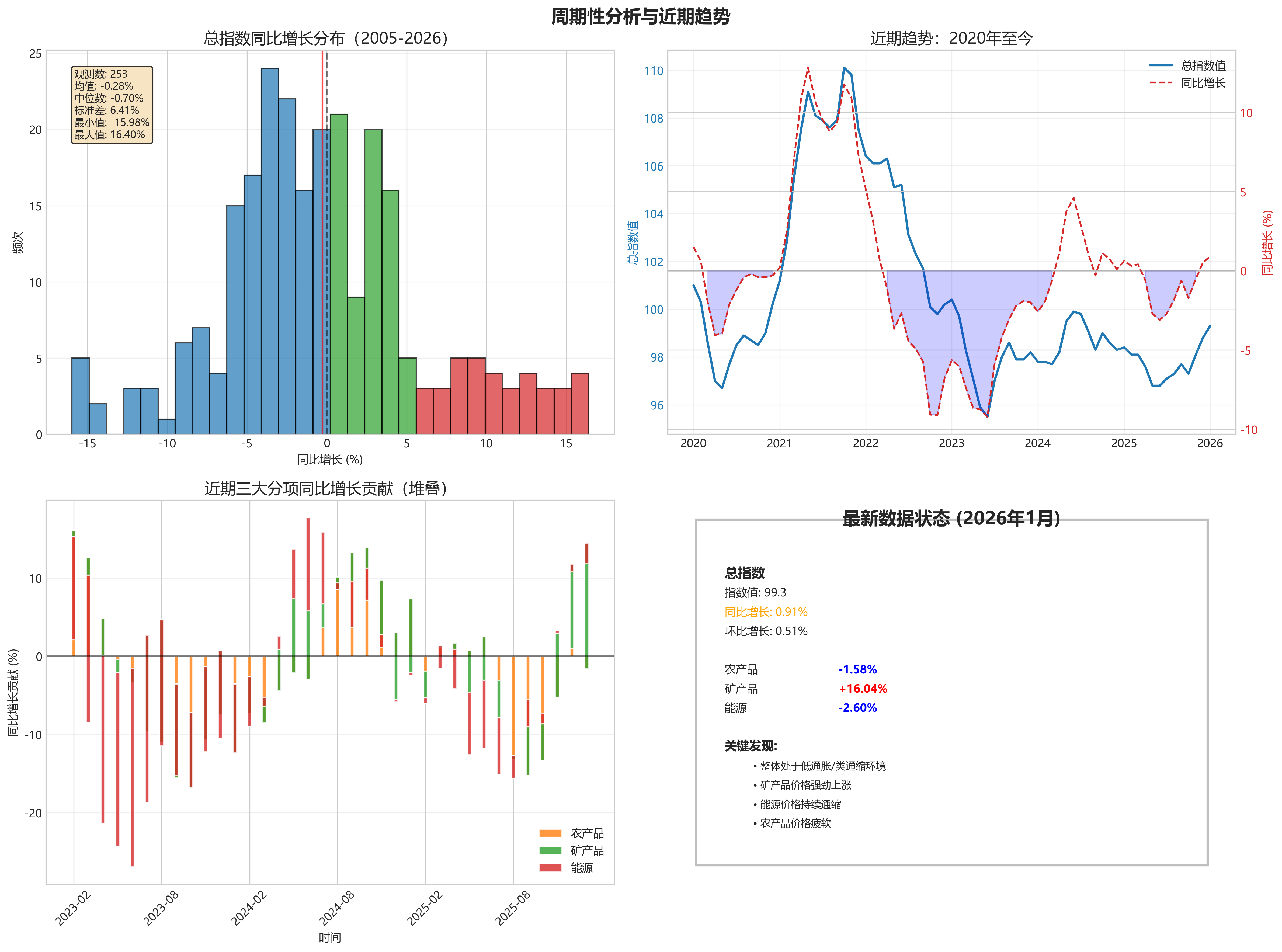 - 矿产品指数:波动较大,在2024年5-6月短暂反弹后再次回落,但2025年底至2026年初出现明显反弹(2026年1月同比+16.0%),需关注其持续性。