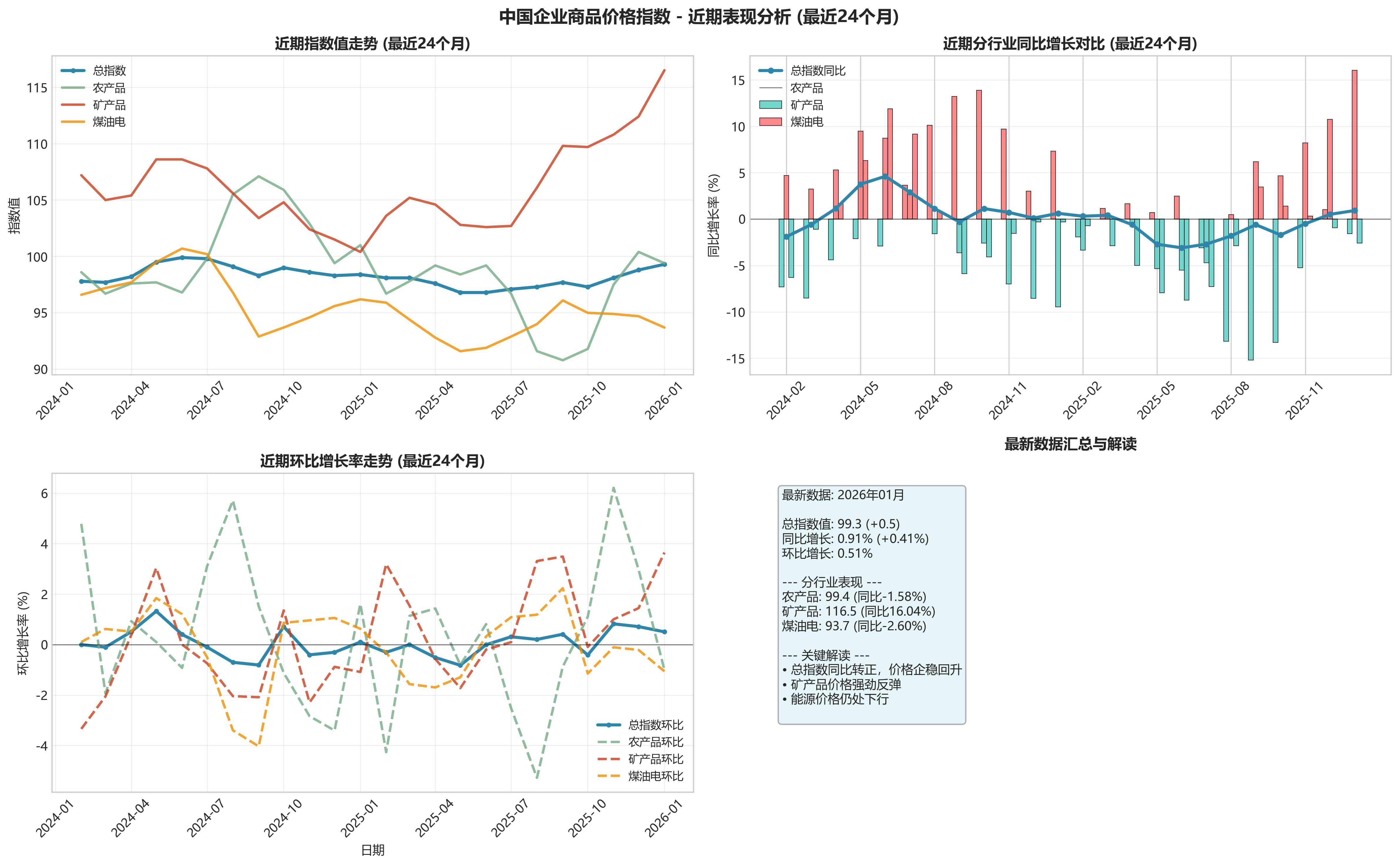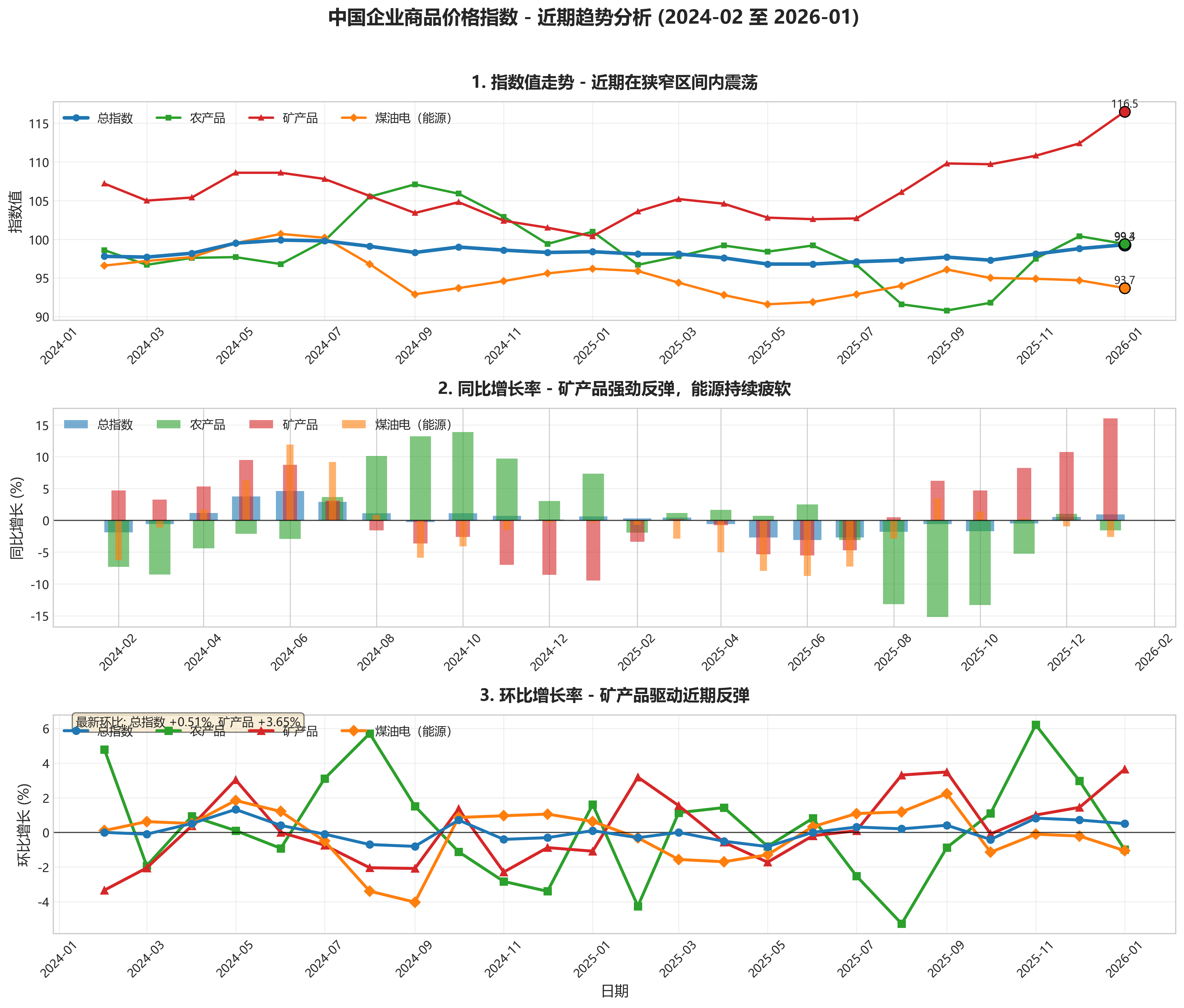- 近期(2025年12月-2026年1月):总指数环比增长0.51%。其中,矿产品指数环比大涨3.65%,是拉动总指数环比转正的最主要动力;农产品环比下跌0.99%,形成拖累;能源指数环比下跌1.06%,亦构成压制。