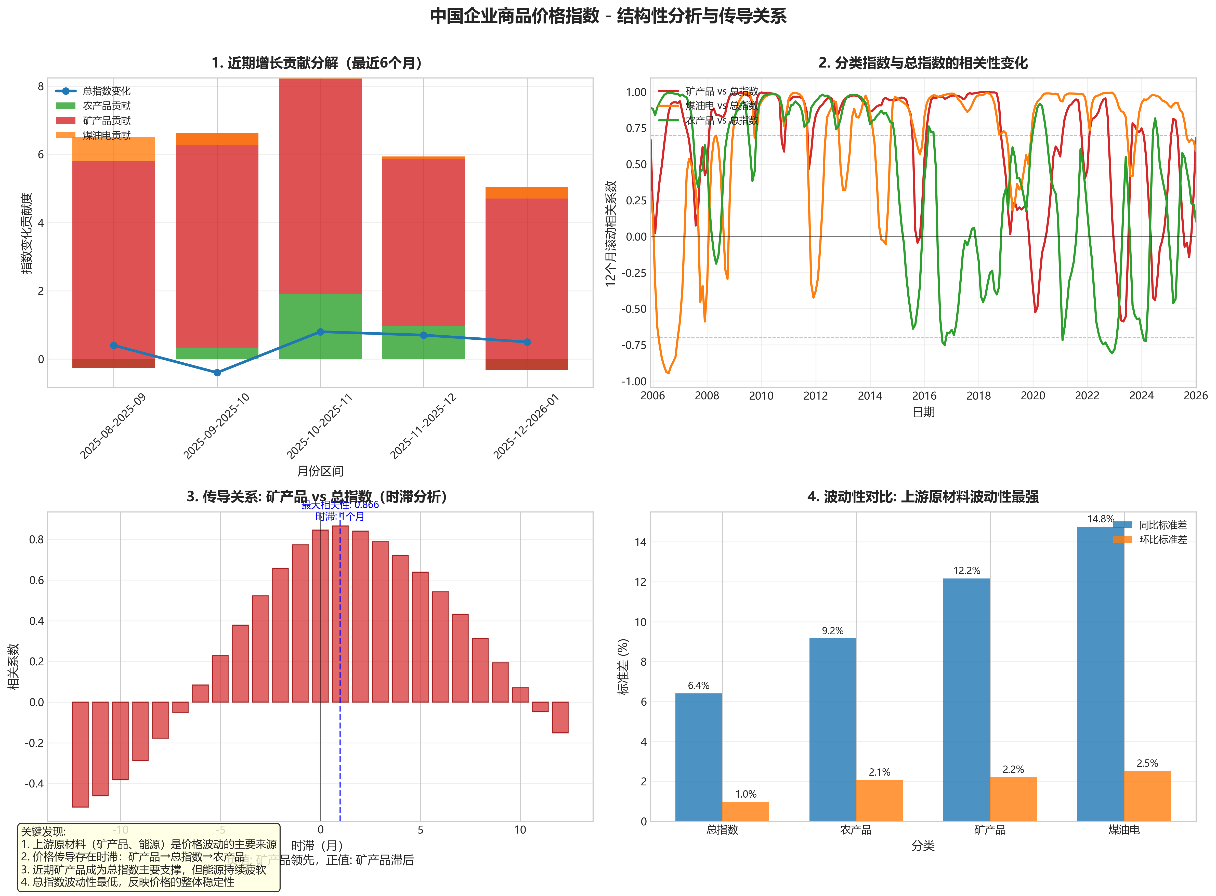 3.65%,贡献最大。能源环比-1.06%,是主要抑制项。农产品环比-1.00%,亦为拖累。 - 当前结构特征:呈现“矿产品强、能源弱、农产品稳中偏弱”的分化格局。矿产品价格的强劲反弹是当前价格体系的主要上行风险点。