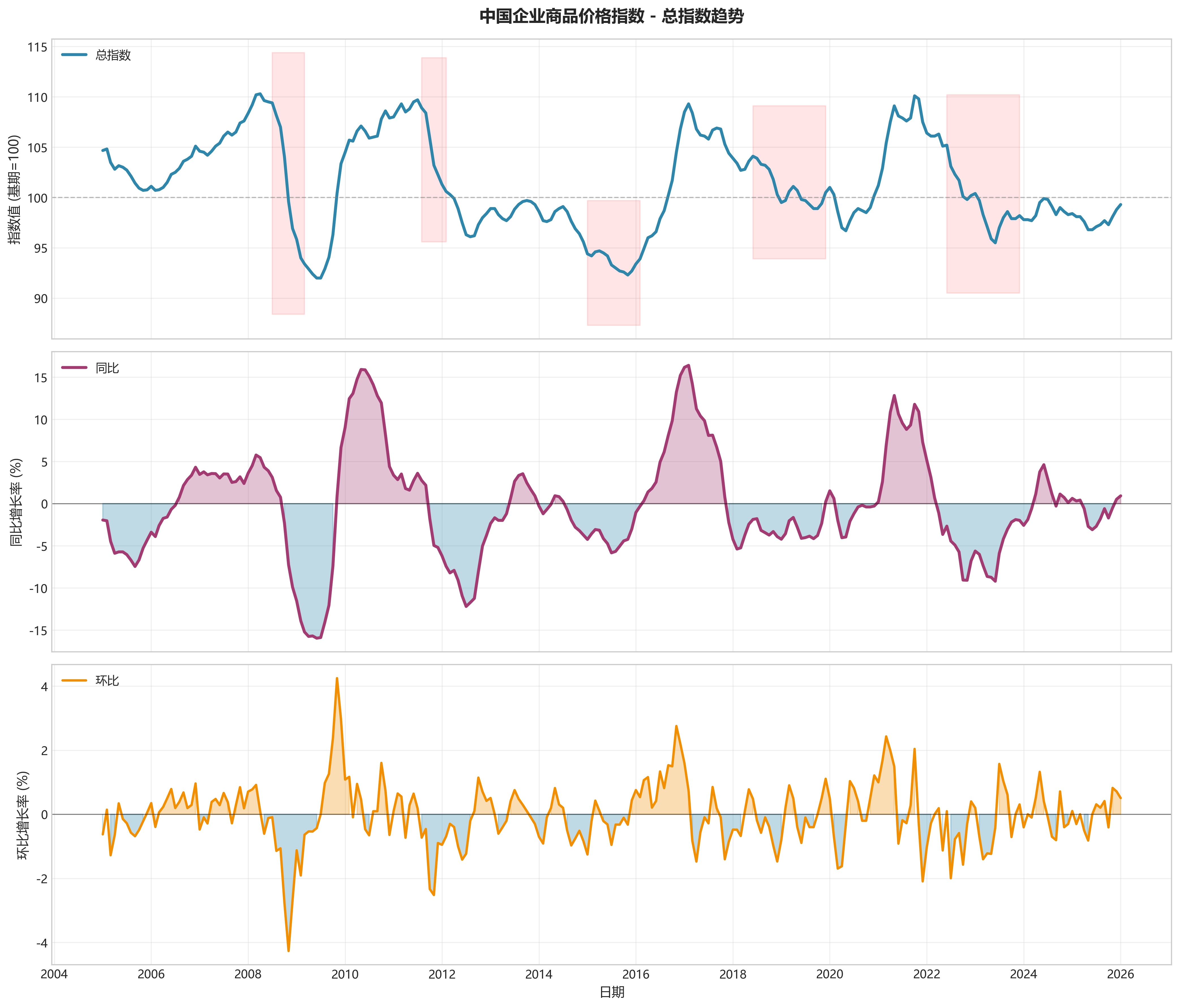 - 数据源与范围:数据来源于akshare,指标为“中国企业商品价格指数(多参数)”。时间跨度为2005年1月至2026年1月,共253个月度数据点,数据完整覆盖该期间。