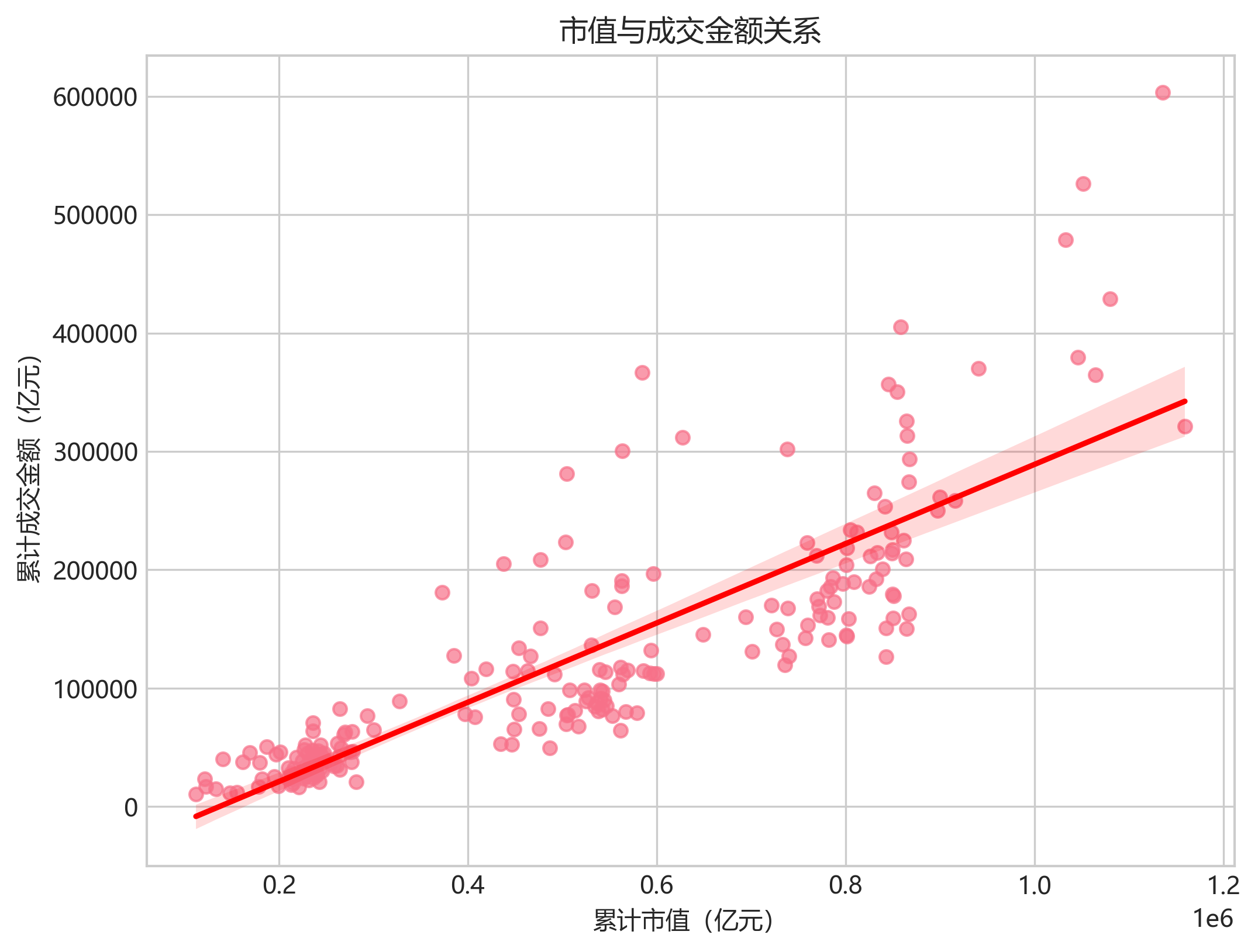 - 皮尔逊/斯皮尔曼 相关系数:市值 ↔ 成交额、指数振幅、宏观 GDP(如有)。