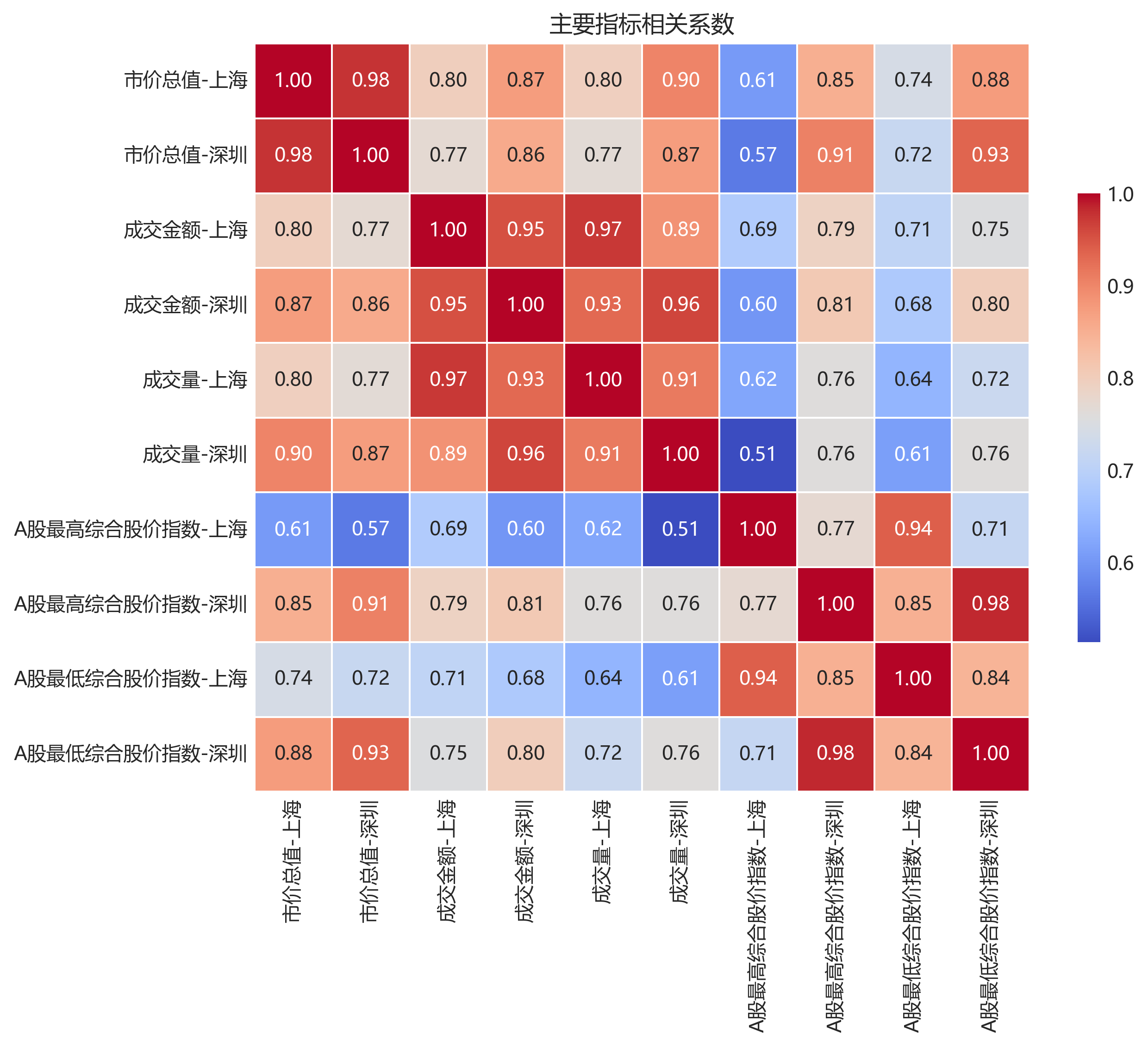 | 市价总值‑深圳 ↔ 成交量‑深圳 | 0.75 | 同上,相关性略弱于上海。 |