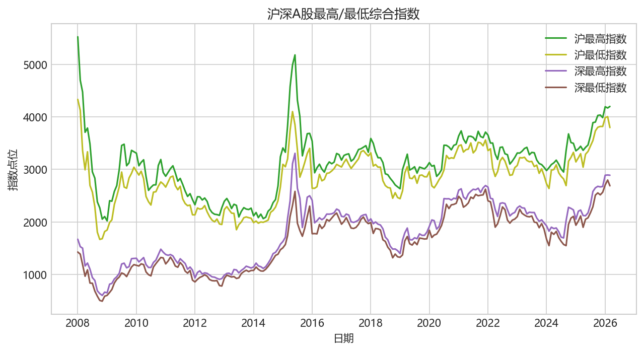 | 价格波动 | A股最高综合股价指数‑上海 / A股最高综合股价指数‑深圳、A股最低综合股价指数‑上海 / A股最低综合股价指数‑深圳 |
