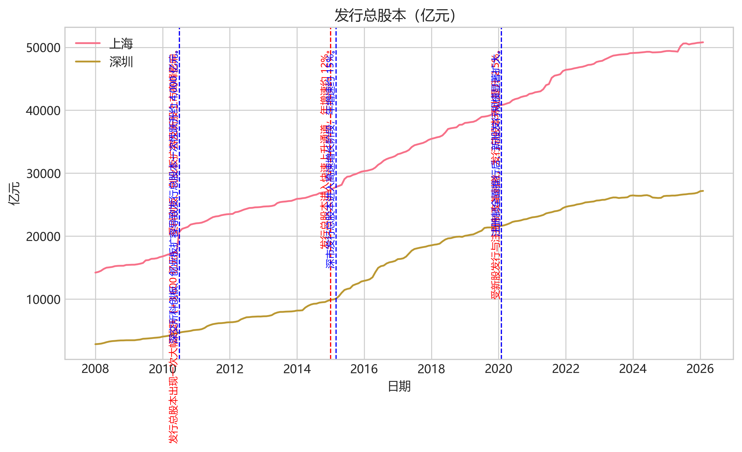 趋势:上海的发行总股本占比逐年下降,深圳从 18% 上升至约 30%,显示深圳市场(创业板、科创板)在资本形成中的比重持续提升。