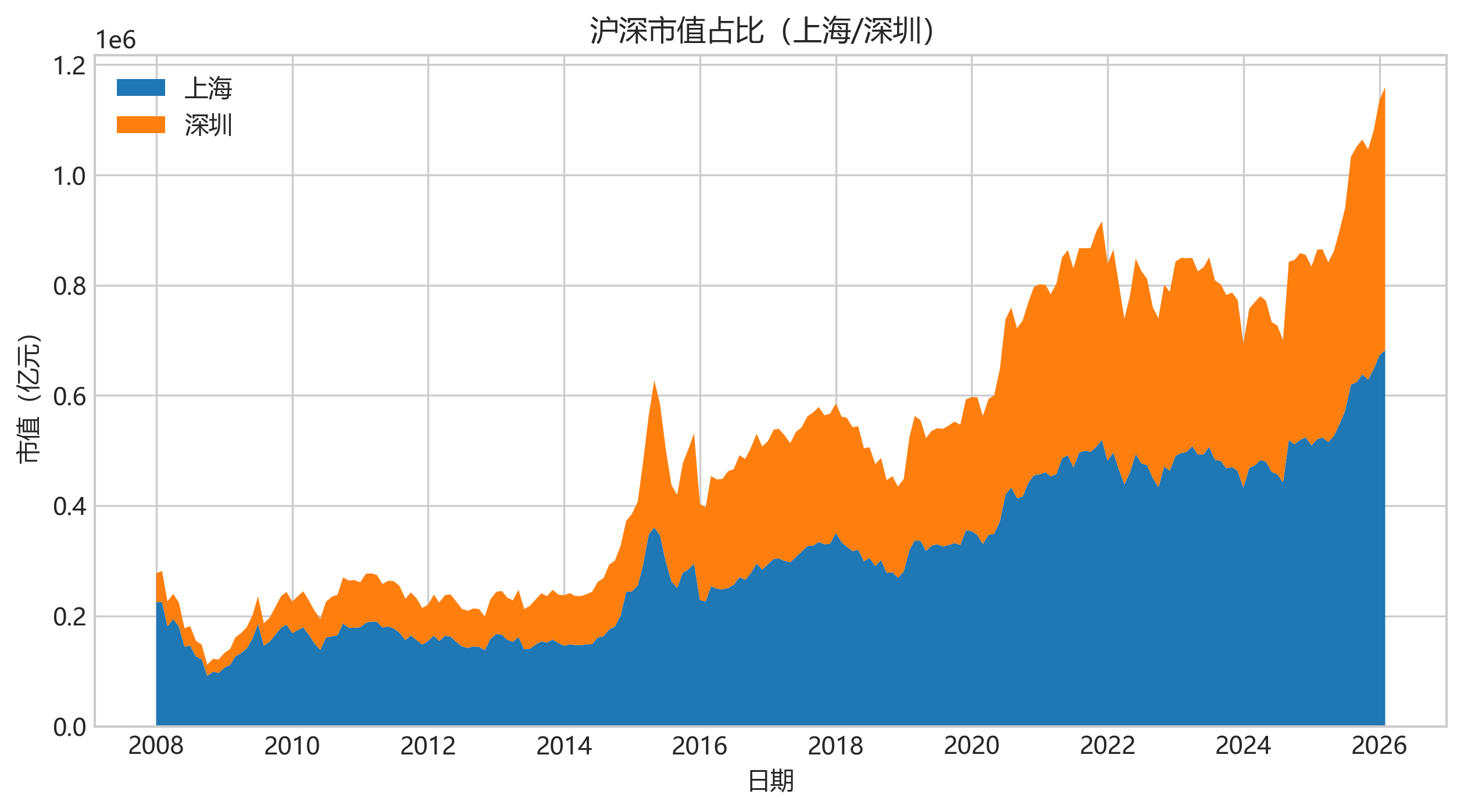 - 绘制 沪深市值占比(饼图或面积图)随时间的变化。
