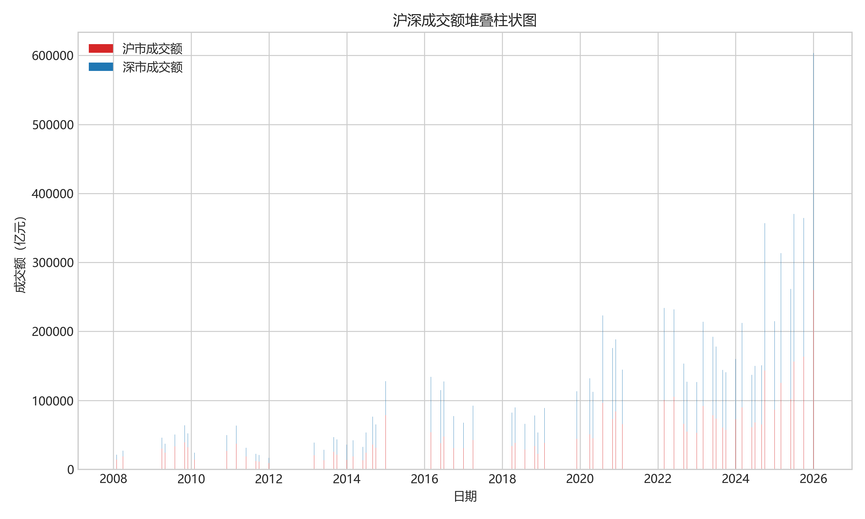 - 用 堆叠柱状图展示 成交额/量 在沪深两市的分布。