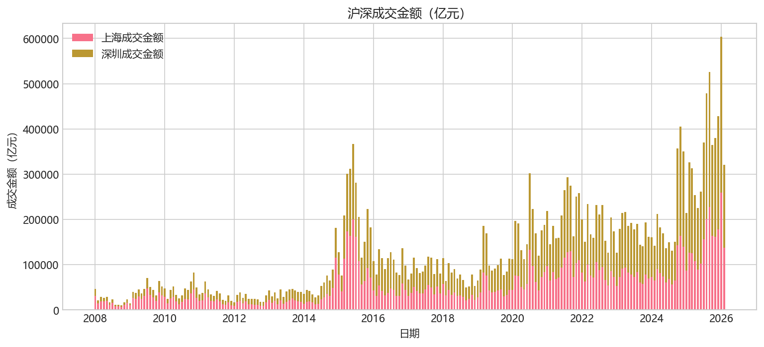 - 时间序列折线:市值、成交额、成交量(沪深双轴)。